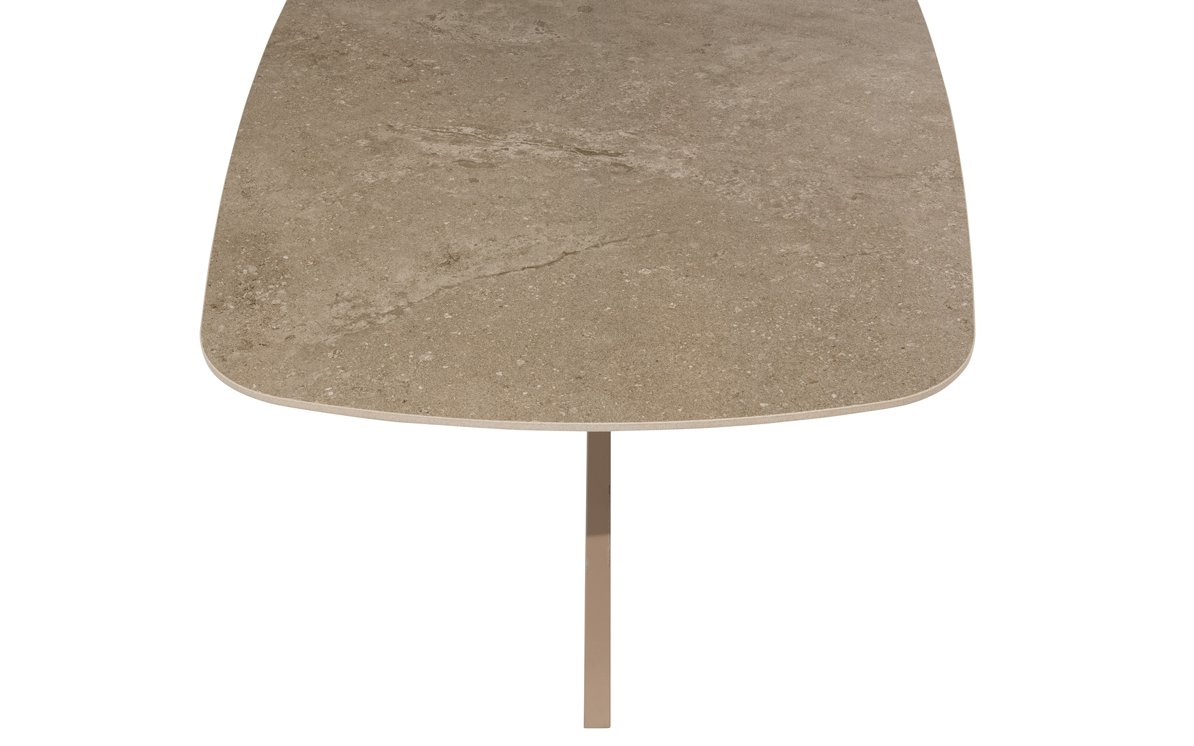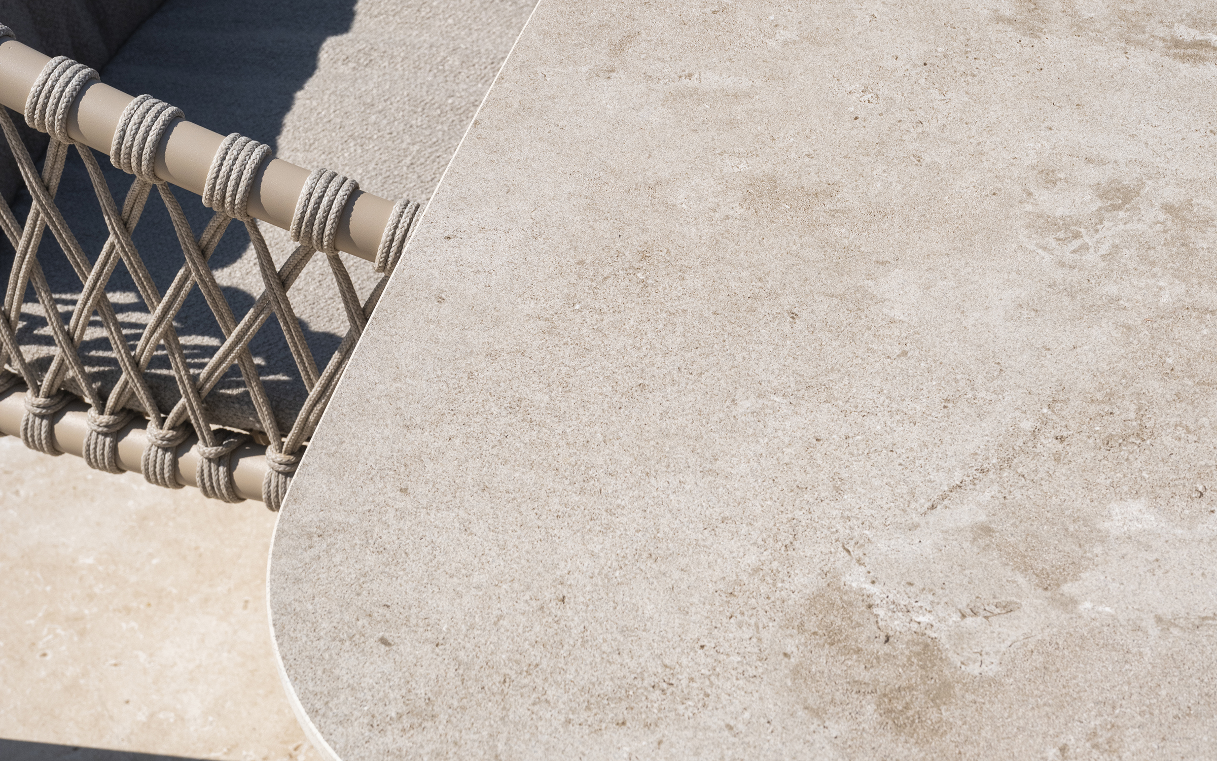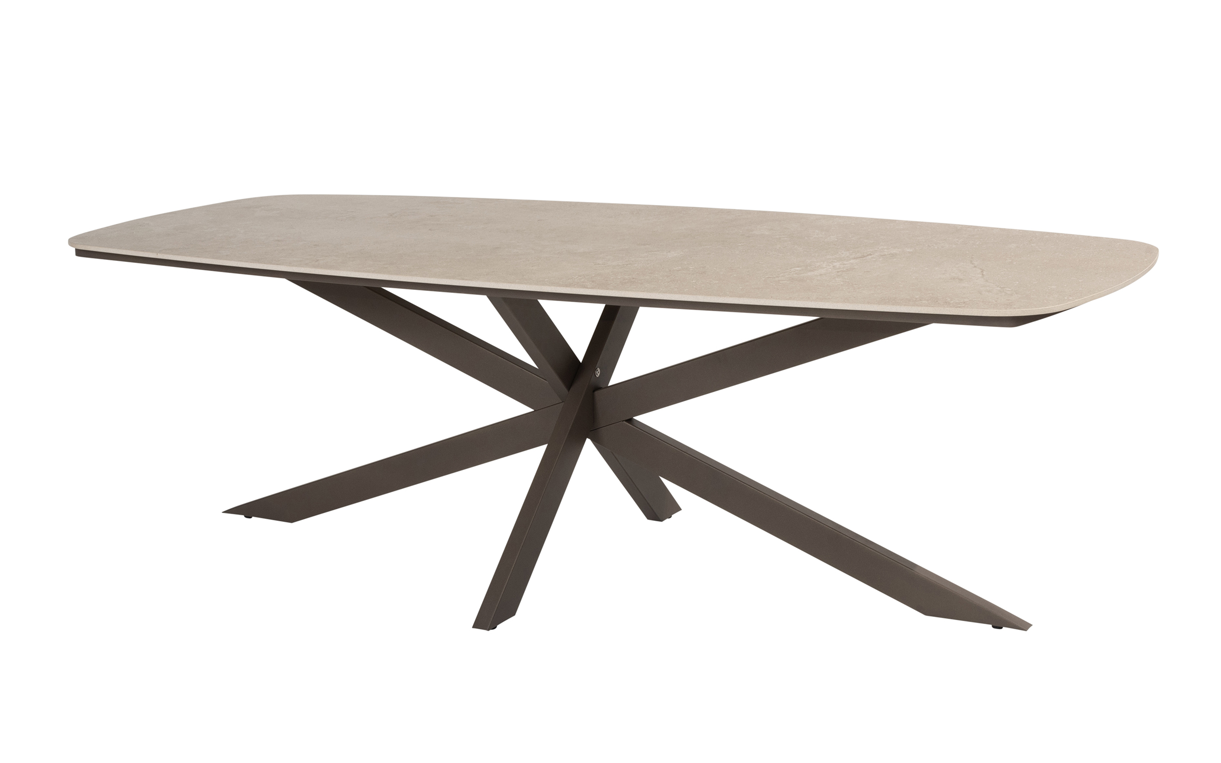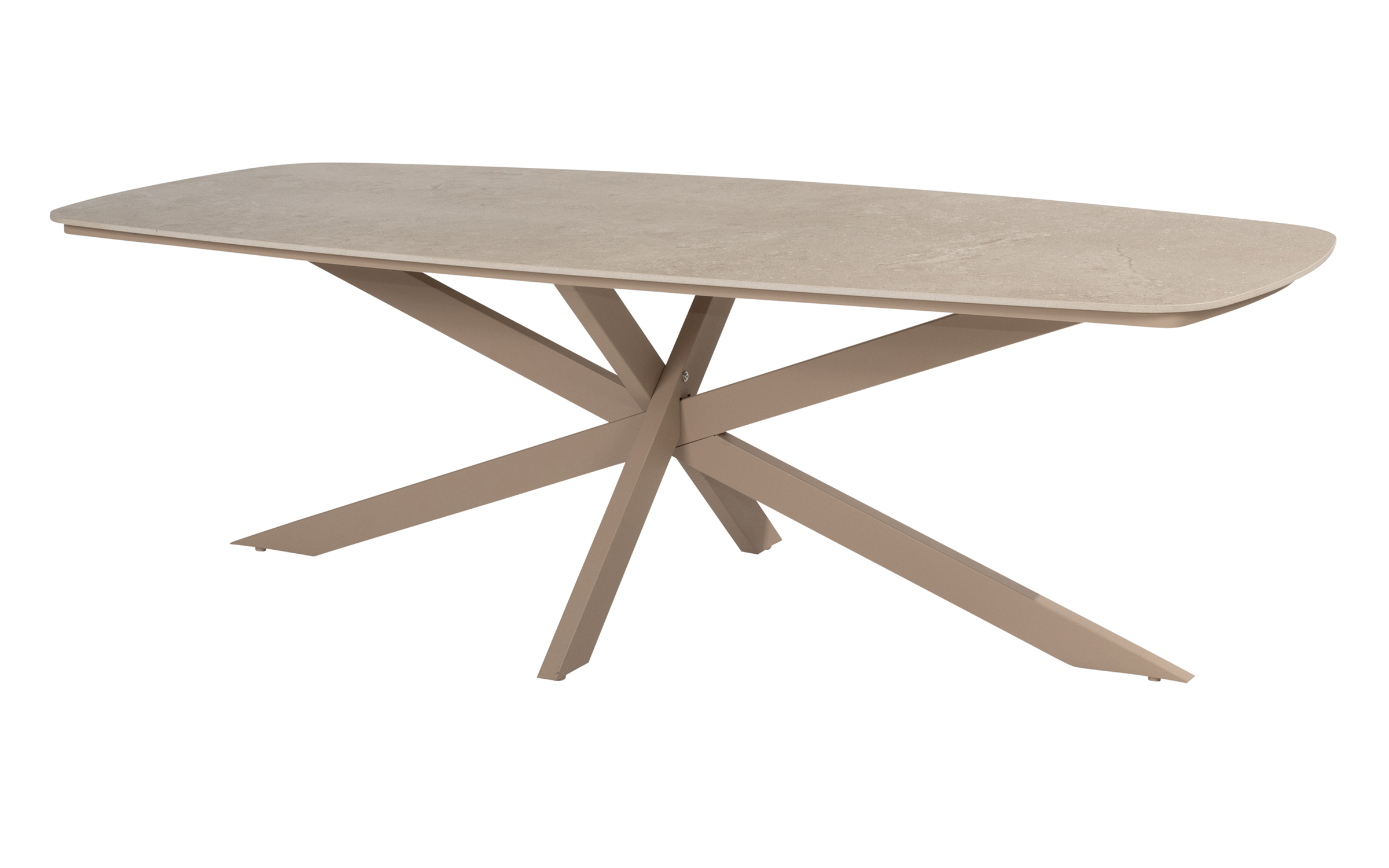 Blat w kolorze szarobeżowym. Podstawa wykonana jest ze stali nierdzewnej (RVS) i pokryta powłoką proszkową, dzięki czemu jest odporna na warunki atmosferyczne.