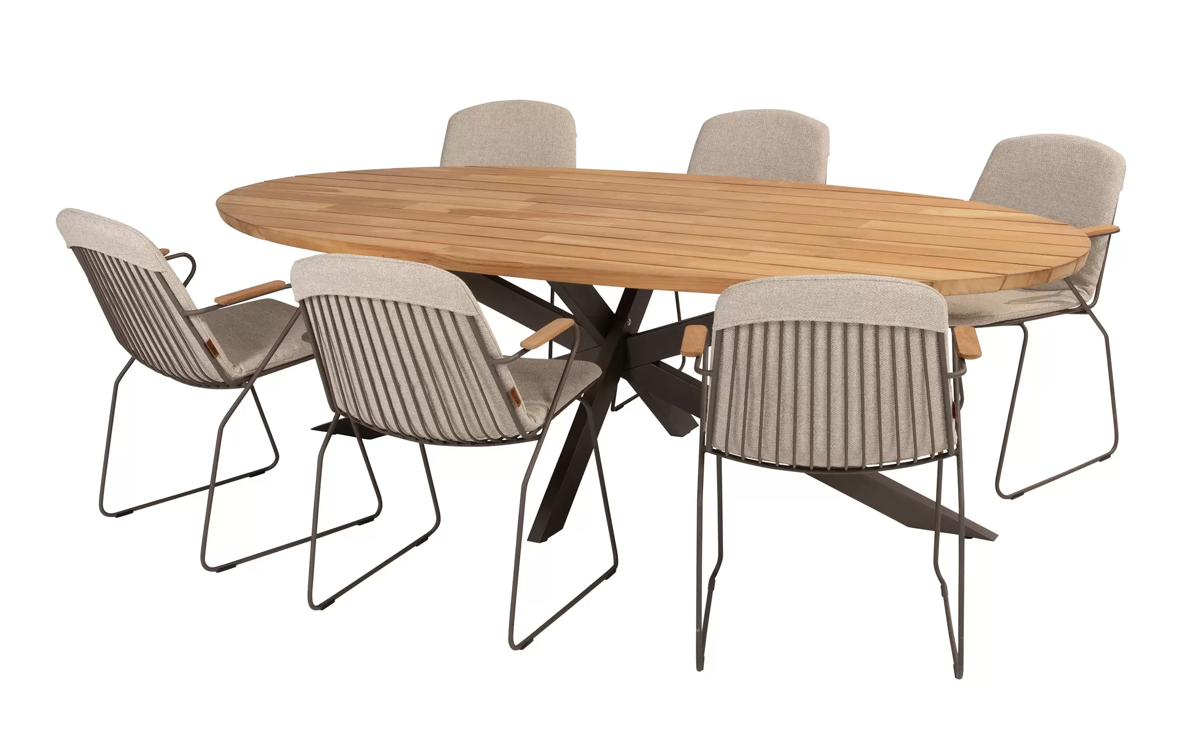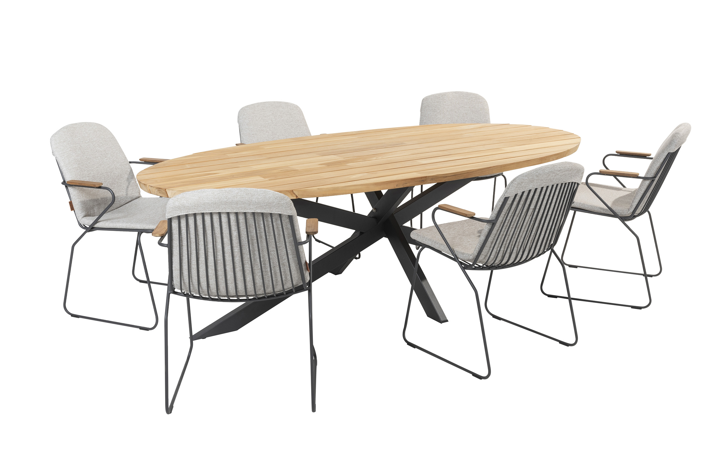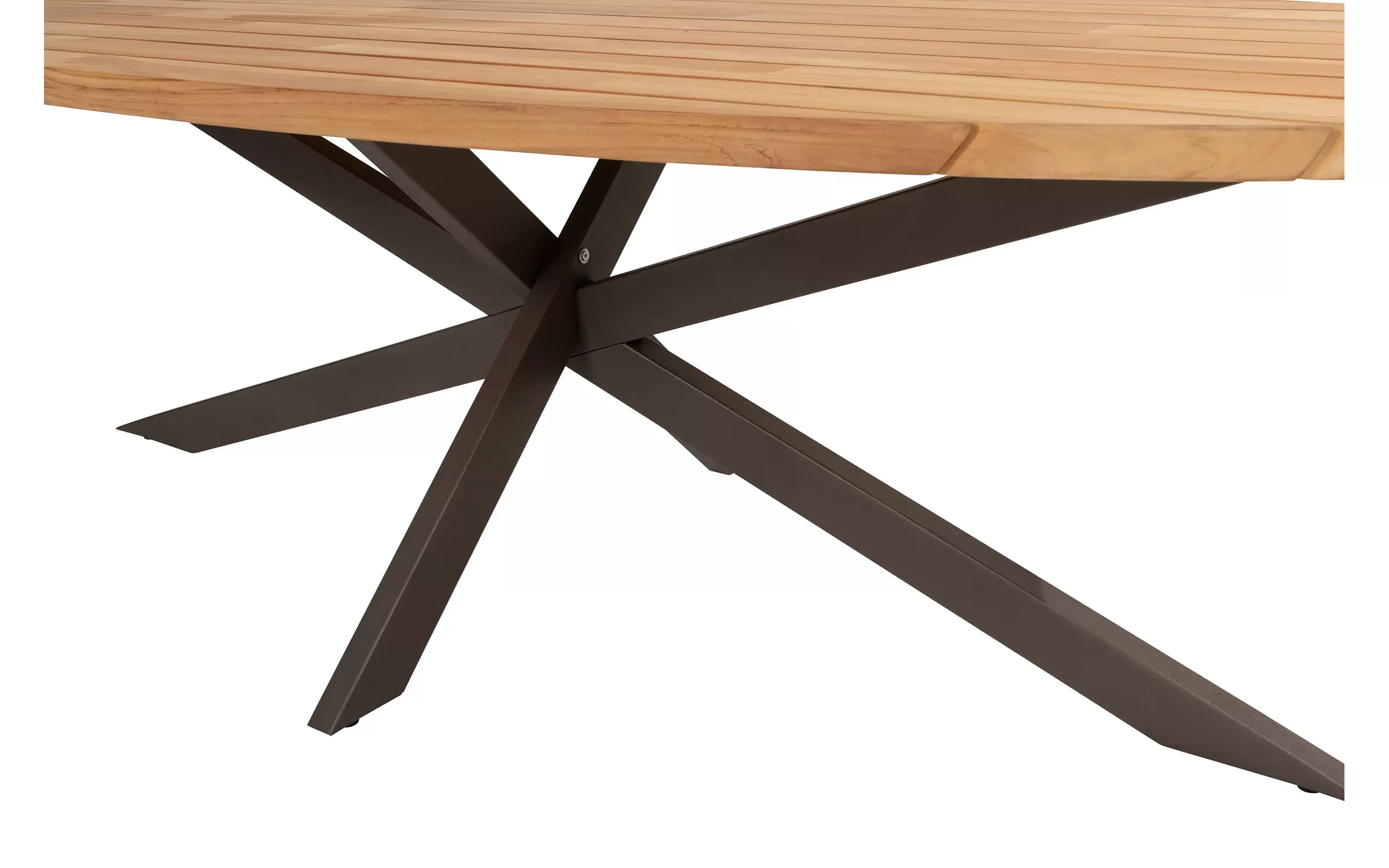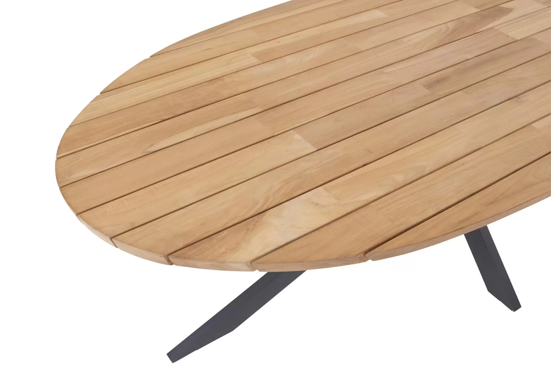 Stylowy i solidny stół jadalny PRADO Ovale Taste by 4 Seasons ma podstawę z aluminium w kolorze antracytowym i blat owalny z drewna tekowego.
