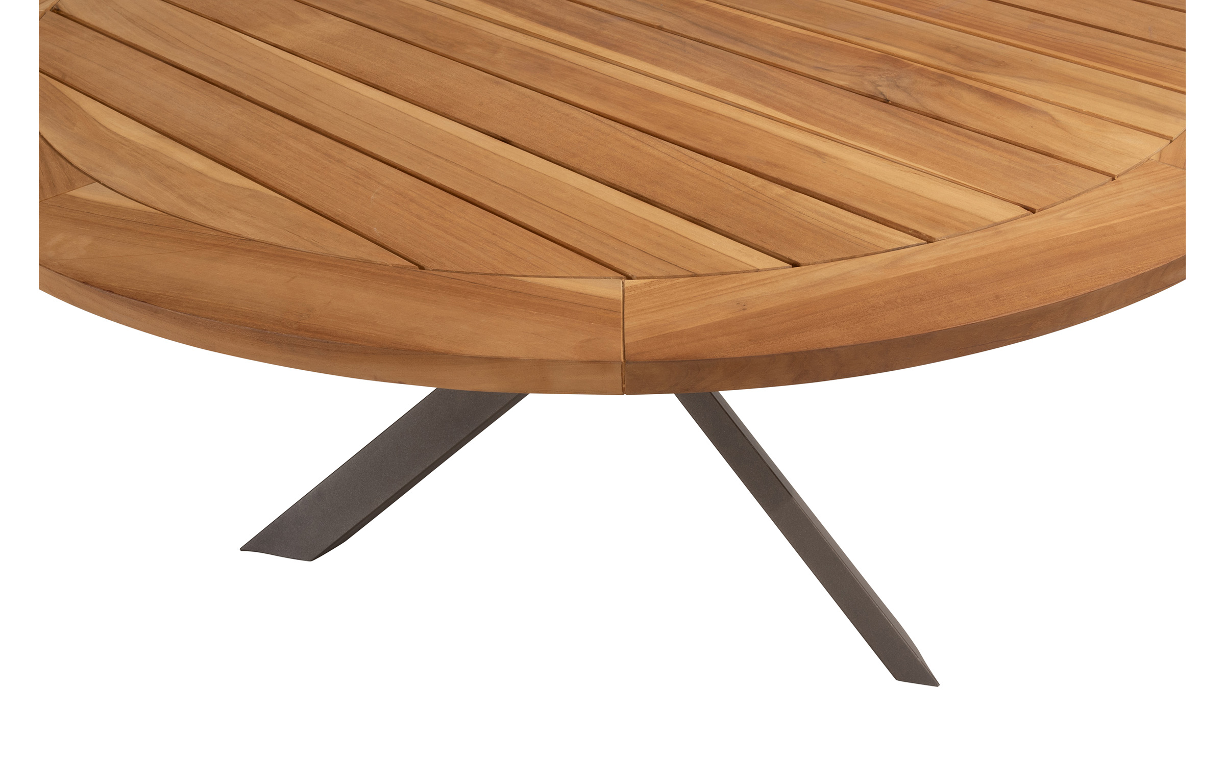 Stół ma podstawę z aluminium w kolorze antracytowym i blat z drewna tekowego w kolorze naturalnym.