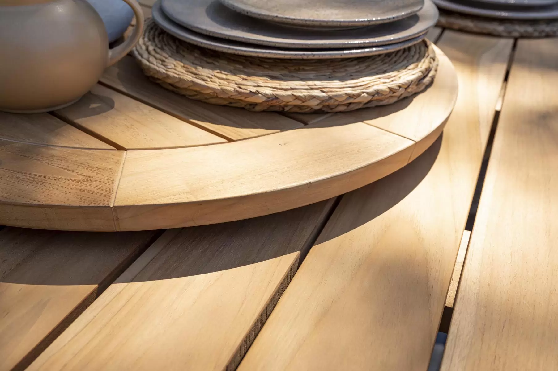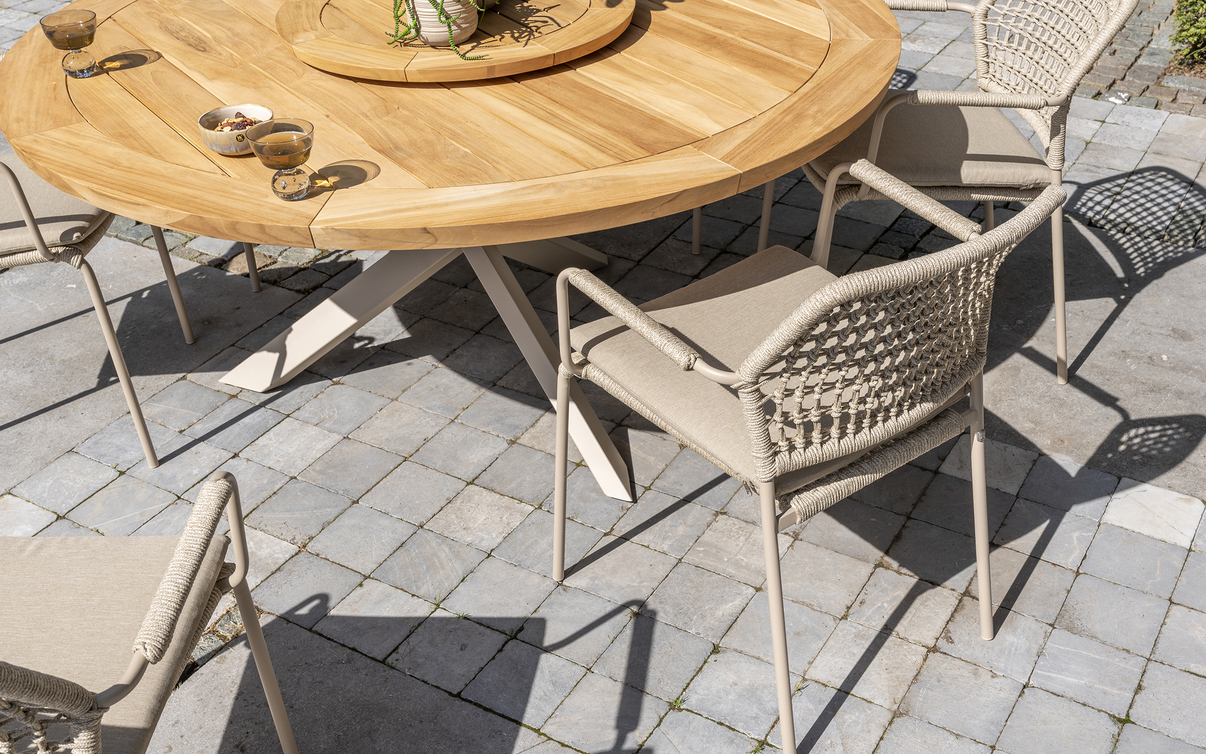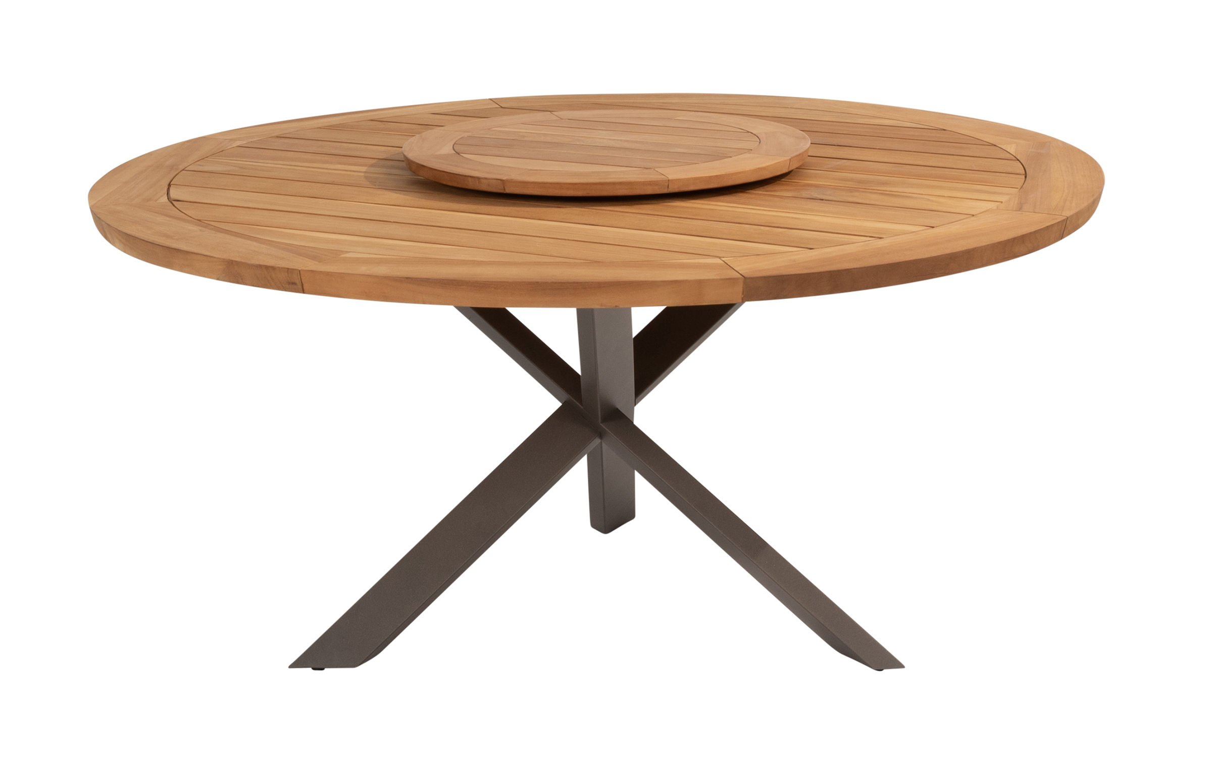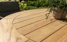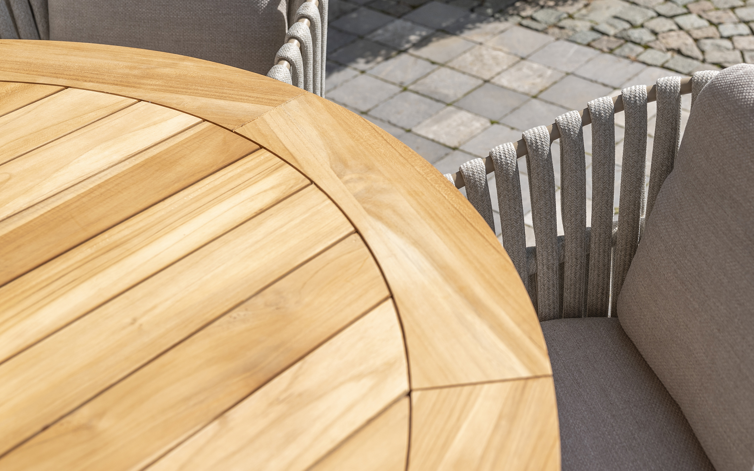 Stół ma podstawę z aluminium malowanego proszkowo lub teakową oraz blat z drewna tekowego w kolorze naturalnym o średnicy 160 cm.