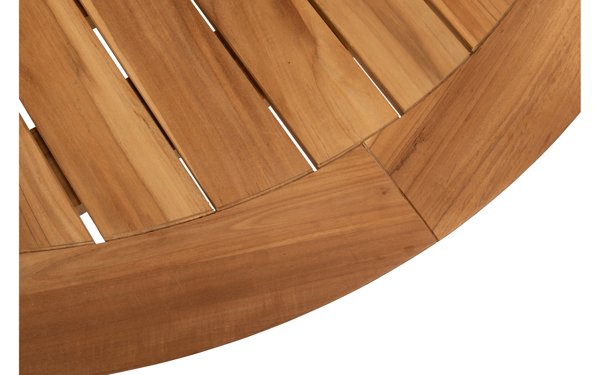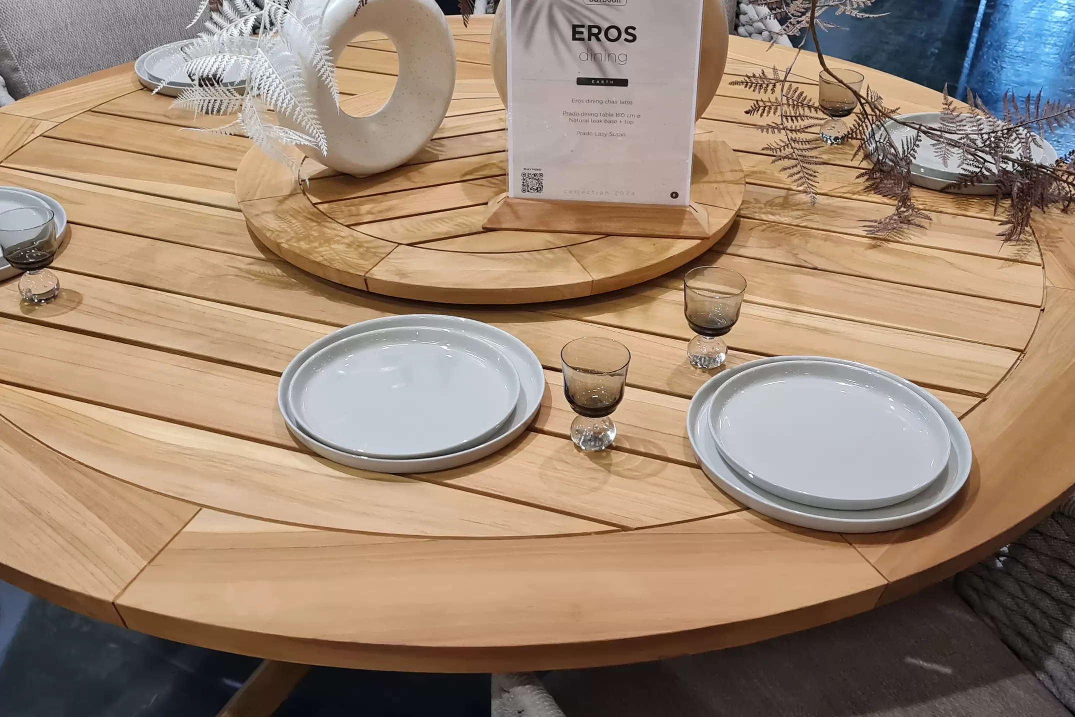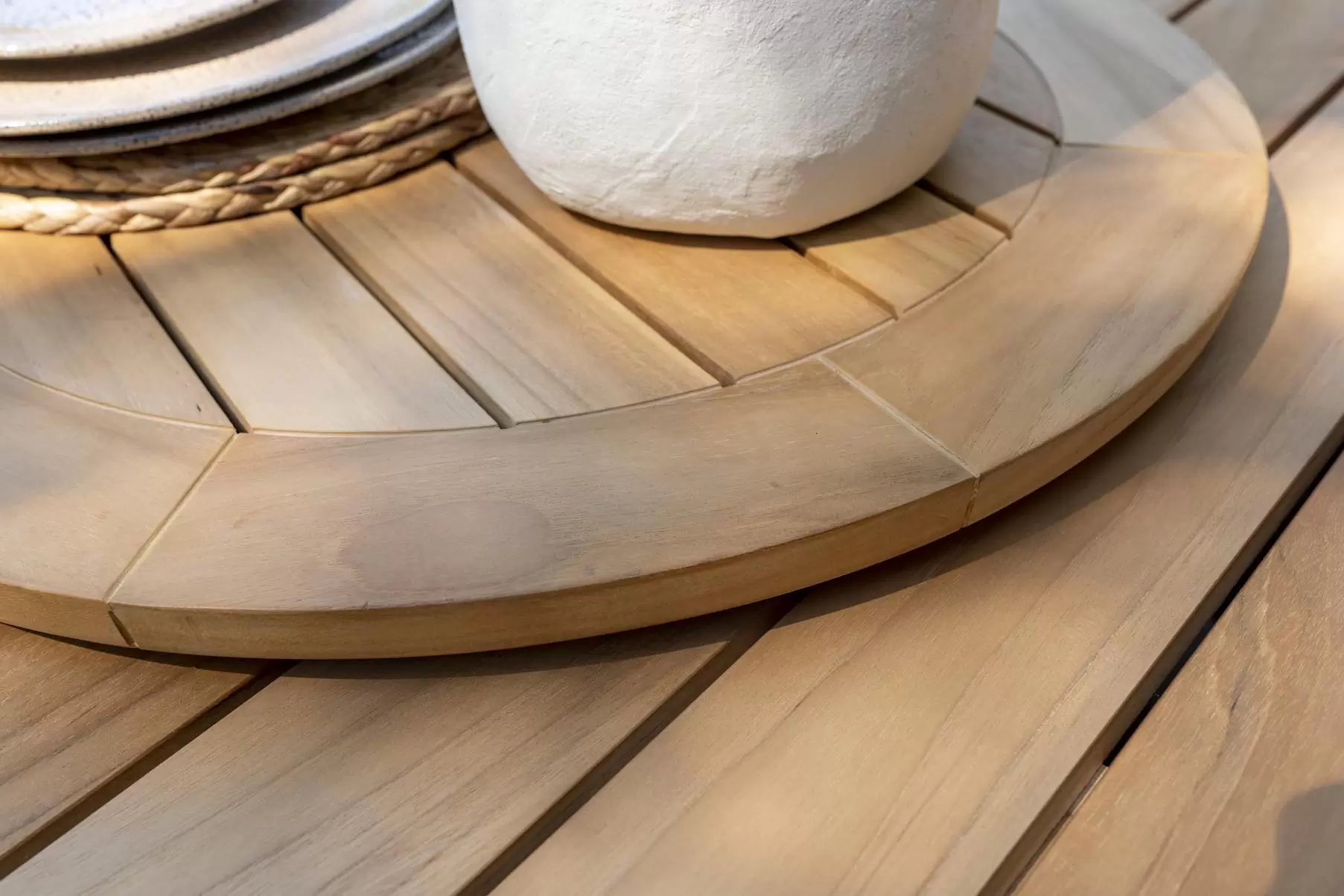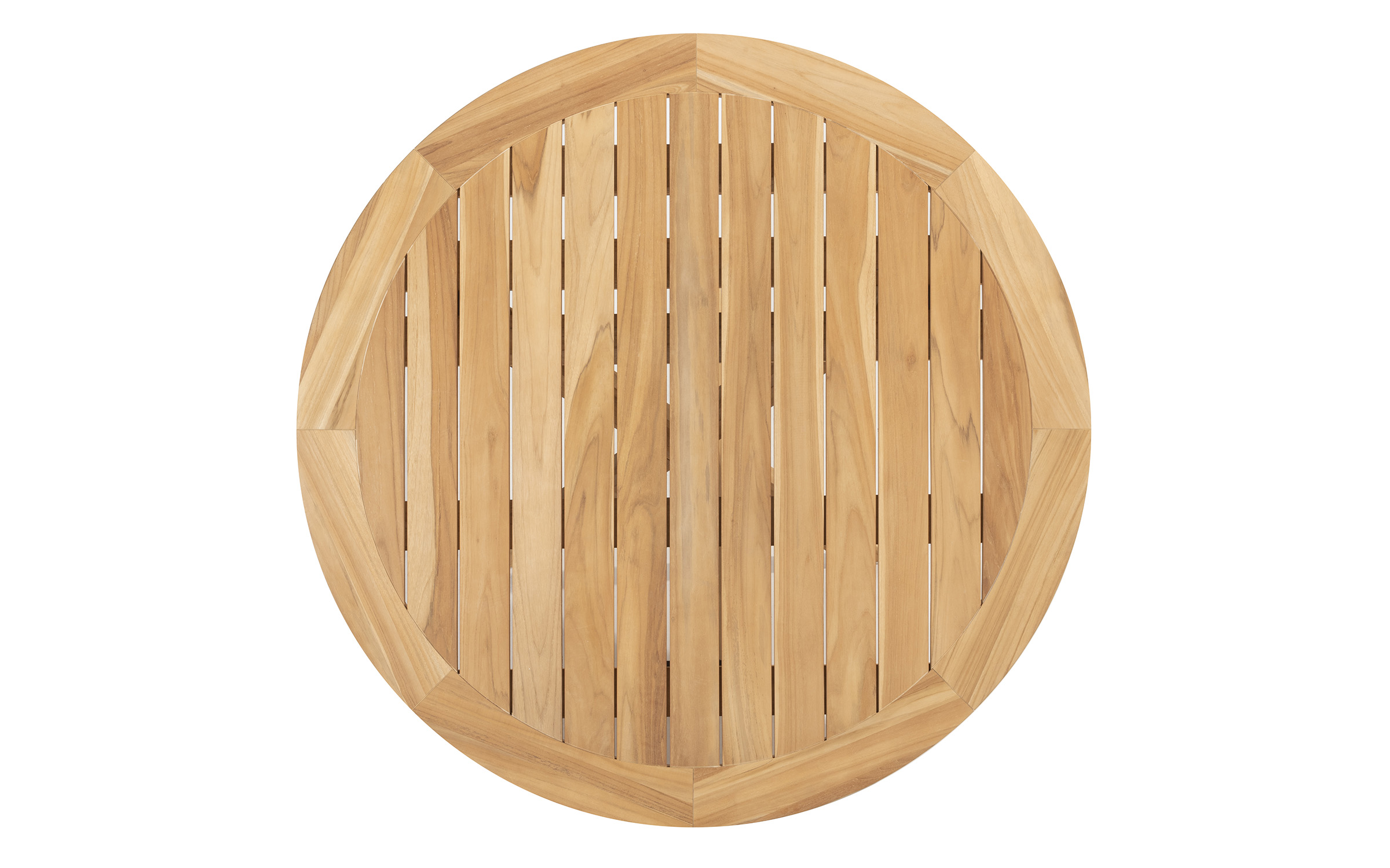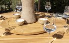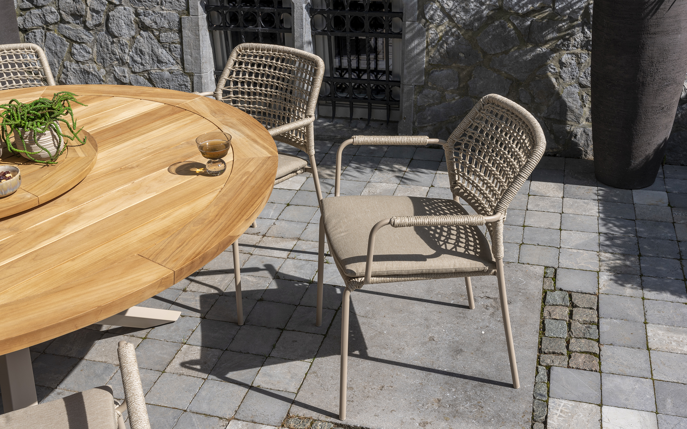 Stół ma podstawę z aluminium malowanego proszkowo lub teakową oraz blat z drewna tekowego w kolorze naturalnym o średnicy 160 cm.