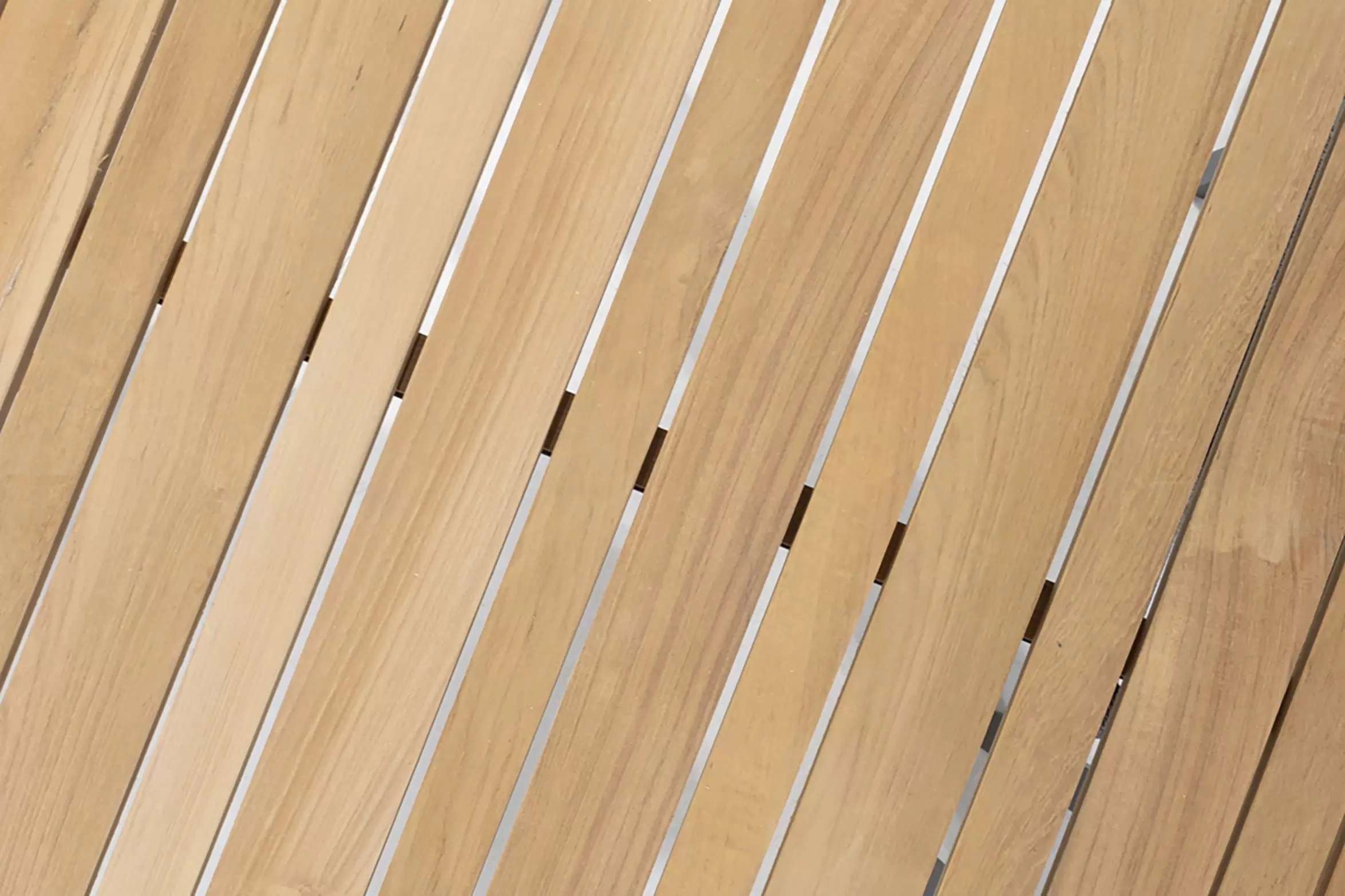 Nowoczesny stół ogrodowy od 4SO. Aluminiowa podstawa z nogami o grubych profilach w rogach stołu. Blat z desek z drewna teak ułożonych wzdłuż długości stołu.