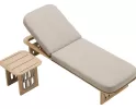 Leżak ma luksusową drewnianą ramę i okazjonalny stolik wykonany także z drewna teakowego.