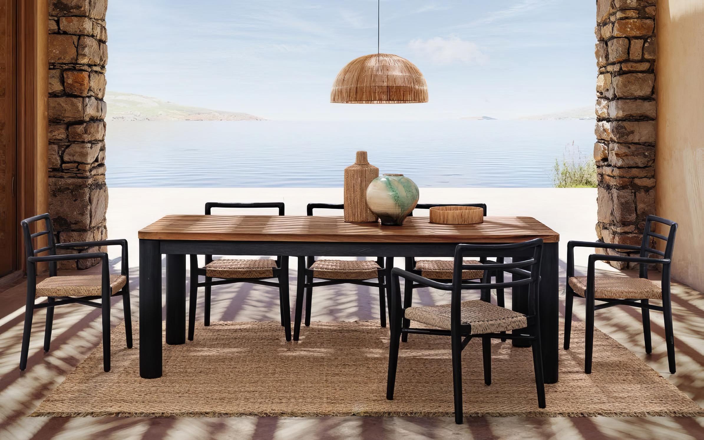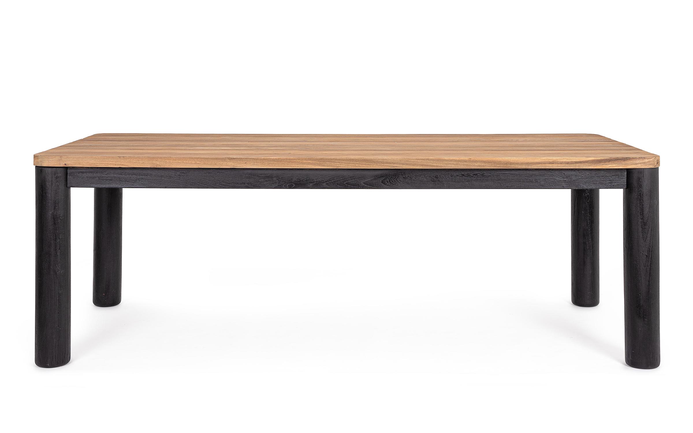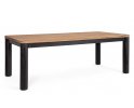 Prostokątny stół ogrodowy z nogami w ciemnym rustykalnym kolorze umieszczonymi w rogach stołu. Gruby blat stołu z desek ułożonych wzdłuż długości stołu w naturalnym kolorze drewna w szczotkowanym wykończeniu.