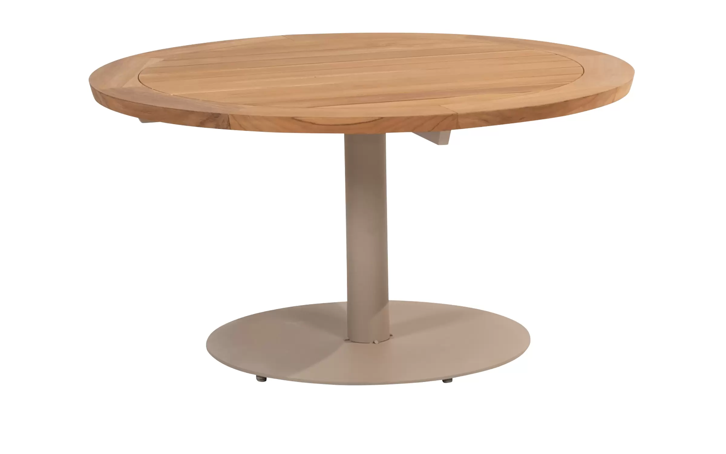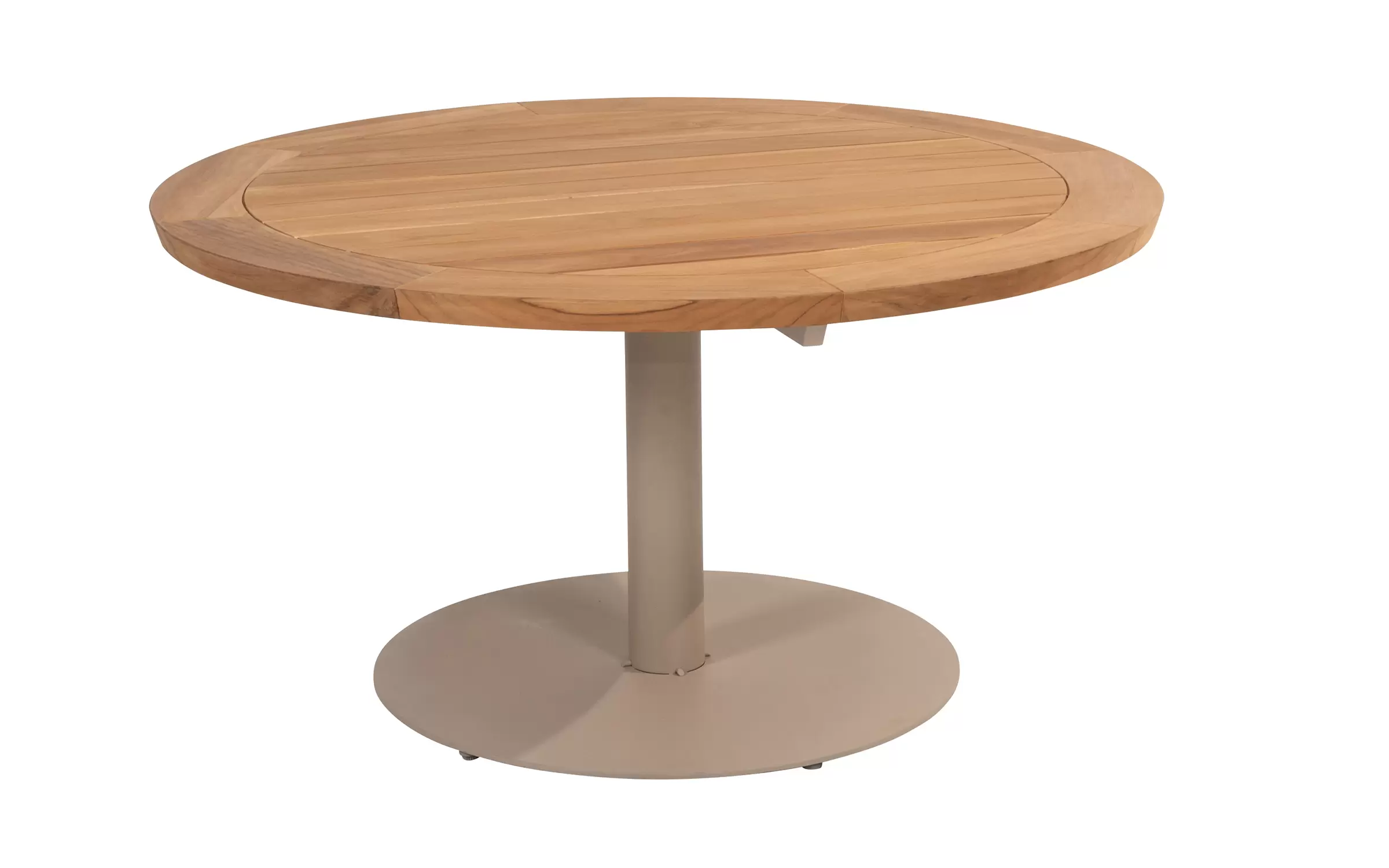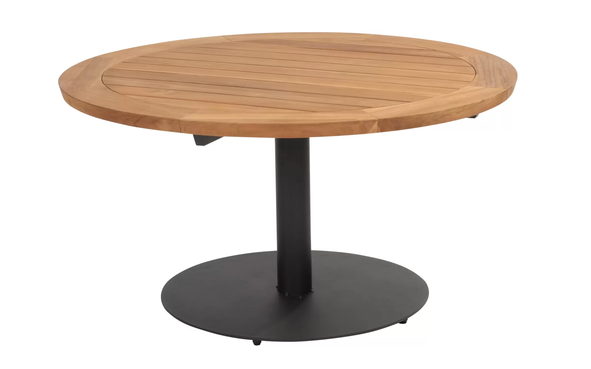 Okrągły stół ogrodowy na jednej nodze z cięższą podstawą i okrągłym blatem z drewna teakowego.