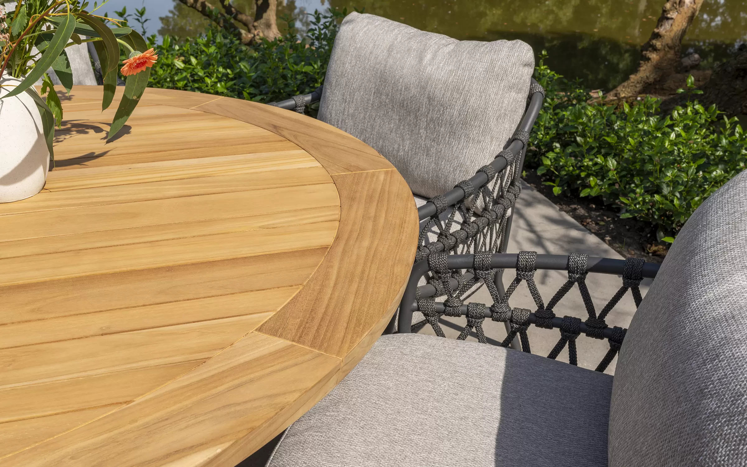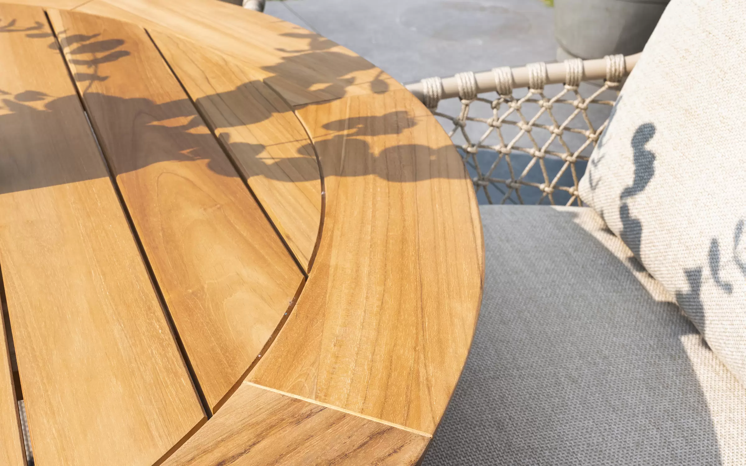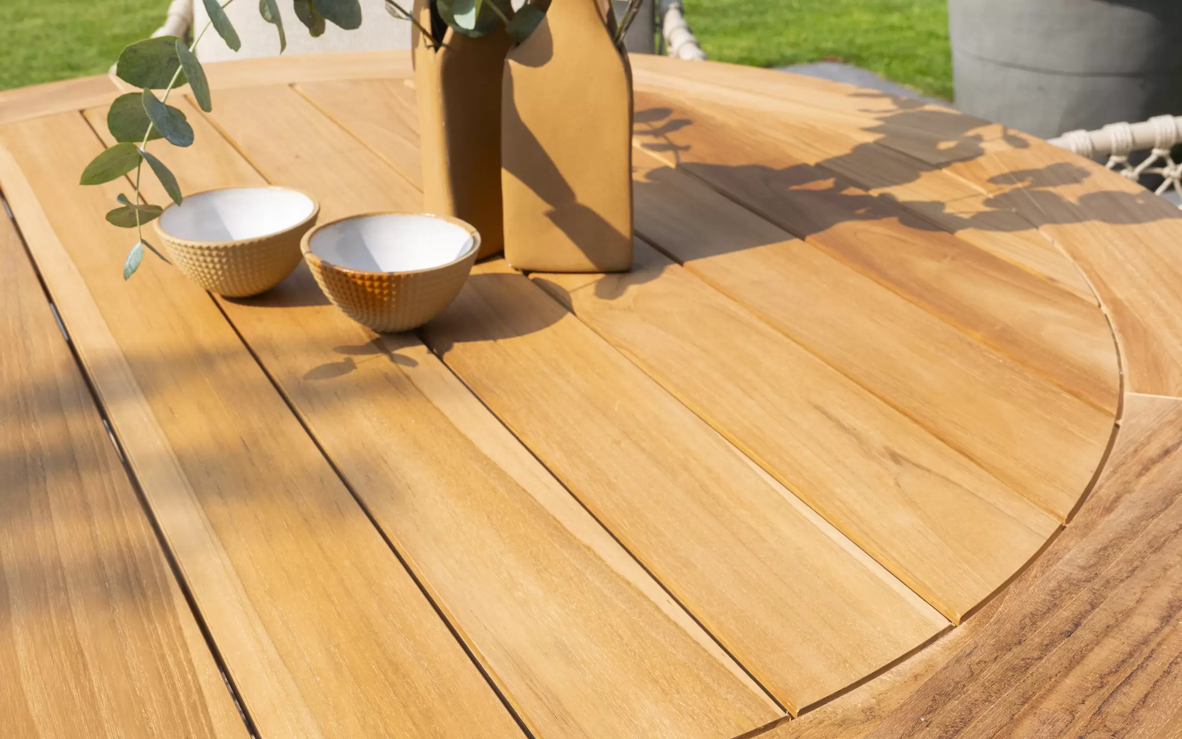 Okrągły stół ogrodowy na jednej nodze z cięższą podstawą i okrągłym blatem z drewna teakowego.