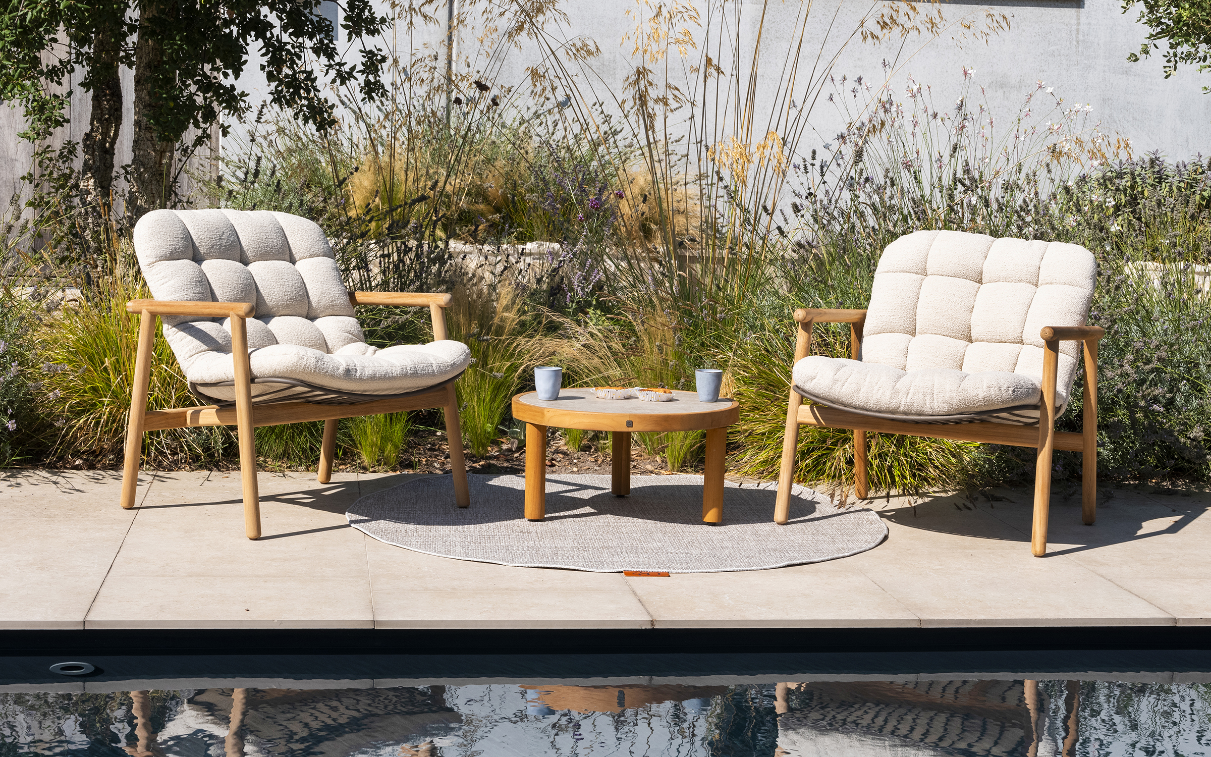 Poduszki pikowane odporne na warunki atmosferyczne ze specjalną pianką, która pozwala wodzie przepływać, zachowując ich pierwotny kształt.
