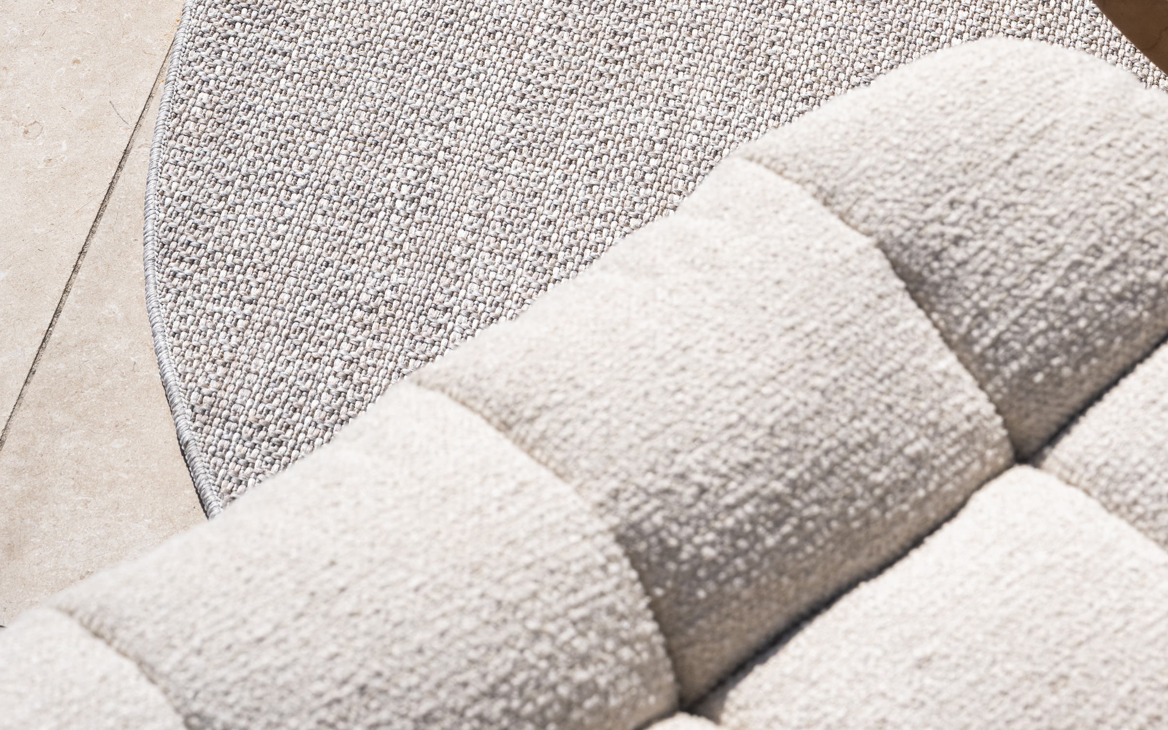 Tkanina boucle to specjalny rodzaj tkaniny, charakterystyczny dzięki swojej pętelkowej strukturze. Wykonana w wersji do użytku na zewnątrz z włókien akrylowych (100% polipropylen) - jej unikalna faktura nadaje jej miękkość i objętość.