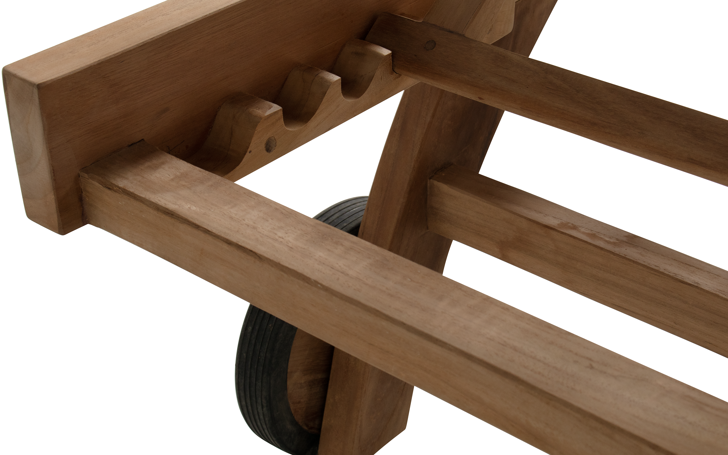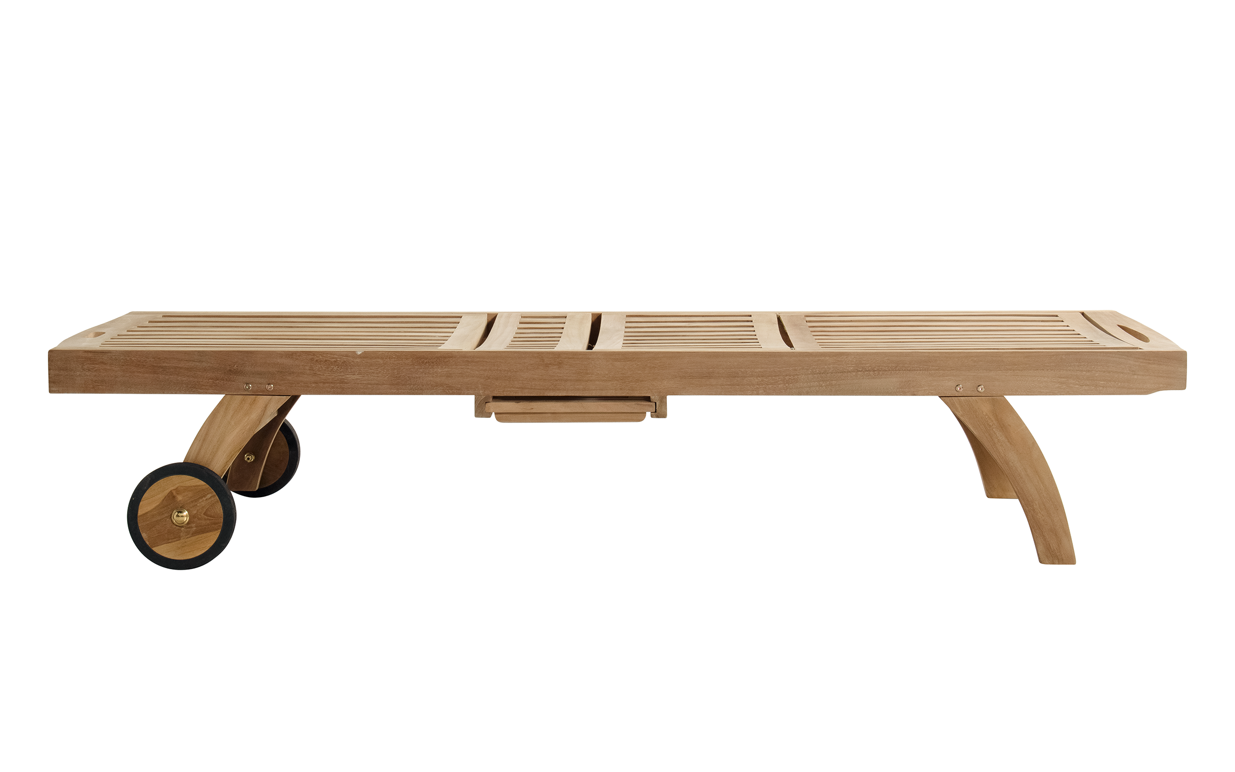 Konstrukcja w całości z drewna teakowego pochodzącego z certyfikowanych plantacji (SVLK). Teak jest naturalnie odporny na wilgoć, promieniowanie UV i wahania temperatur, dzięki czemu leżak może być użytkowany na zewnątrz przez cały sezon.