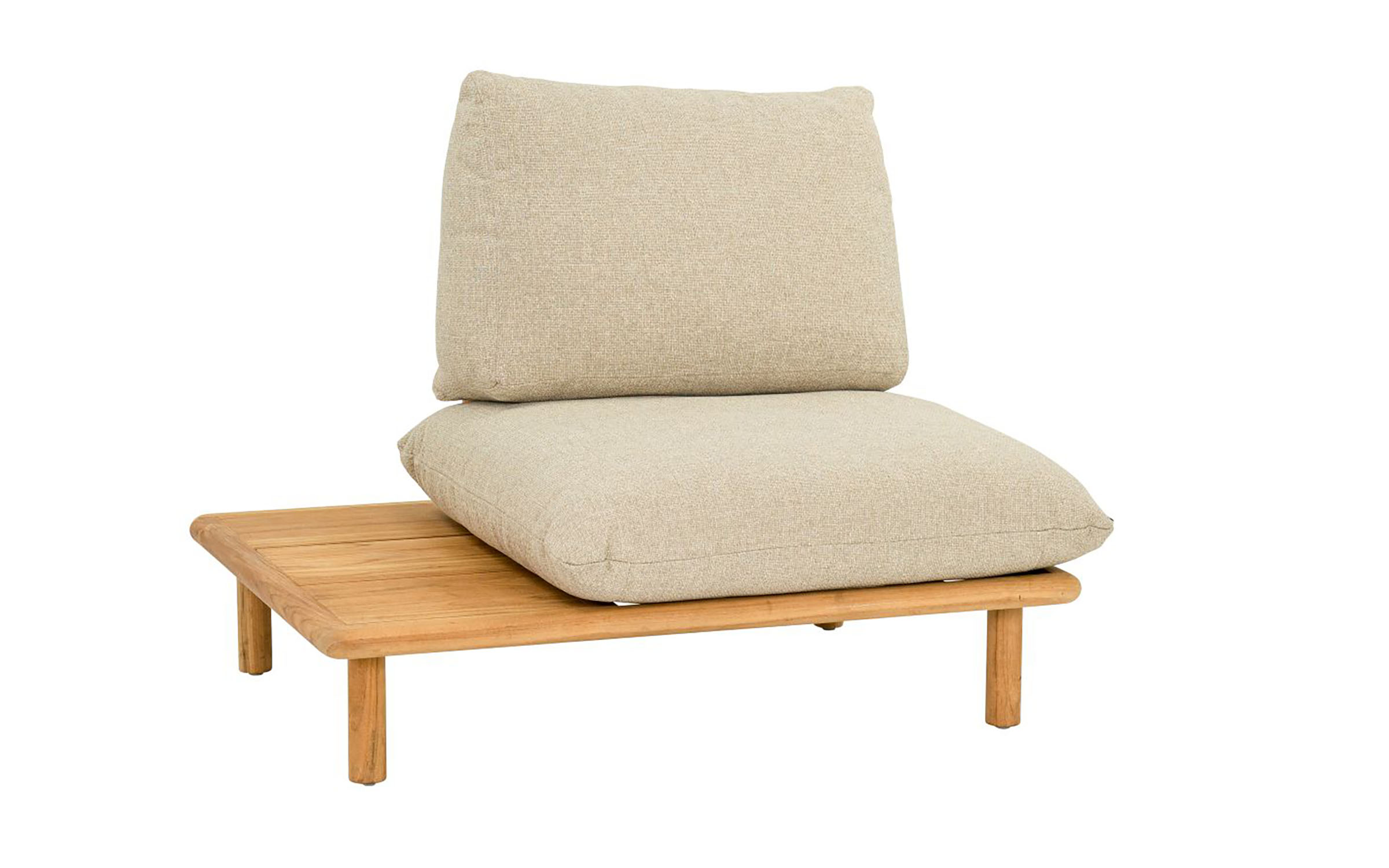Sling Single Chair to modułowy fotel ogrodowy wykonany z naturalnego teaku i wyposażony w poduszki All Weather Cotton Flower. Dostępny w wersji lewej i prawej, stanowi element kolekcji Sling Lounge – idealny do rozbudowy zestawów narożnych lub jako samodzielne siedzisko. Fotel zapewnia wysoki komfort dzięki grubym poduszkom Bee Wett i ergonomicznemu oparciu.
