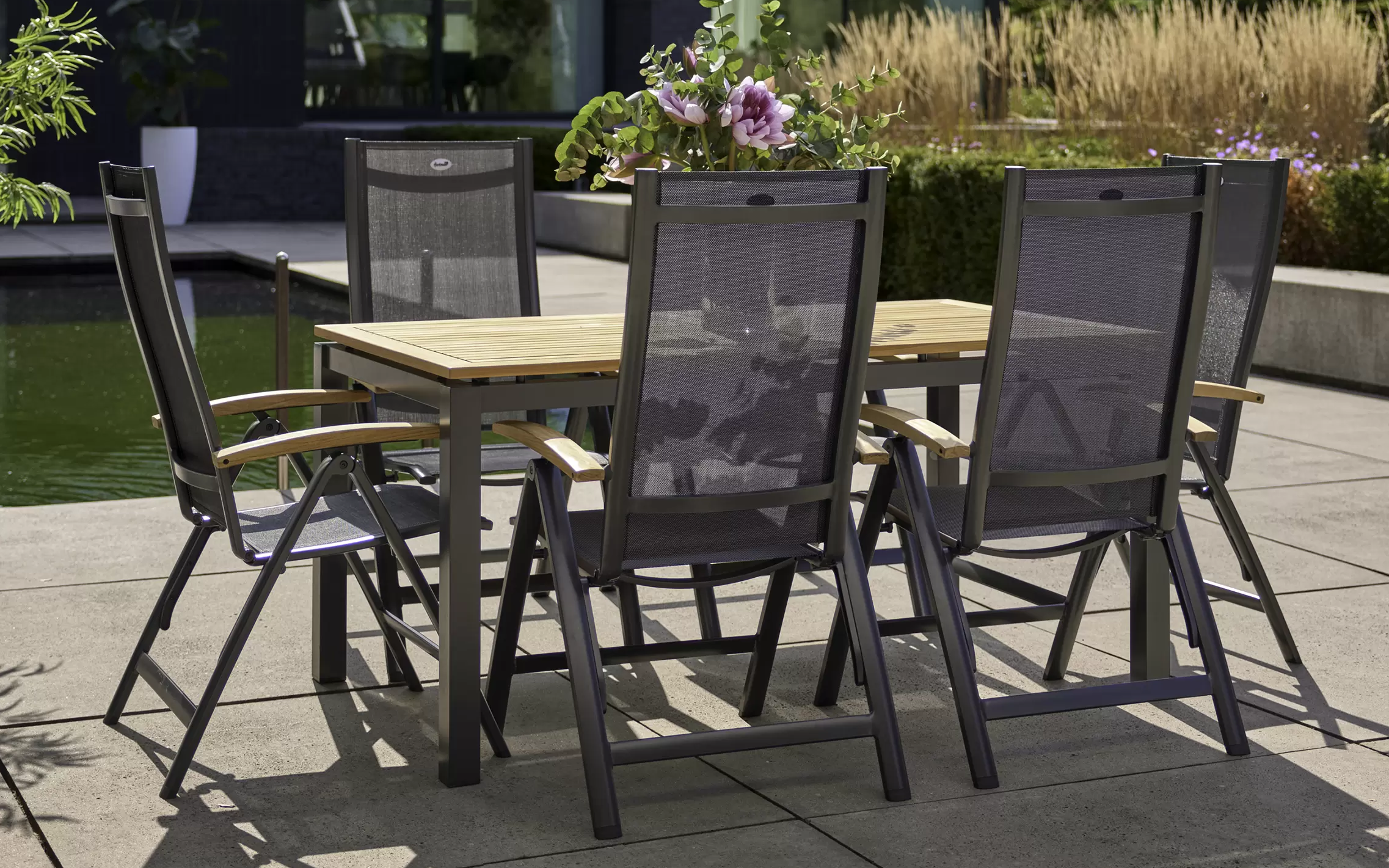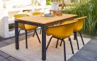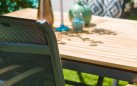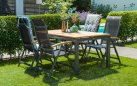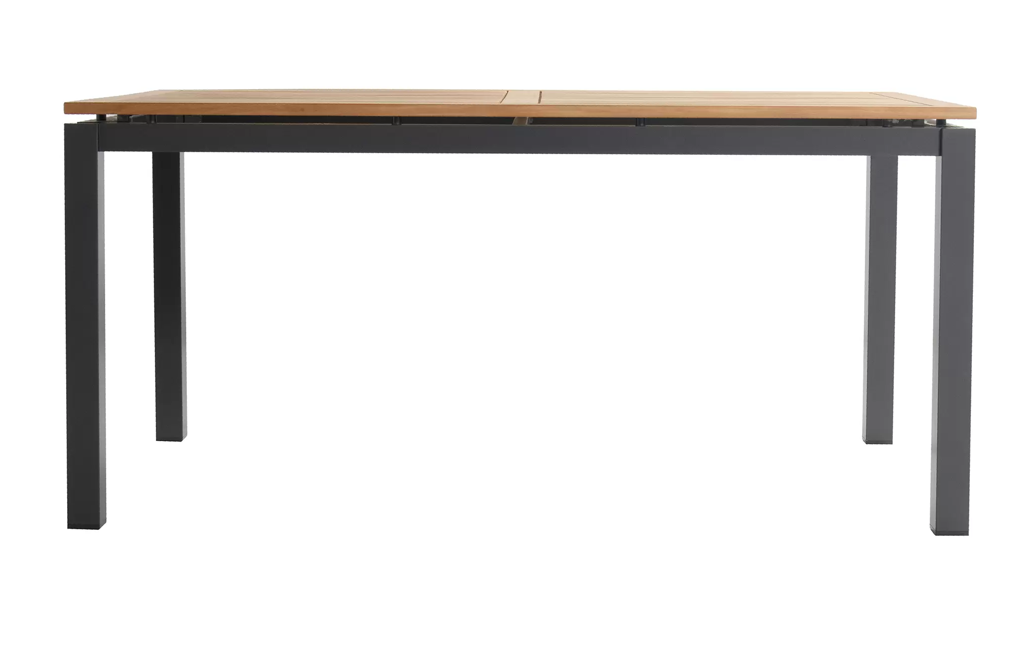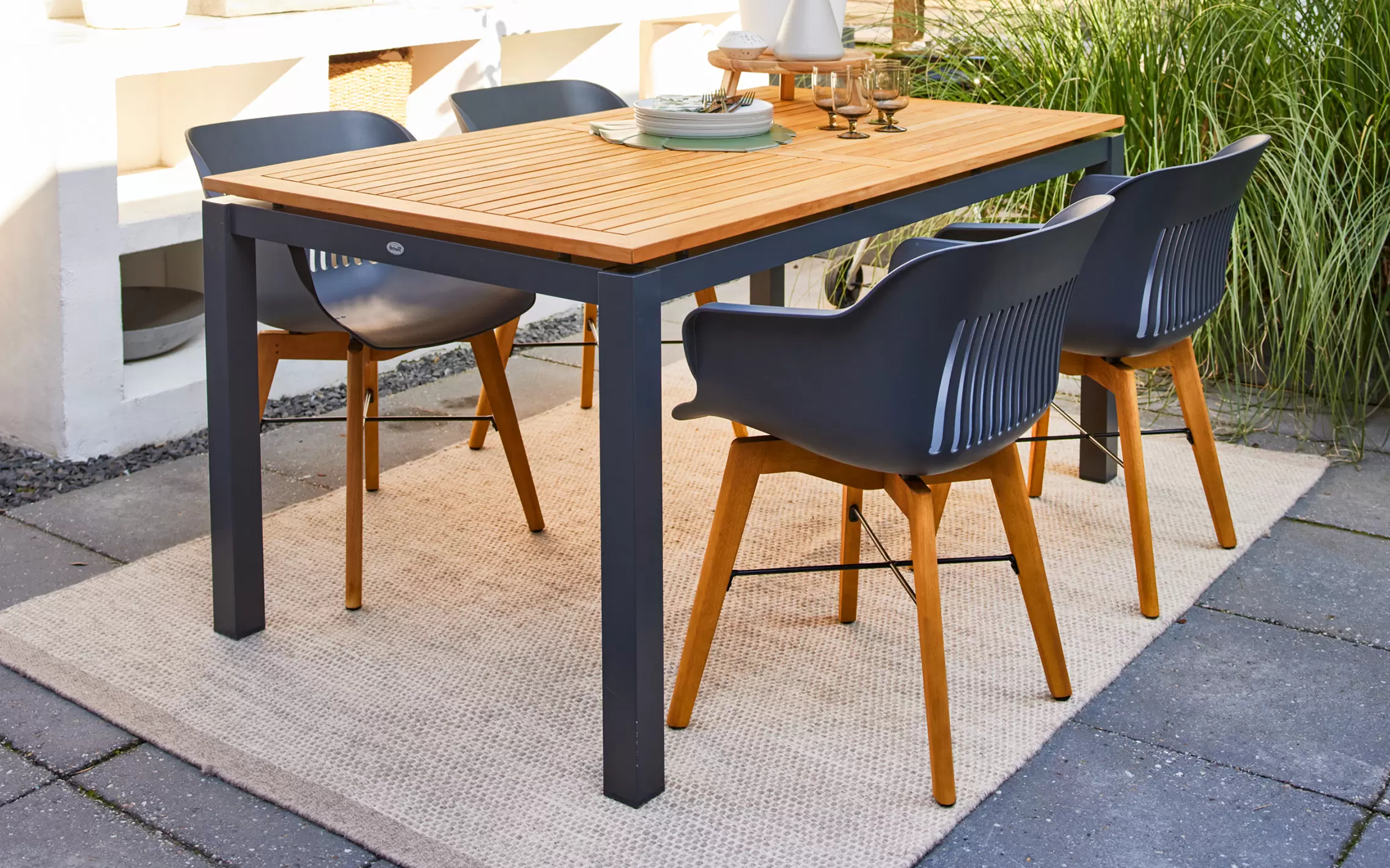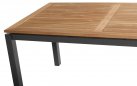 Stół ogrodowy Hartman Sonata ma blat z drewna tekowego podkreślający ekskluzywny wygląd mebli. Konstrukcja i nogi wykonane są z grubościennego stopu aluminium i są wyposażone w regulowane stopki na końcach, aby łatwiej wypoziomować stół na nierównych powierzchniach.