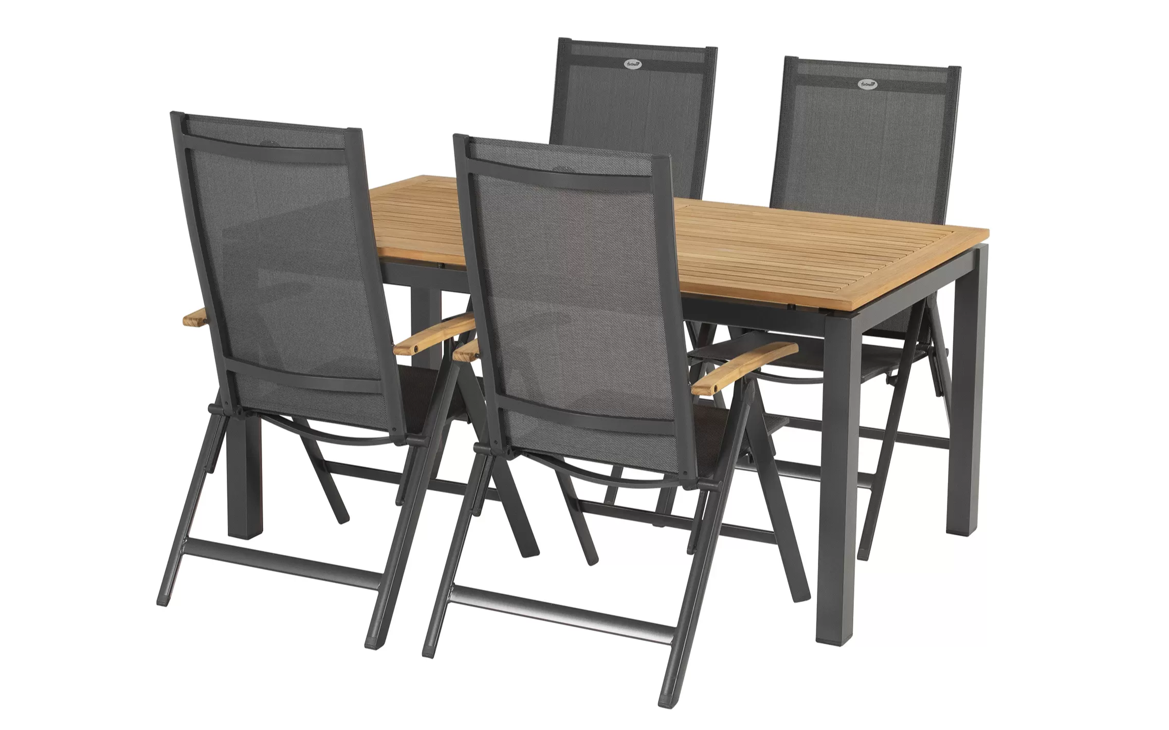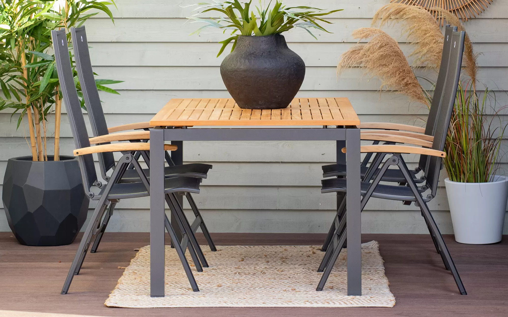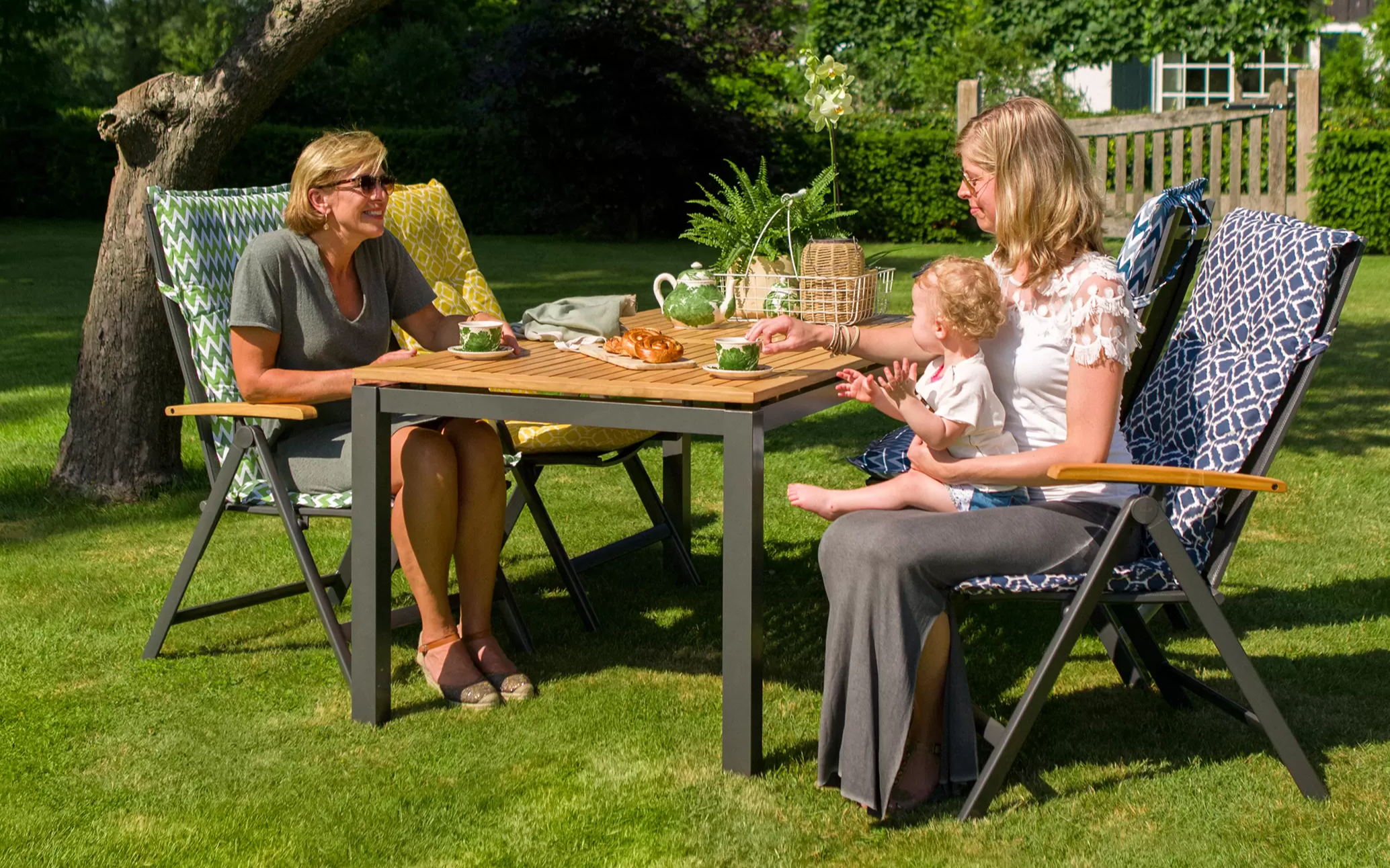 Stół ogrodowy Hartman Sonata ma blat z drewna tekowego podkreślający ekskluzywny wygląd mebli. Konstrukcja i nogi wykonane są z grubościennego stopu aluminium i są wyposażone w regulowane stopki na końcach, aby łatwiej wypoziomować stół na nierównych powierzchniach.