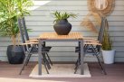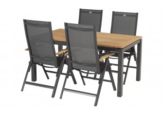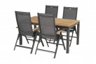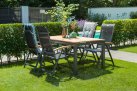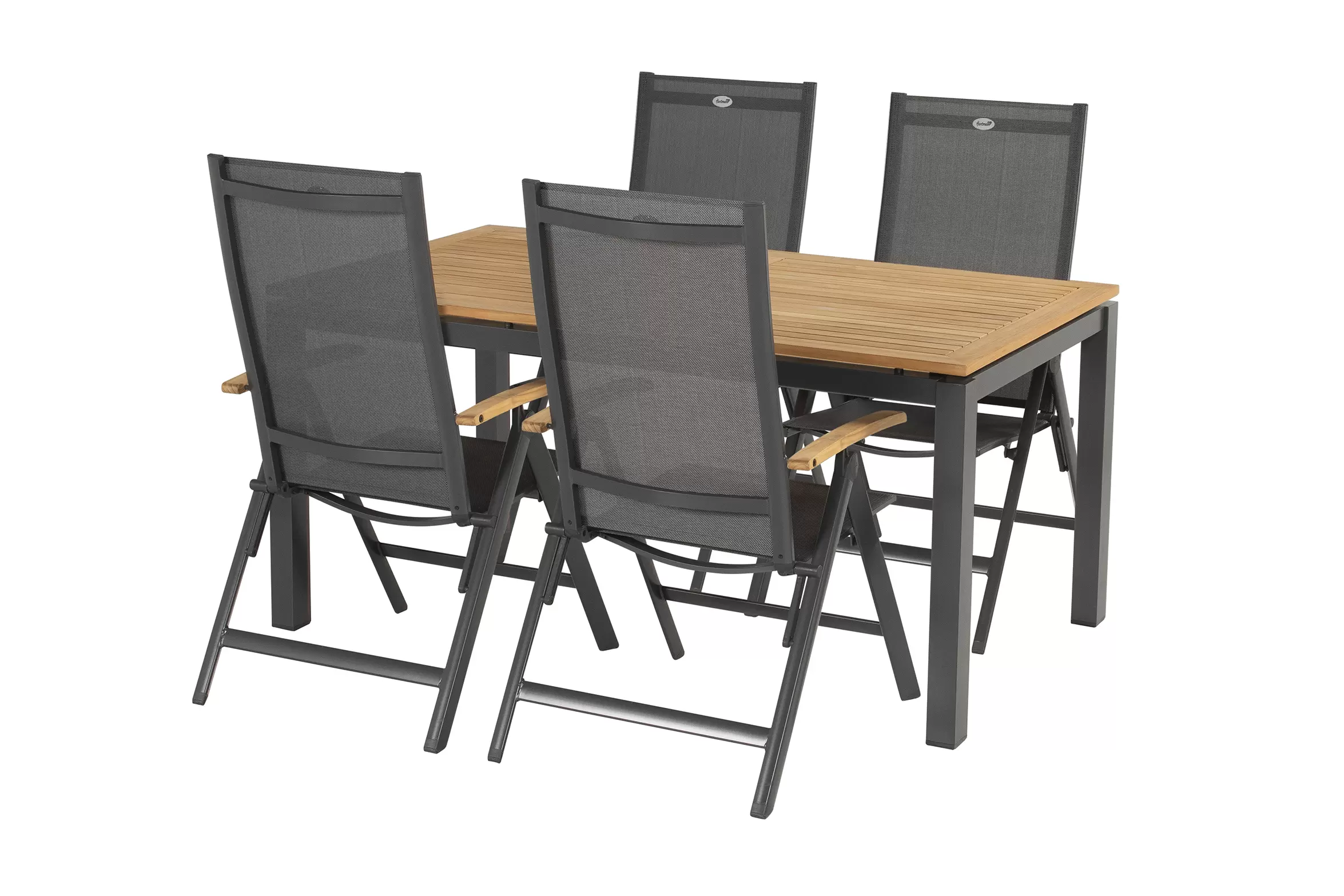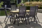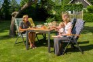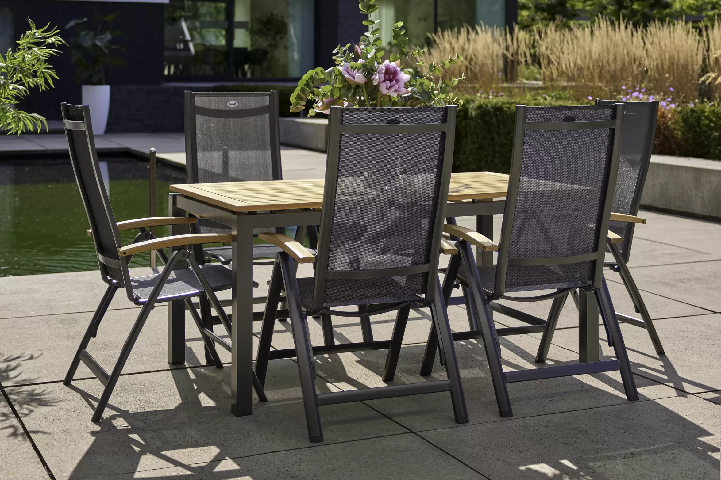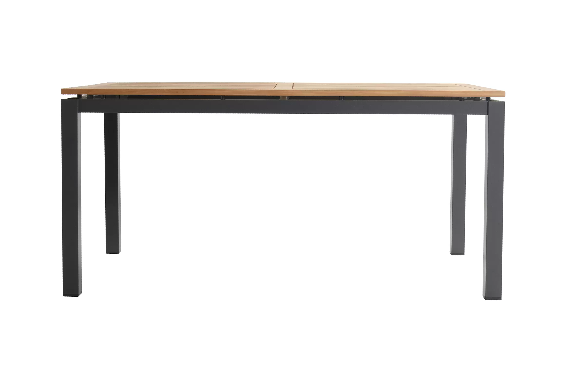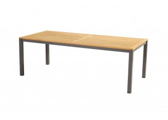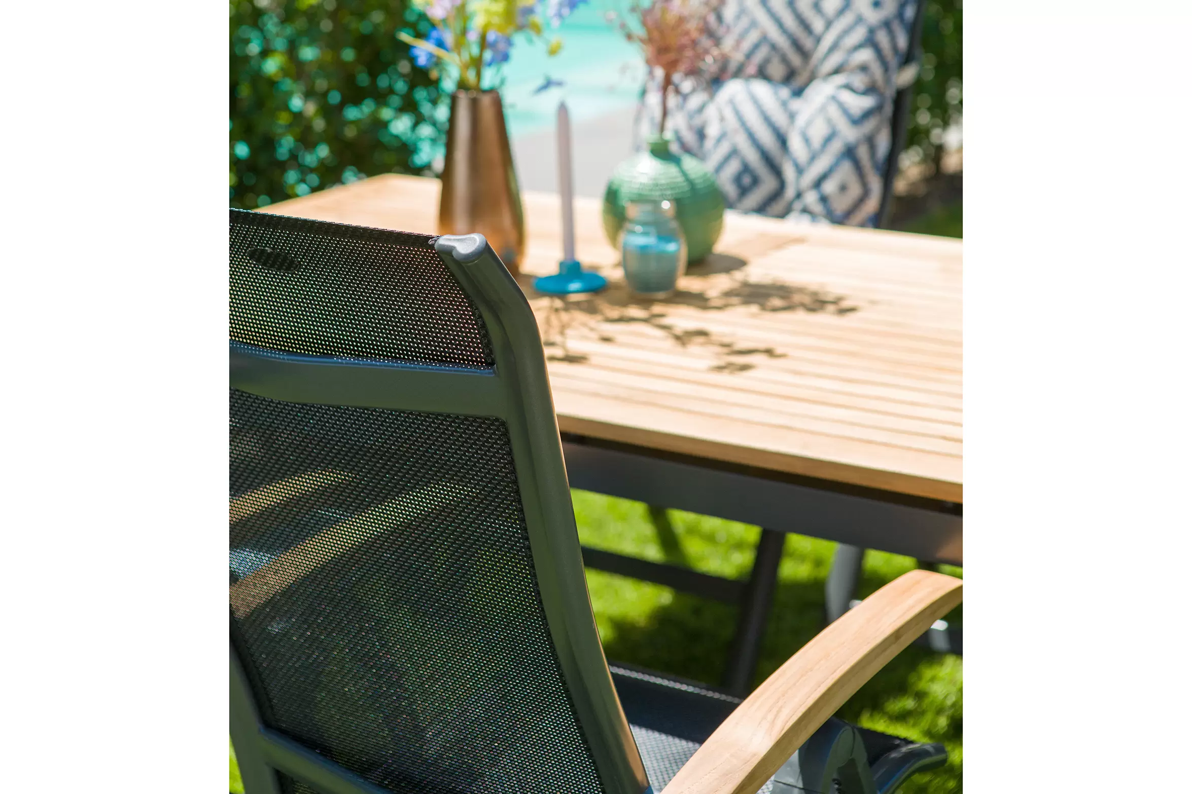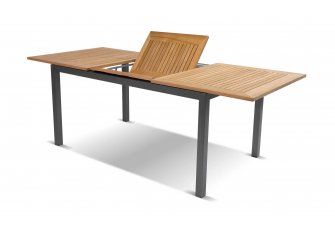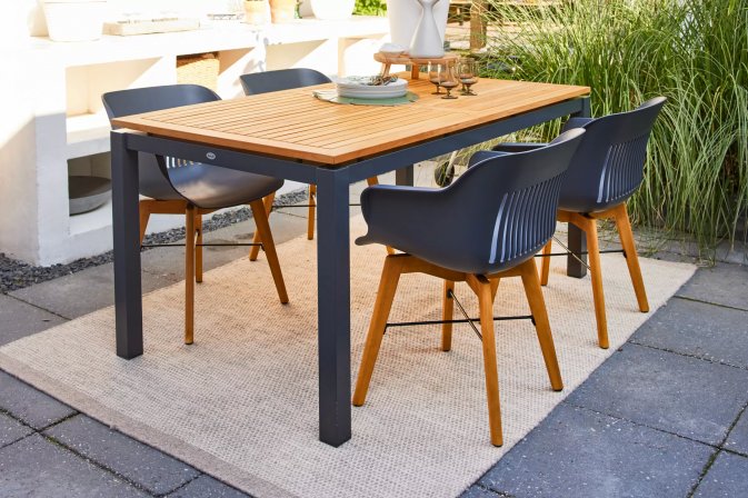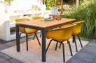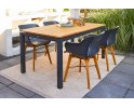 Stół ogrodowy Hartman Sonata ma blat z drewna tekowego podkreślający ekskluzywny wygląd mebli. Konstrukcja i nogi wykonane są z grubościennego stopu aluminium i są wyposażone w regulowane stopki na końcach, aby łatwiej wypoziomować stół na nierównych powierzchniach.