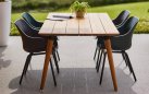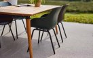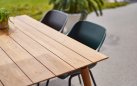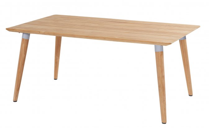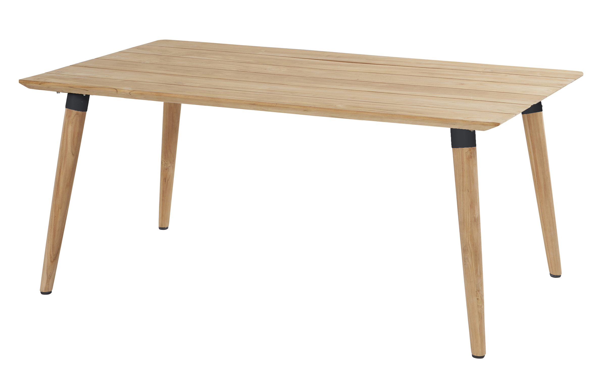 Blat i nogi wykonane z litego drewna teakowego. Obręcze przy blacie z aluminium malowanego proszkowo w kolorach: antracyt, biały lub szary. Drewno teakowe charakteryzuje się naturalną odpornością na wilgoć, słońce i wahania temperatury.