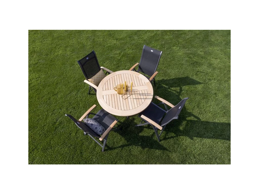 Luksusowy okrągły stół ogrodowy z kolekcji Hartman pasuje do każdego ogrodu lub wnętrza. Rama podstawy stołu wykonana jest z grubościennego stopu aluminiowego wykończonego kolorem ciemnoszarym. Blat stołu Hartman jest wykonany z wysokiej jakości drewna tekowego FSC. Stół ma piękny design, jego blat teakowy posiada interesujący wzór deseczek. Do stołu nadają się fotele z podłokietnikami z drewna tekowego lub w całości z aluminium.