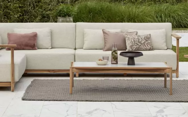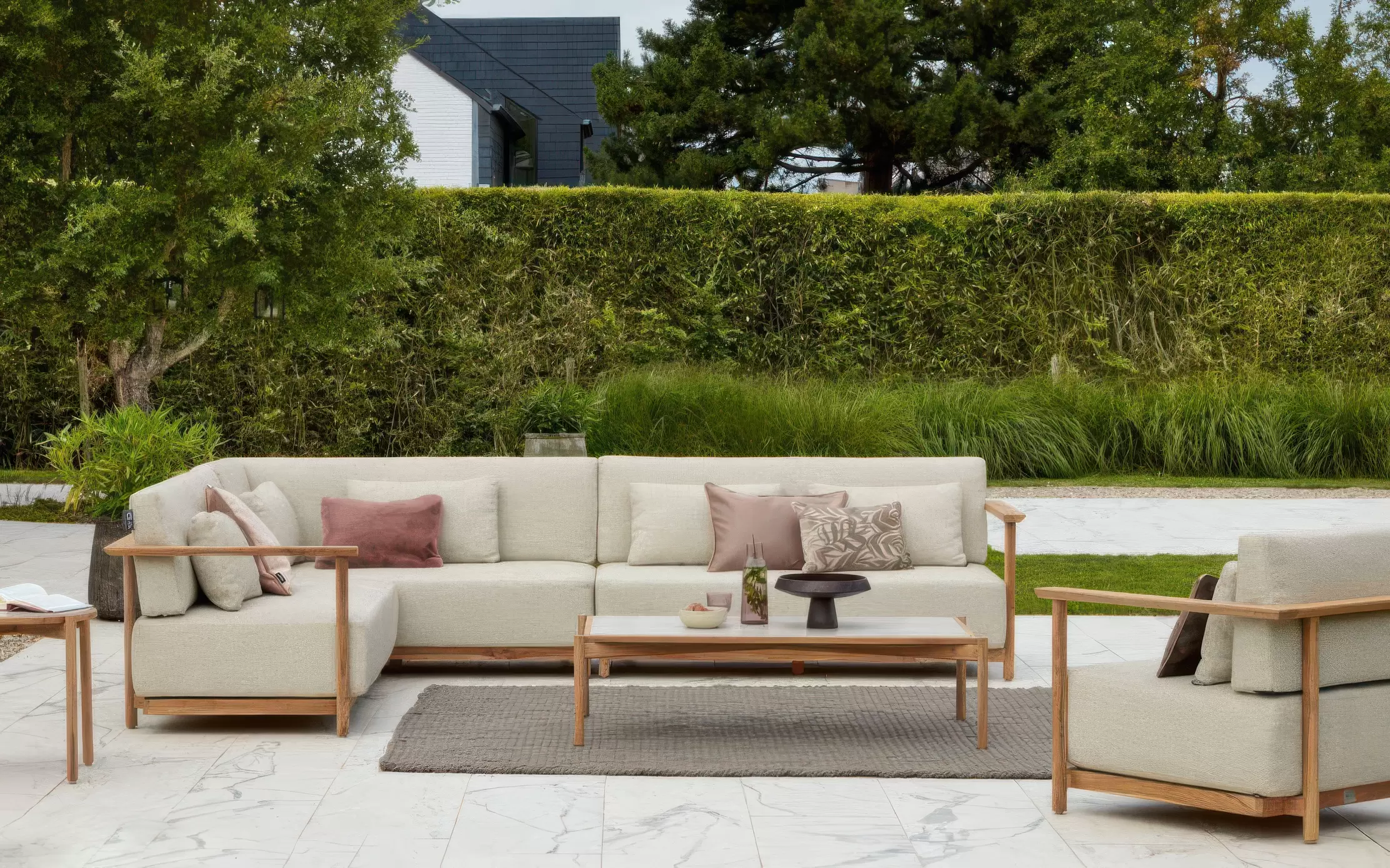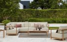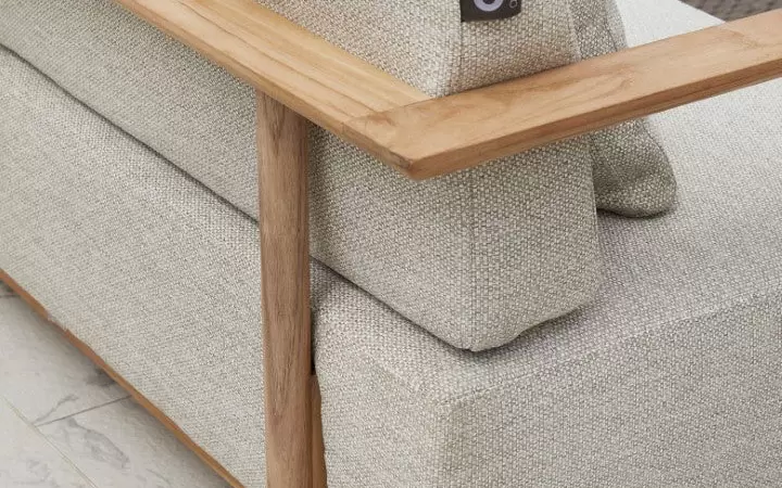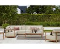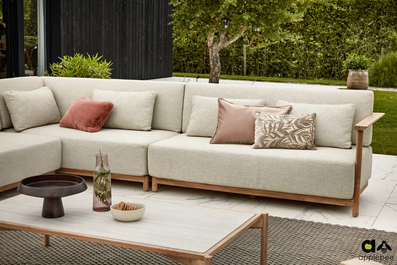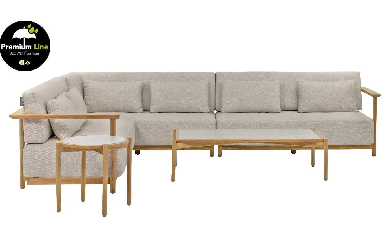 Zestaw ST. LUCIA to luksusowy komplet wypoczynkowy przeznaczony na taras lub do ogrodu. Wykonany z naturalnego drewna teak, z oparciami z plecionych lin outdoorowych i bardzo grubymi poduszkami Bee Wett w kolorze jasnobeżowym. Poduszki są odporne na wilgoć, promieniowanie UV i zabrudzenia, a ich struktura umożliwia szybkie schnięcie. Zestaw dostępny w konfiguracji narożnej z opcją rozbudowy o fotel. Narożnik z modułowych elementów może być ustawiony w wersji prawej lub lewej. Oczywiście z elementów można stworzyć szeroką sofę.