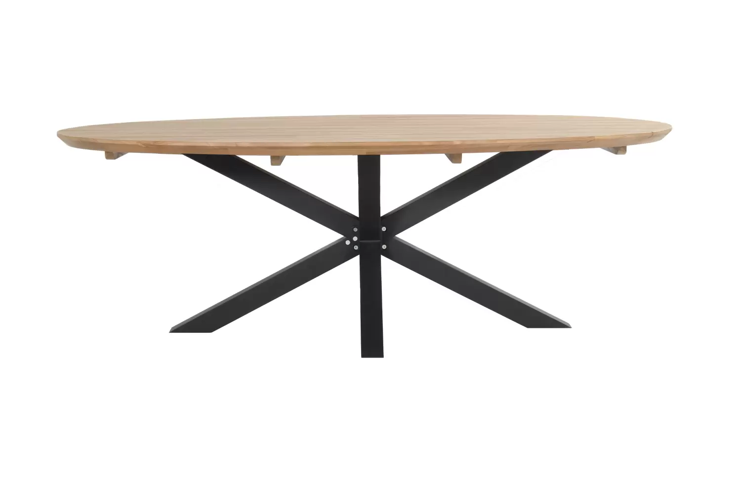 Blat jest wykonany z pięknego certyfikowanego drewna tekowego z solidną czarną aluminiową nogą krzyżową jako podstawą. Stół dostępny jest w wymiarach: