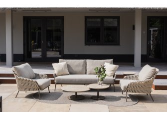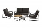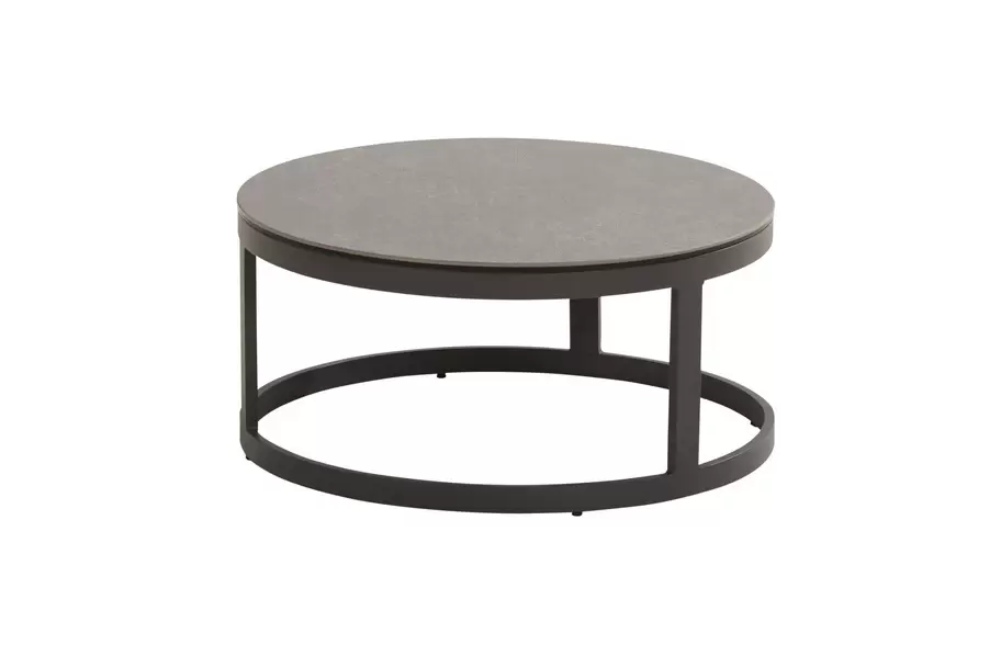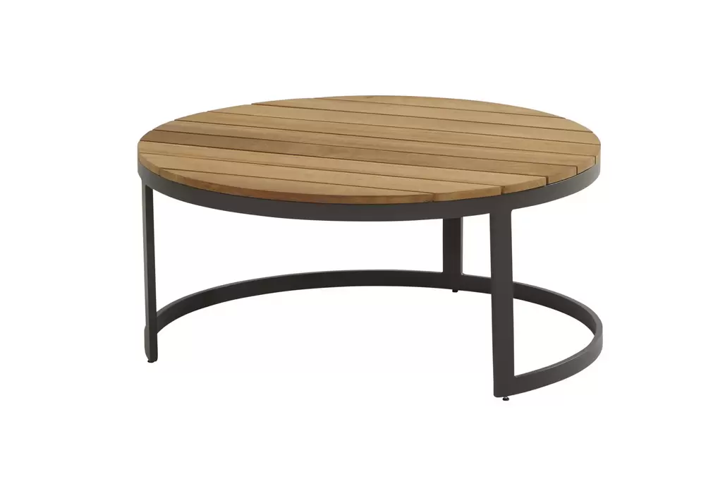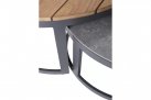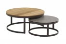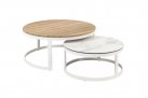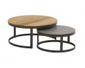 Dwa okrągłe stoliki aluminiowe ciemnoszare. Blat stolika o średnicy 80 cm z drewna teak. Stolik o średnicy 60 cm posiada blat ceramiczny.