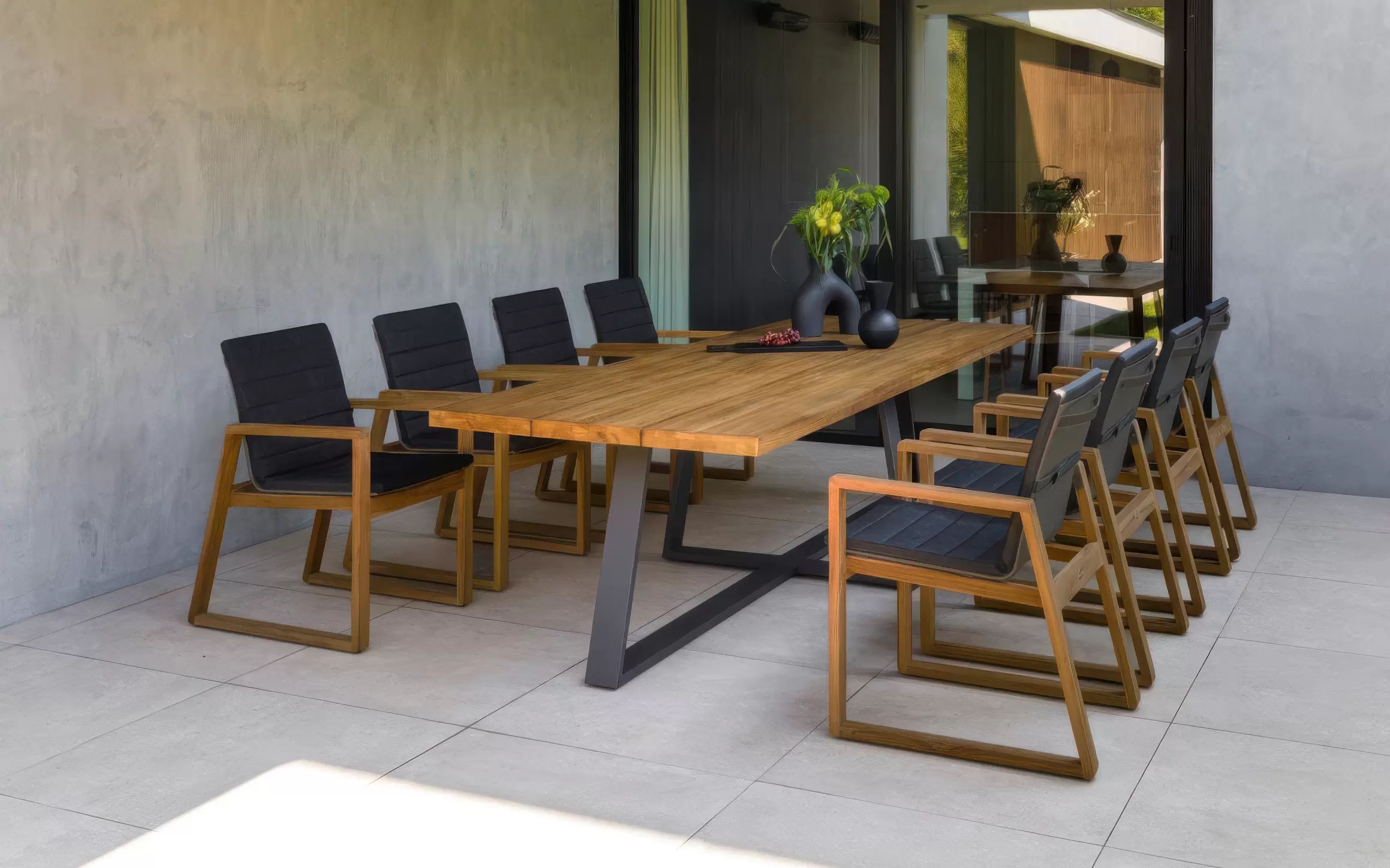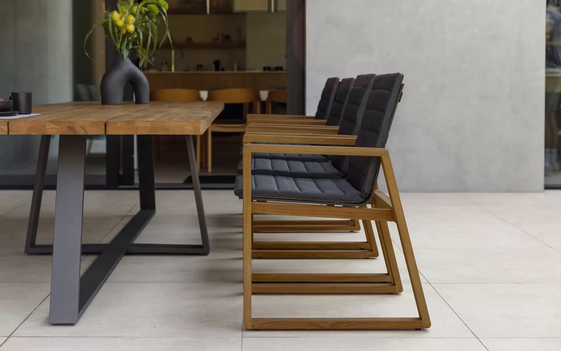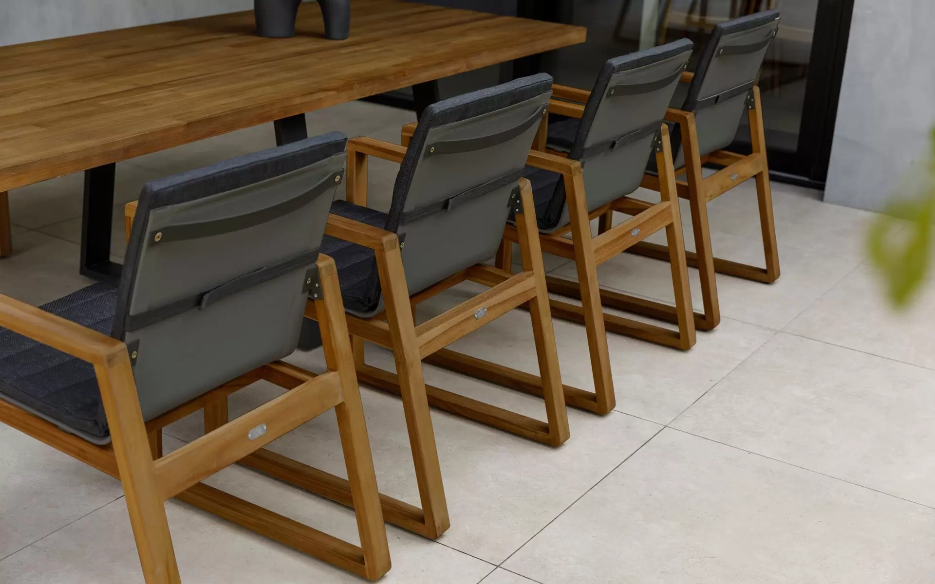 Uzupełnieniem jadalni jest osiem komfortowych krzeseł z serii Florence. Ich geometryczna sylwetka nawiązuje do najlepszych wzorców współczesnego designu, łącząc drewno teakowe z ciemnymi elementami siedzisk i oparć. Krzesła Florence zostały zaprojektowane z myślą o ergonomii, oferując wygodę niezbędną podczas wielogodzinnych spotkań w gronie najbliższych, zachowując przy tym wizualną lekkość całej aranżacji.