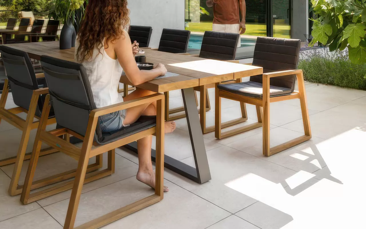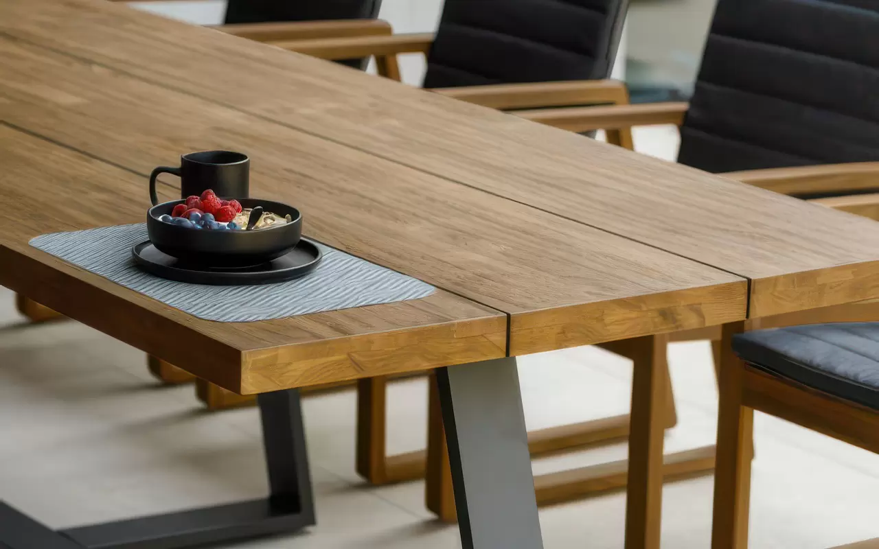 Głównym punktem kompozycji jest monumentalny stół z litego drewna teakowego. Teak, ceniony za swoją niezwykłą gęstość i naturalne nasycenie olejami, prezentuje ciepły, miodowy odcień, który z czasem zyskuje szlachetną patynę. Blat osadzono na masywnej, aluminiowej podstawie w kolorze antracytowym. Takie połączenie nadaje zestawowi "loftowego sznytu" i gwarantuje bezwzględną stabilność konstrukcji, nawet przy pełnym obciążeniu.