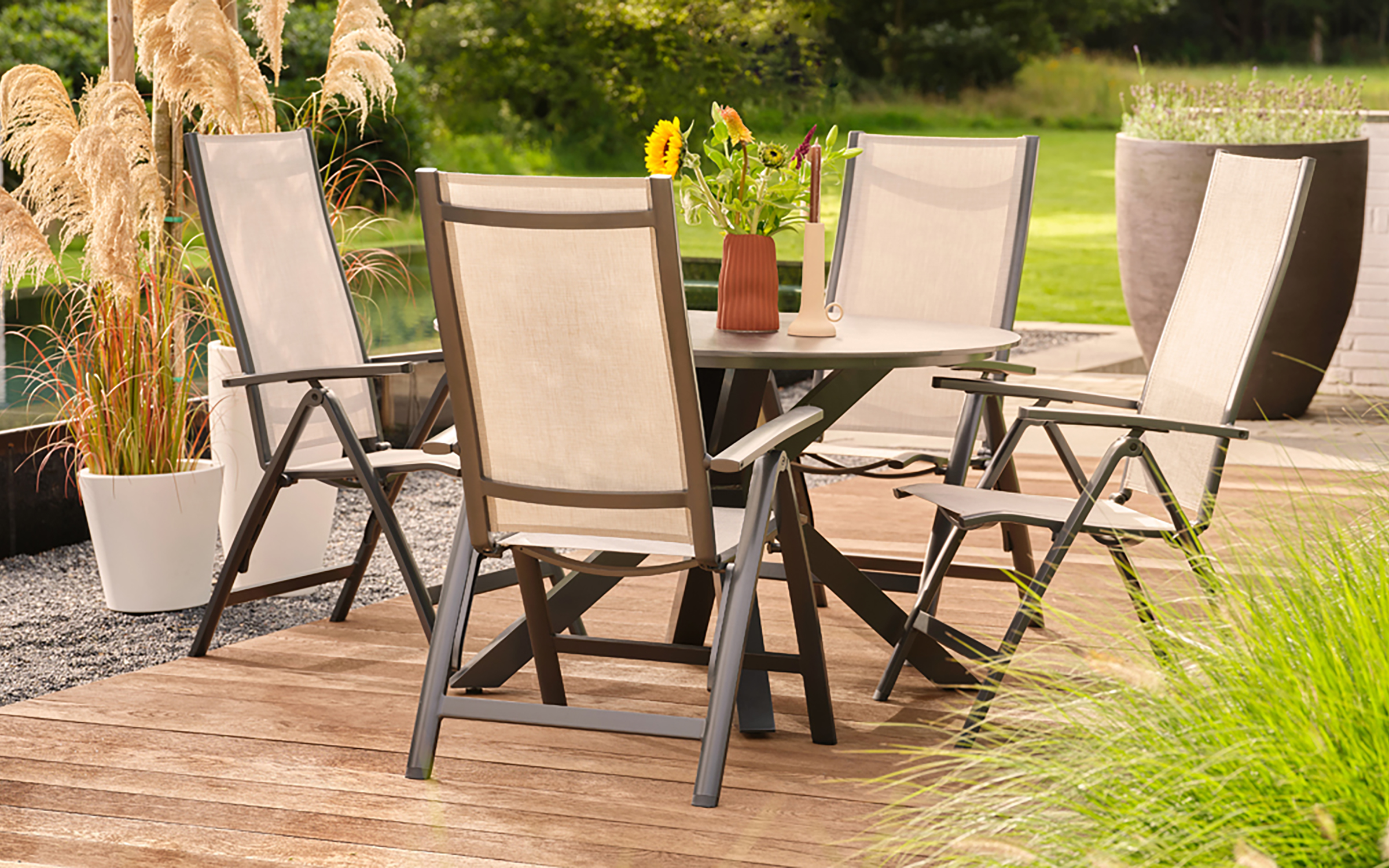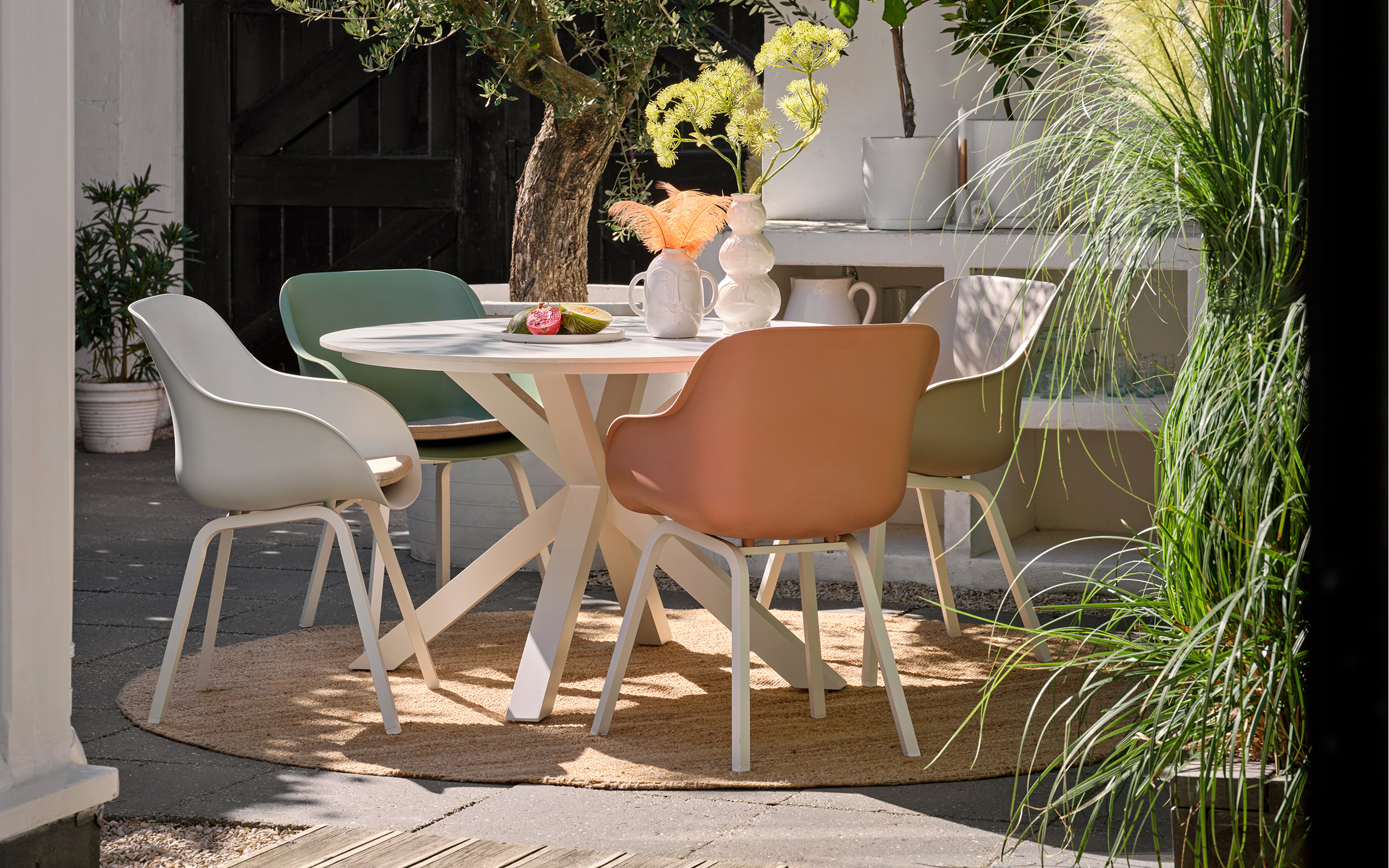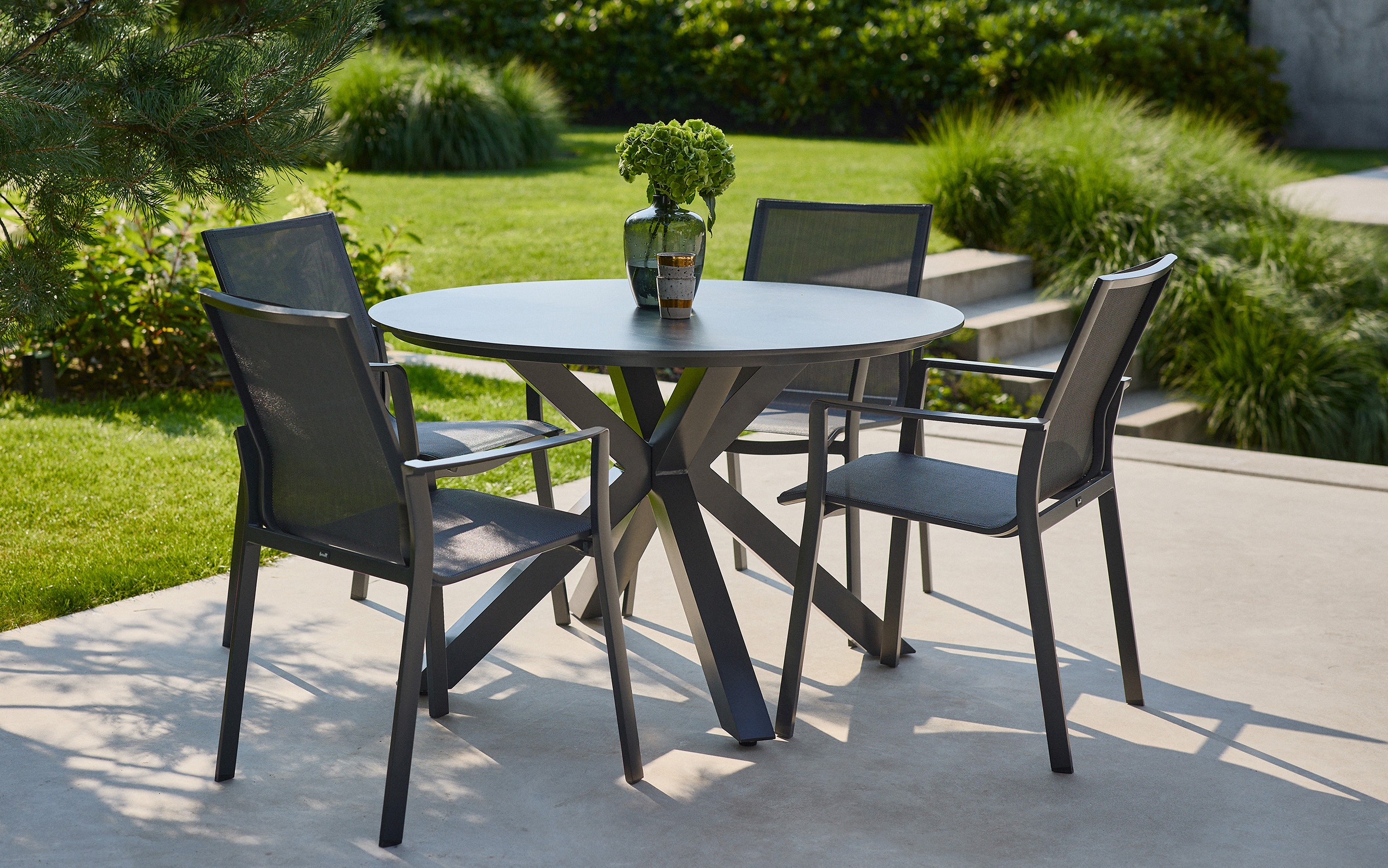 - Okrągły blat Ø120 cm – idealny dla 4–6 osób w przestrzeni ogrodowej i tarasowej