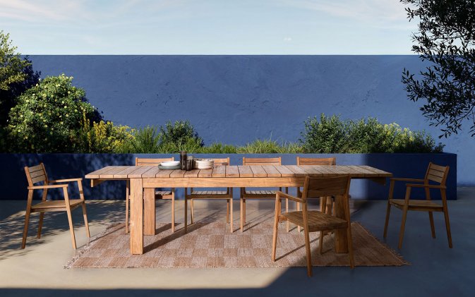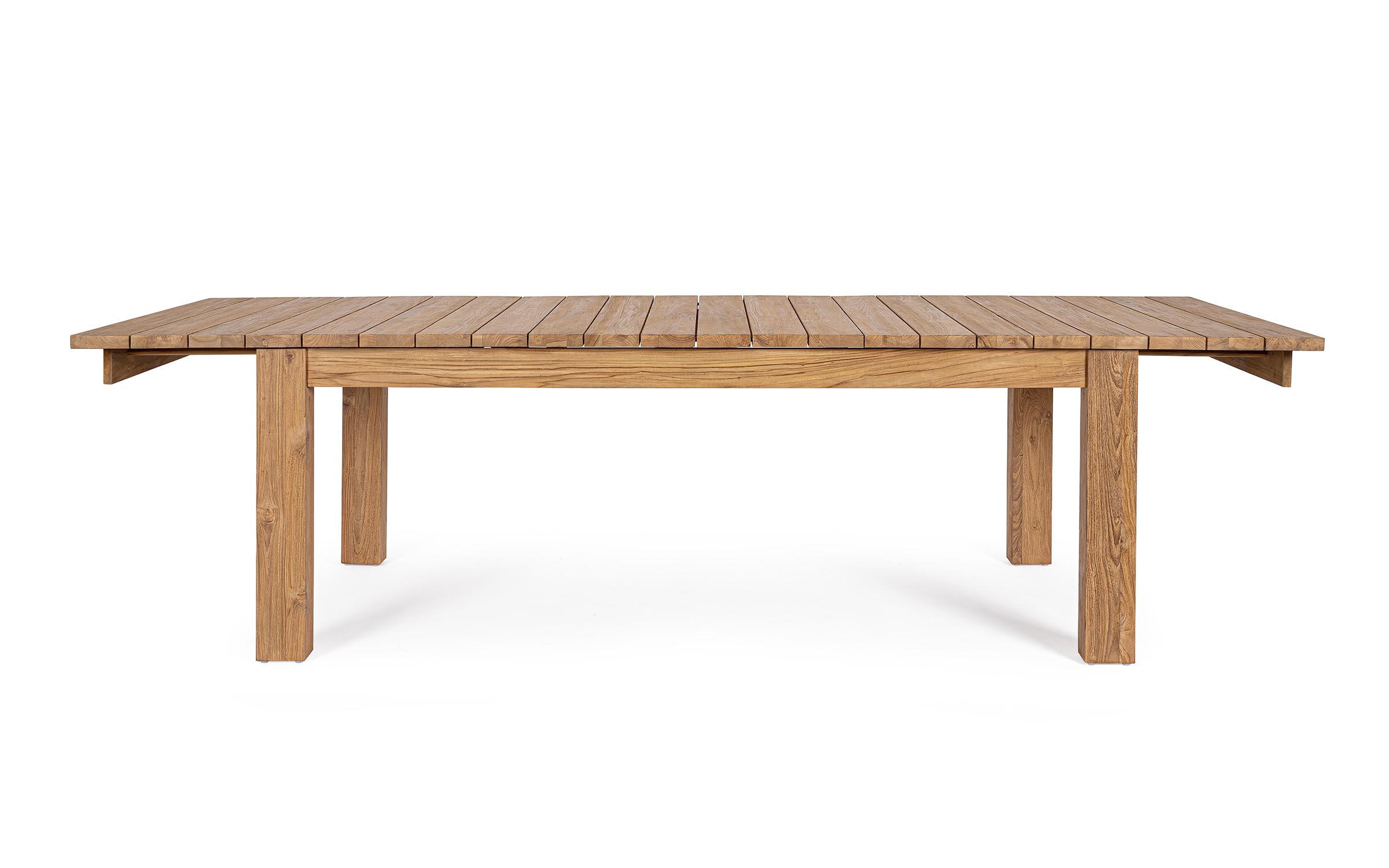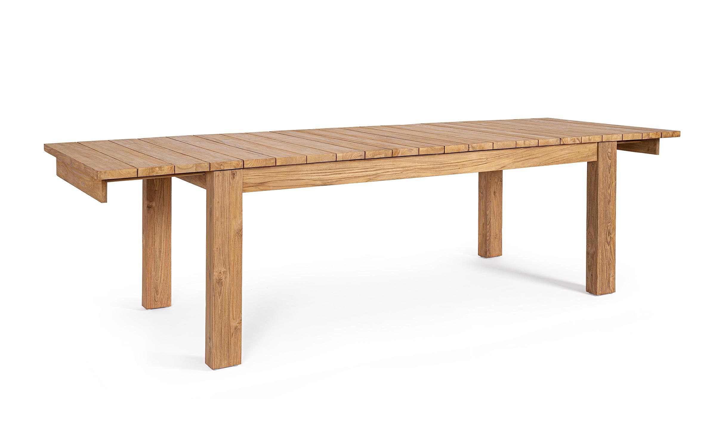 Stół z drewna teakowego do wnętrz, ogrodu zimowego i na zadaszony taras z wydłużanym blatem. Wydłużanie za pomocą 2 wstawek każda po 40 cm. Stół można rozłożyć z jedną (260 cm) lub dwoma wstawkami (300 cm).
