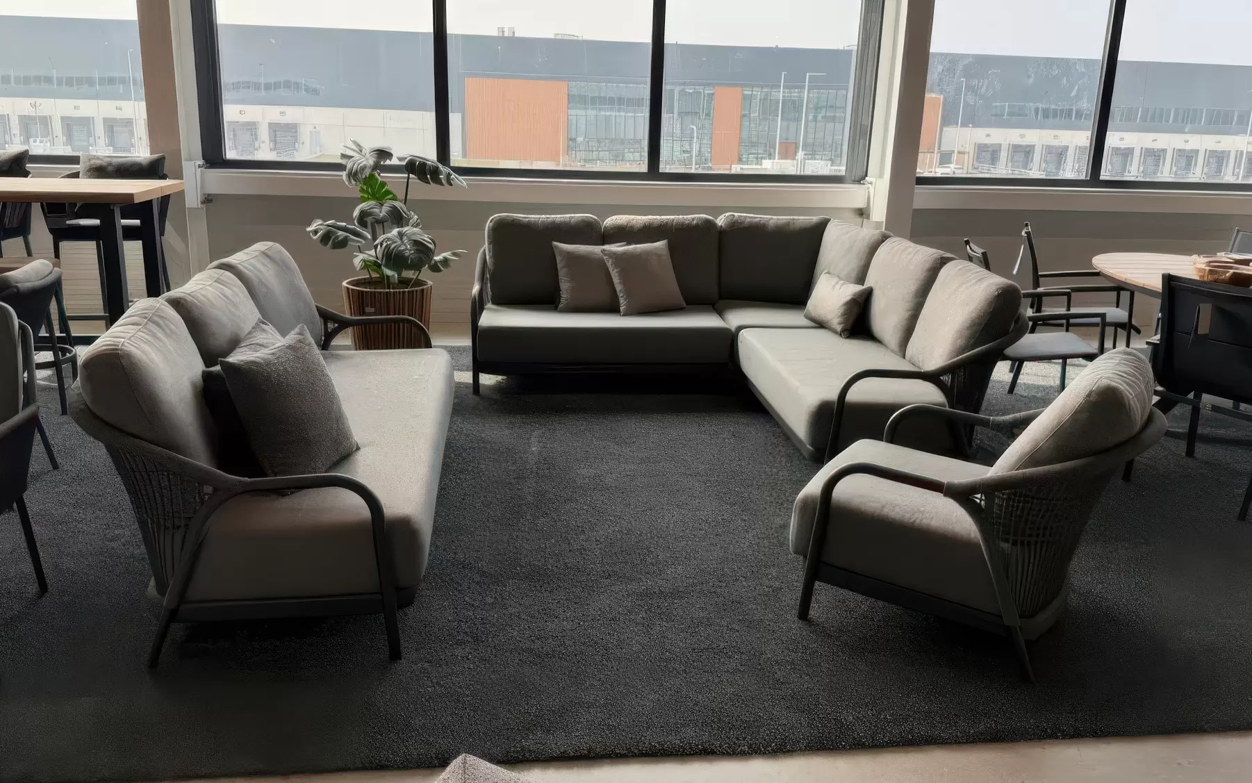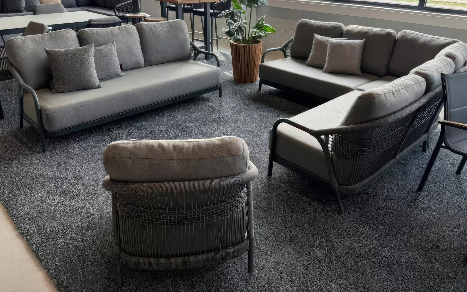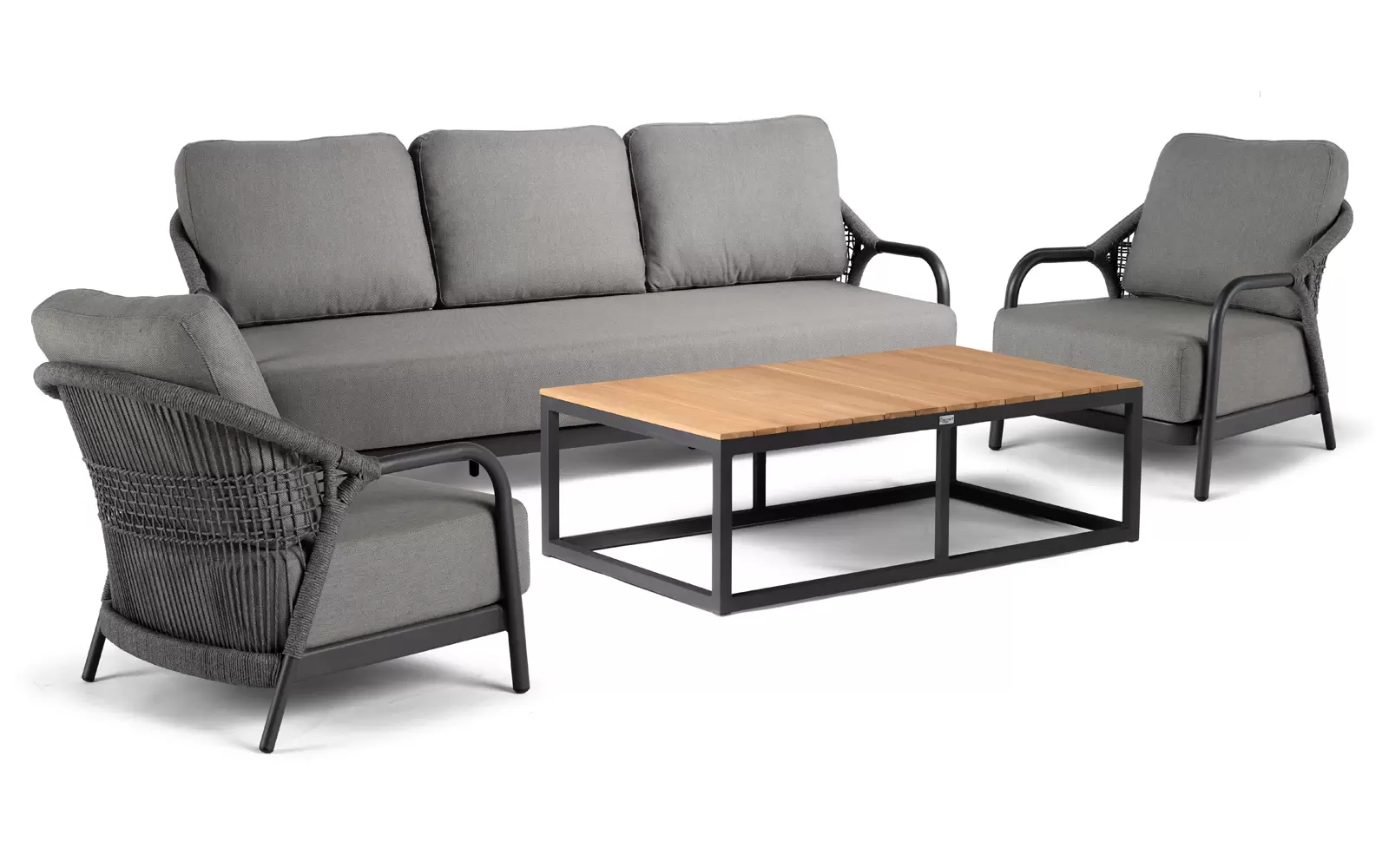 Fundamentem kompletu jest wytrzymały stelaż z aluminium malowanego proszkowo na kolor antracytowy, co zapewnia całkowitą odporność na korozję. Nowoczesny charakter podkreślają luksusowe poduszki w odcieniu charcoal grey, wykonane z wysokogatunkowej tkaniny Olefin. Materiał ten jest w pełni przystosowany do warunków zewnętrznych – wykazuje odporność na blaknięcie pod wpływem UV, wilgoć oraz zabrudzenia, a jego miękkie wypełnienie zaprasza do długiego wypoczynku. Dopełnieniem aranżacji jest stolik kawowy RIO z blatem z naturalnego drewna teakowego, którego szlachetna struktura wprowadza ciepły akcent i efektownie kontrastuje z chłodniejszą tonacją zestawu.
