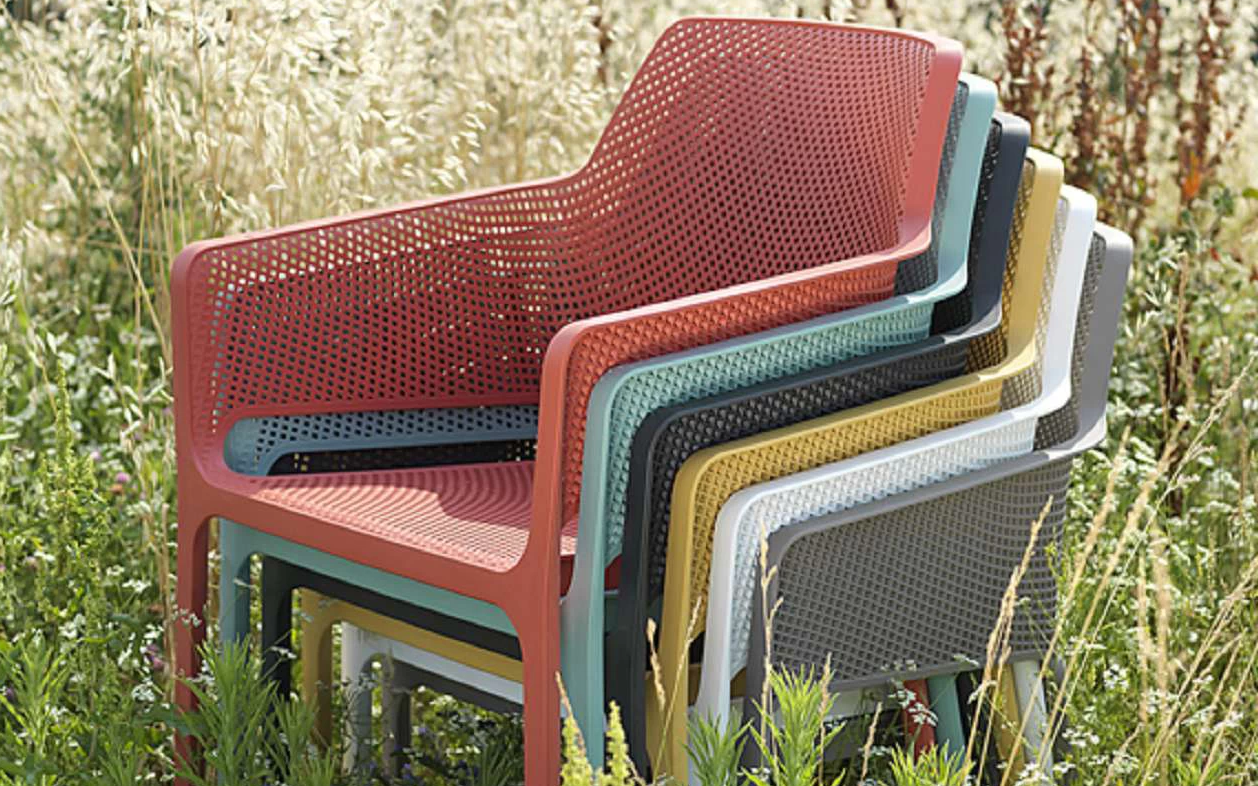 Sztaplowany fotel wykonany z polipropylenu wzmocnionego włóknem szklanym. Nowoczesna forma i wygodne siedzisko oraz materiały powodują, że może być użytkowana cały rok na zewnątrz. W całości wykonana z włókna szklanego oraz z żywicy syntetycznej (żywica polipropylenowa z dodatkami zabezpieczającymi przed promieniowaniem UV, barwiona w masie).