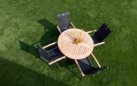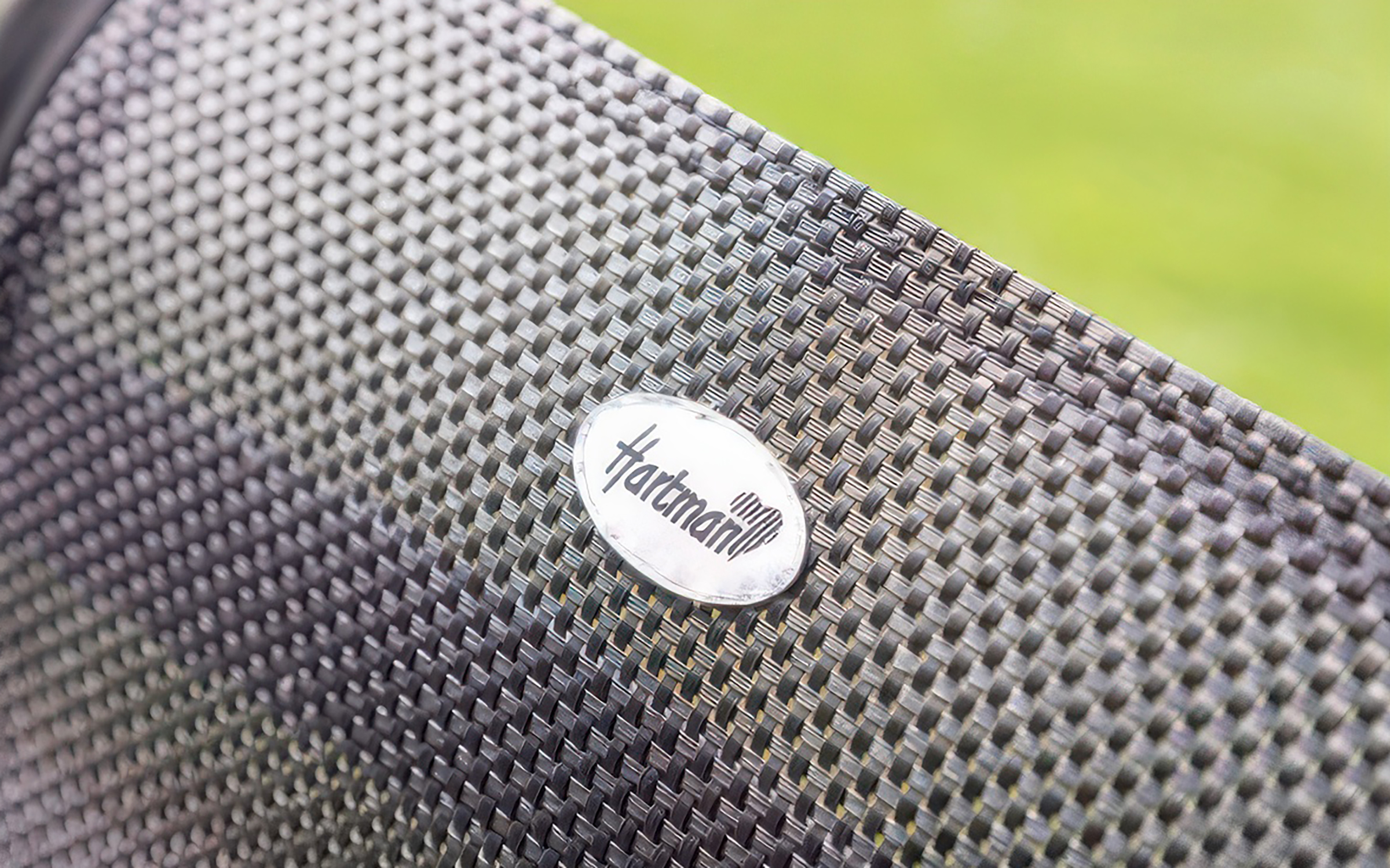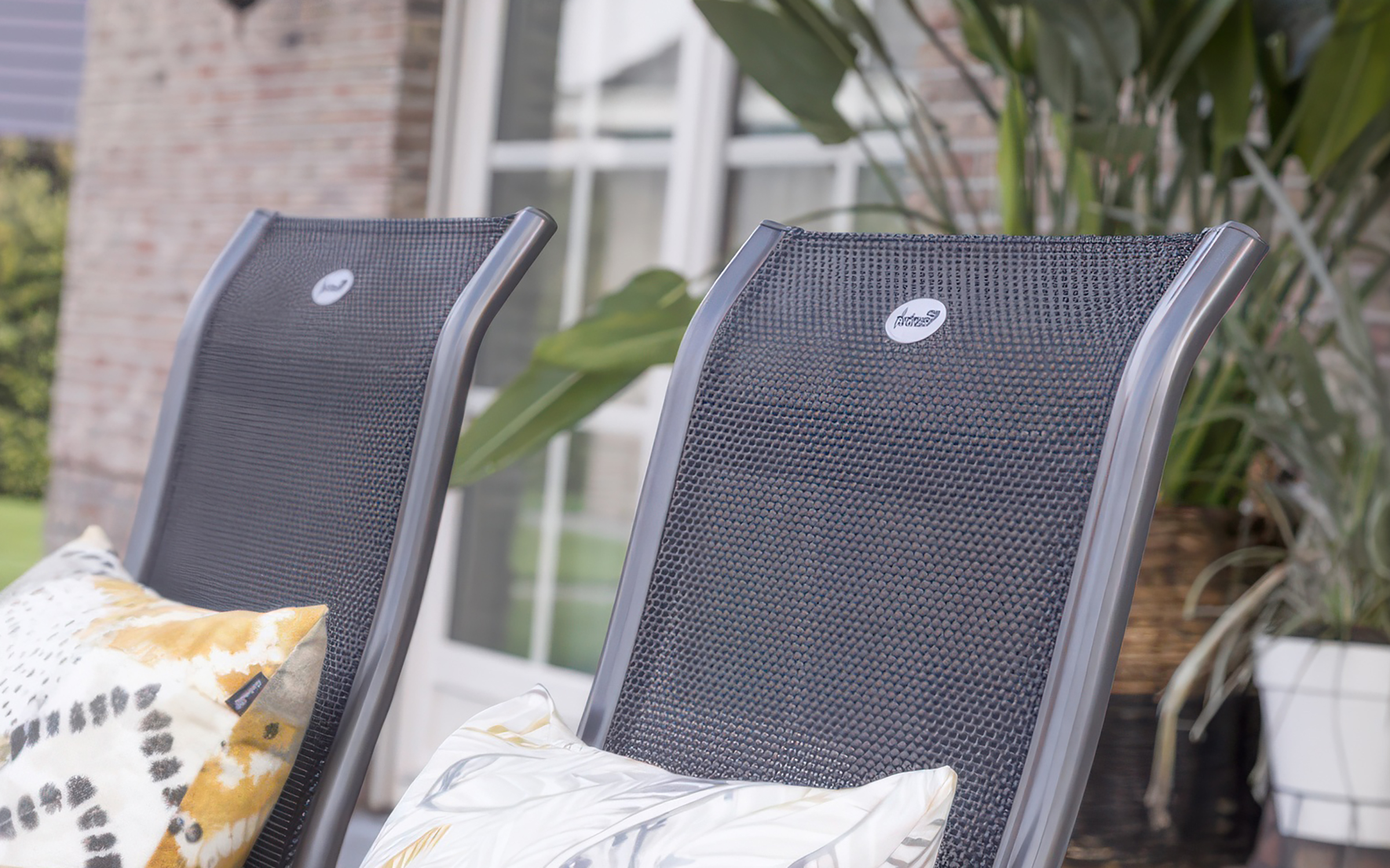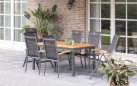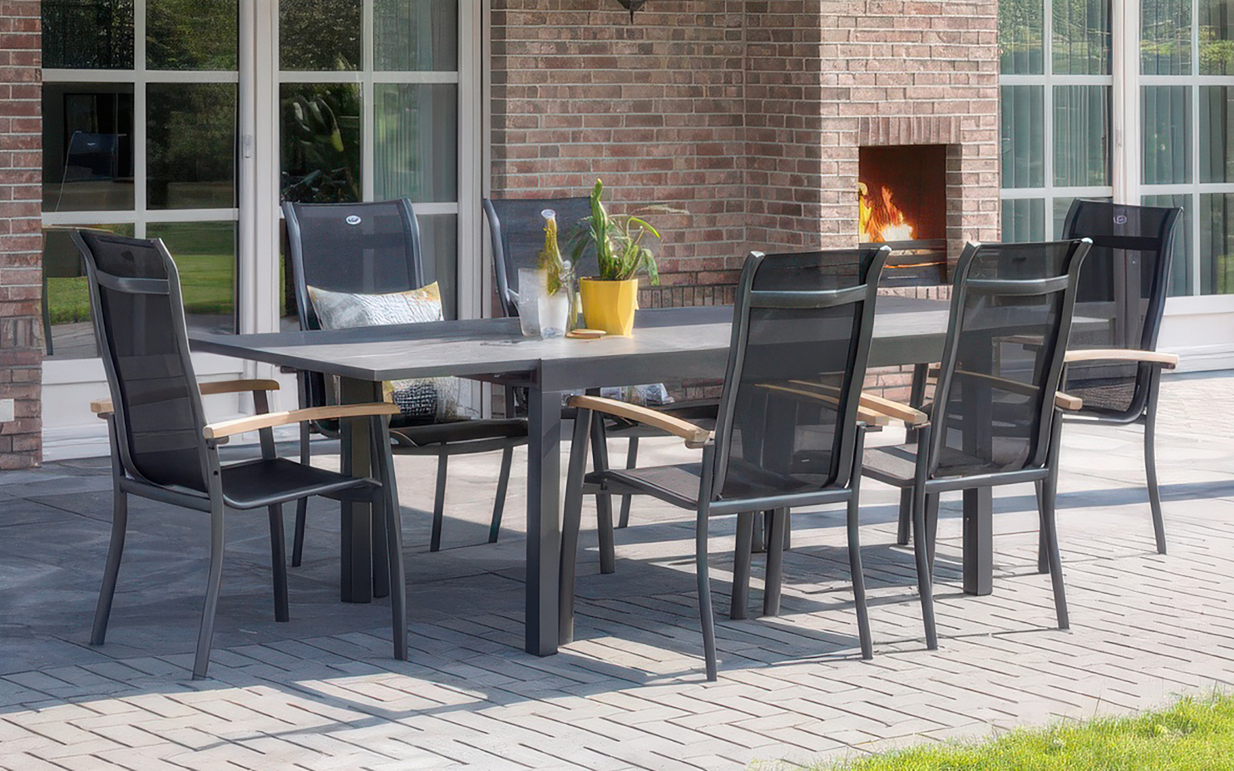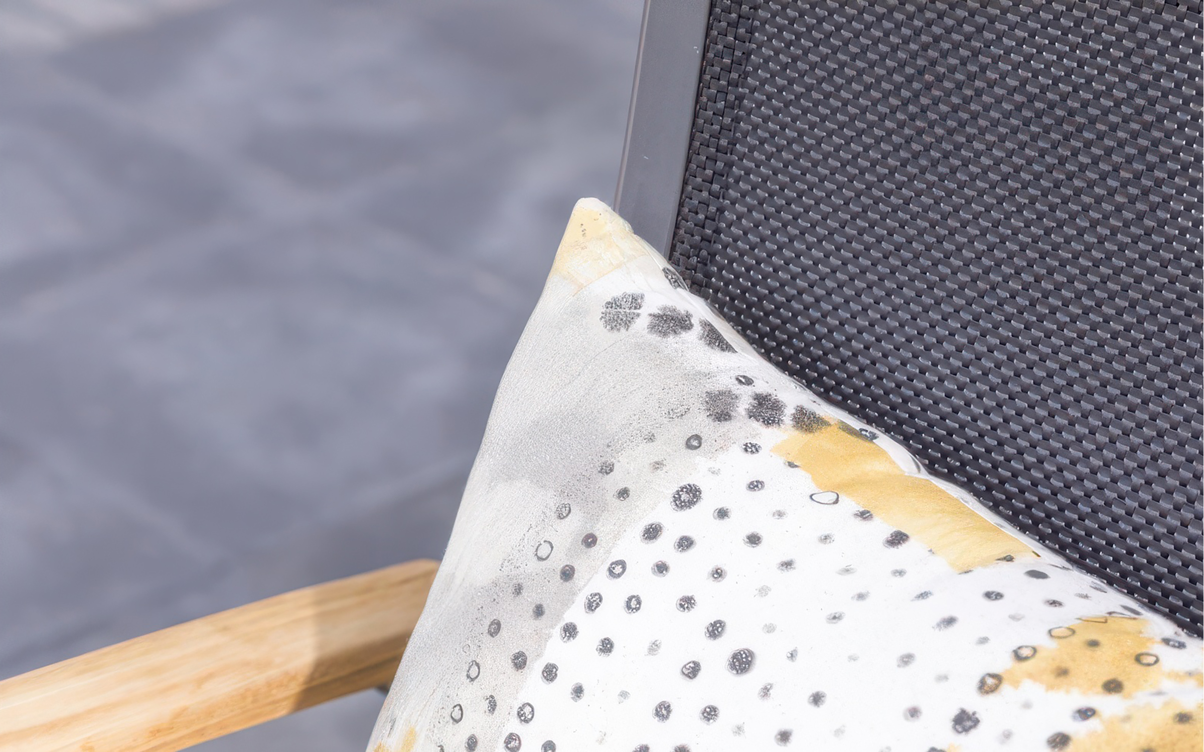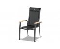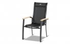 Konstrukcja z aluminium, siedzisko i oparcie z tekstyliny, podłokietniki z certyfikowanego drewna teak. Materiały odporne na wilgoć, promieniowanie UV i zabrudzenia. Łatwe w pielęgnacji, nie wymagają impregnacji.