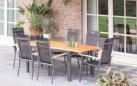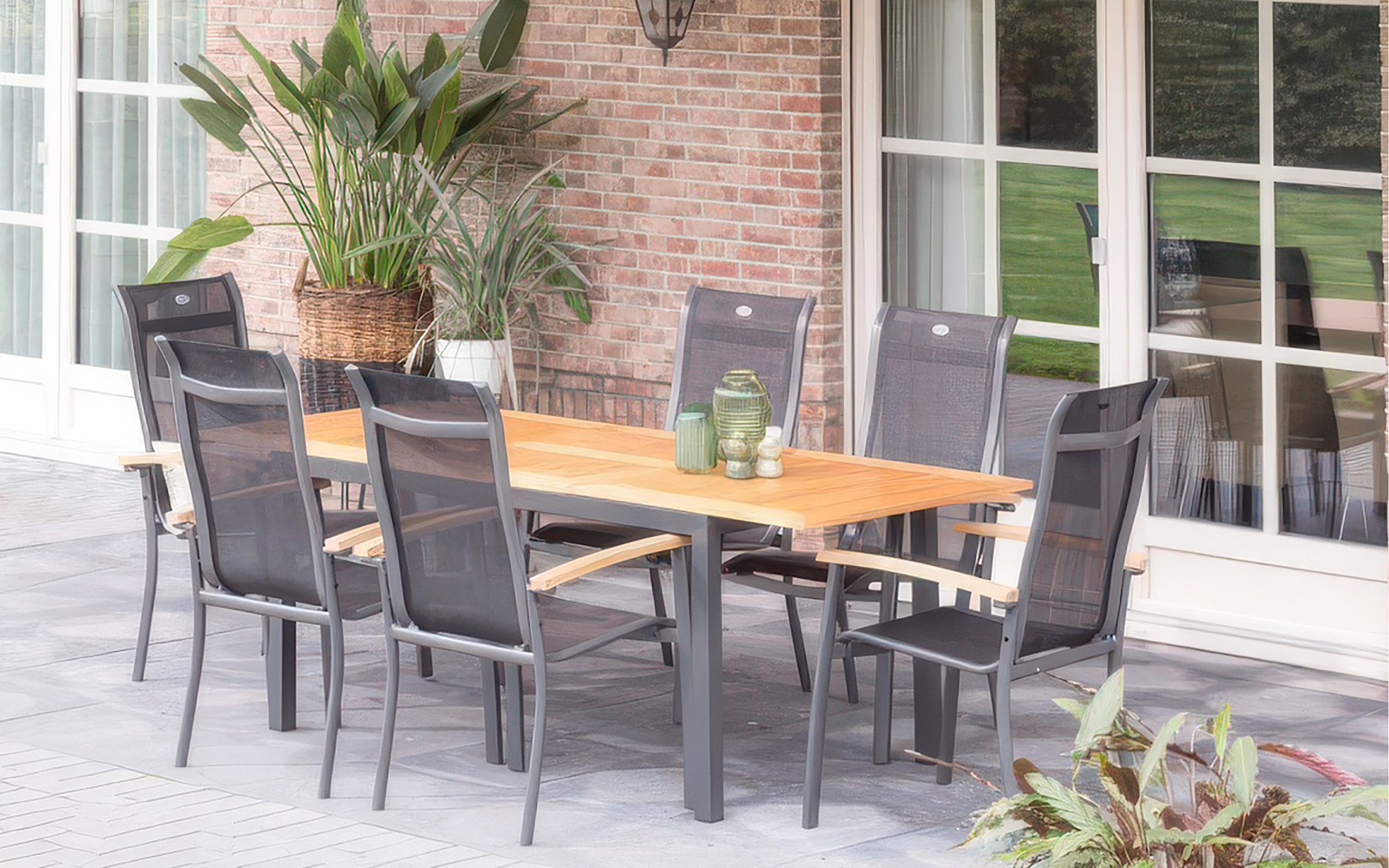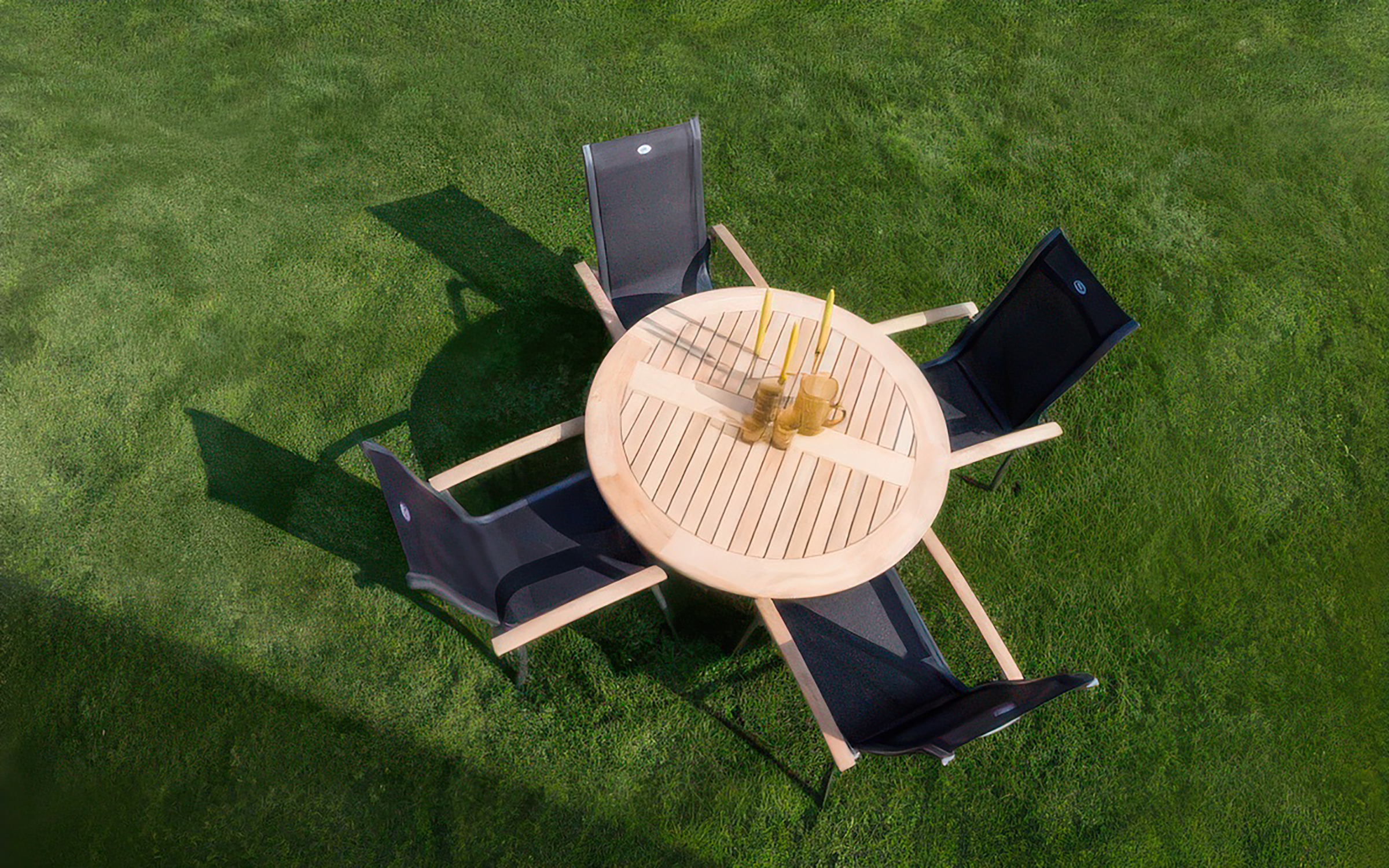 Drewno teakowe zawiera naturalne oleje, dzięki czemu jest odporne na wilgoć i zmiany temperatury. Z czasem może pokryć się srebrnoszarą patyną – to naturalny proces starzenia. Aby zachować oryginalny kolor, zaleca się stosowanie oleju teakowego 1–2 razy w sezonie oraz delikatne czyszczenie miękką szczotką i wodą z łagodnym detergentem.
