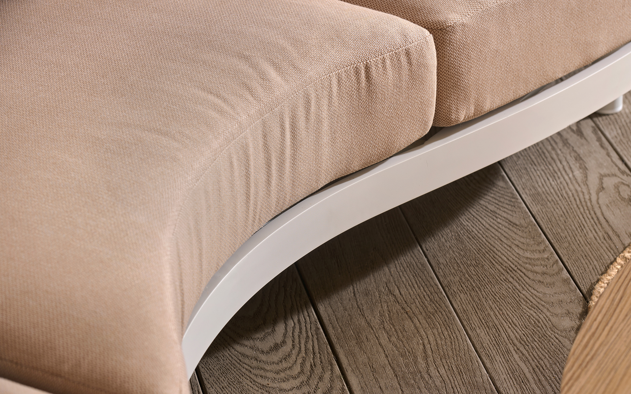 Rama z aluminium malowanego proszkowo. Oplot z wytrzymałej liny rope. Poduszki z tkaniny outdoorowej odpornej na wilgoć i promieniowanie UV.