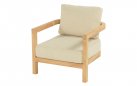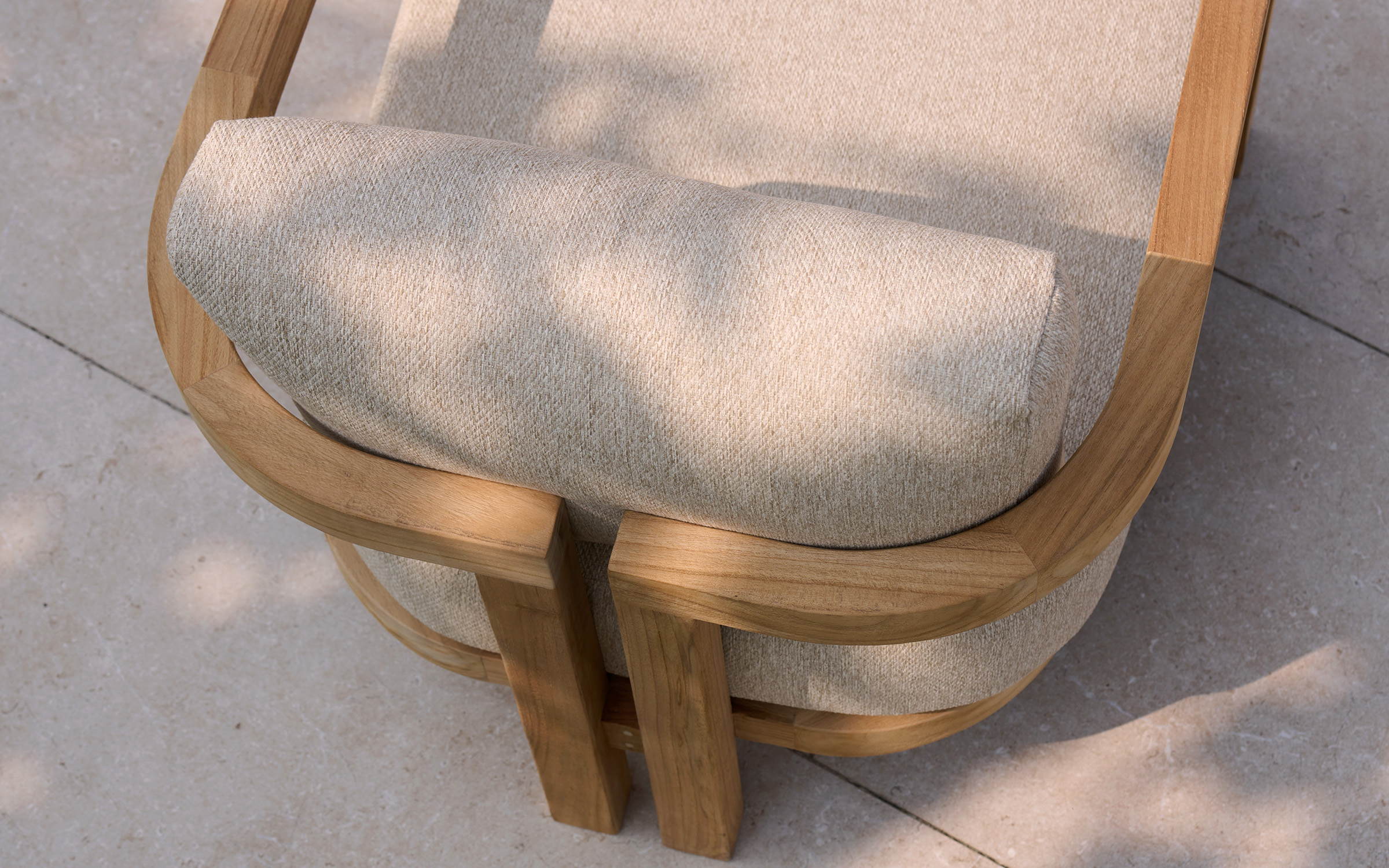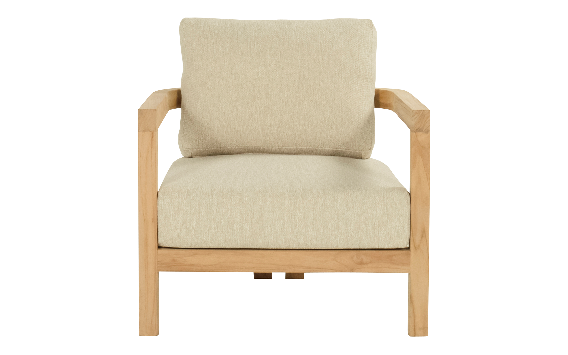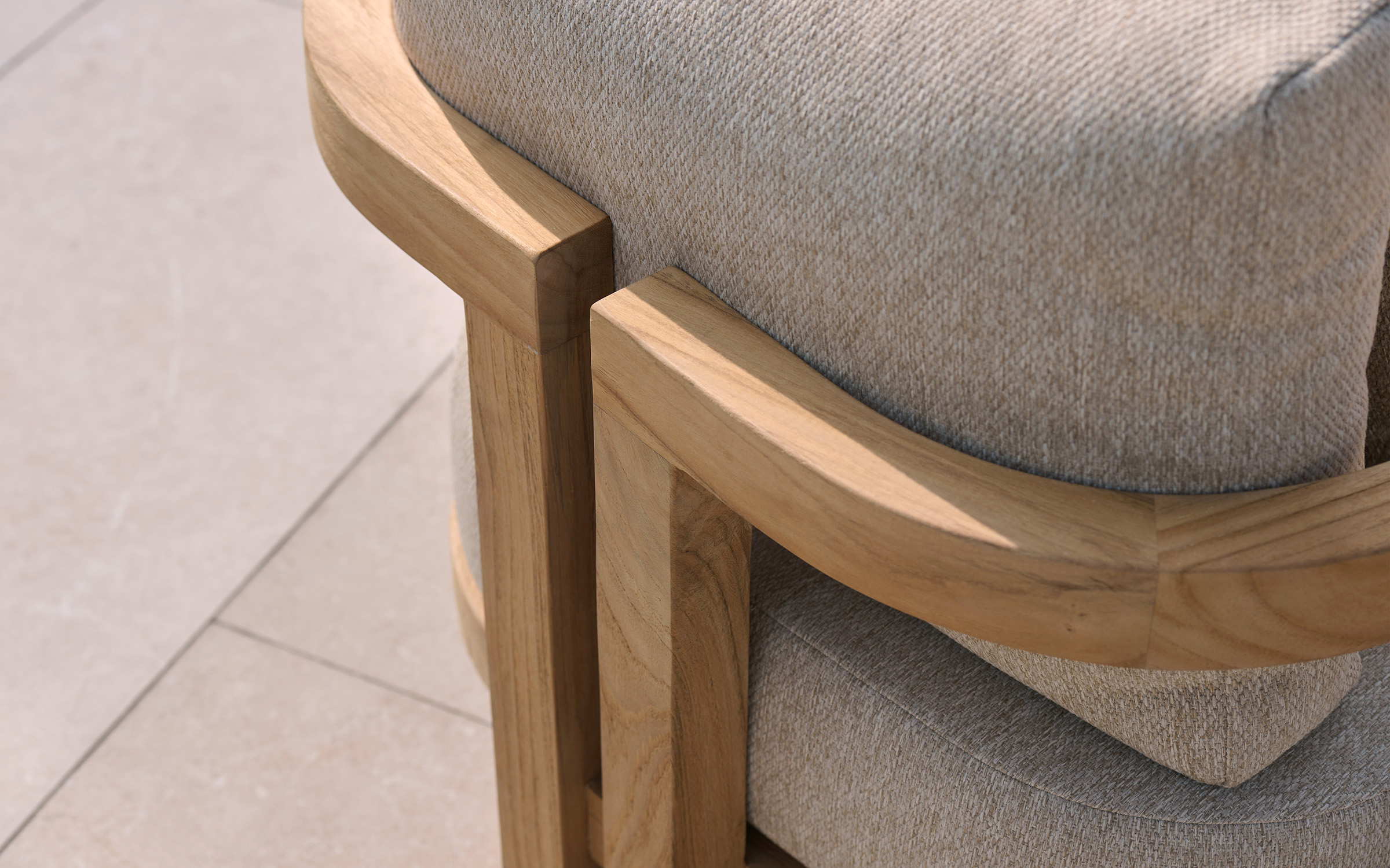 Konstrukcja z drewna teakowego pochodzącego z certyfikowanych plantacji (SVLK) gwarantuje trwałość i odporność na działanie czynników atmosferycznych. Poduszki weatherready wykonano z tkanin wodoodpornych i szybkoschnących, dzięki czemu fotel można użytkować na zewnątrz przez cały sezon.