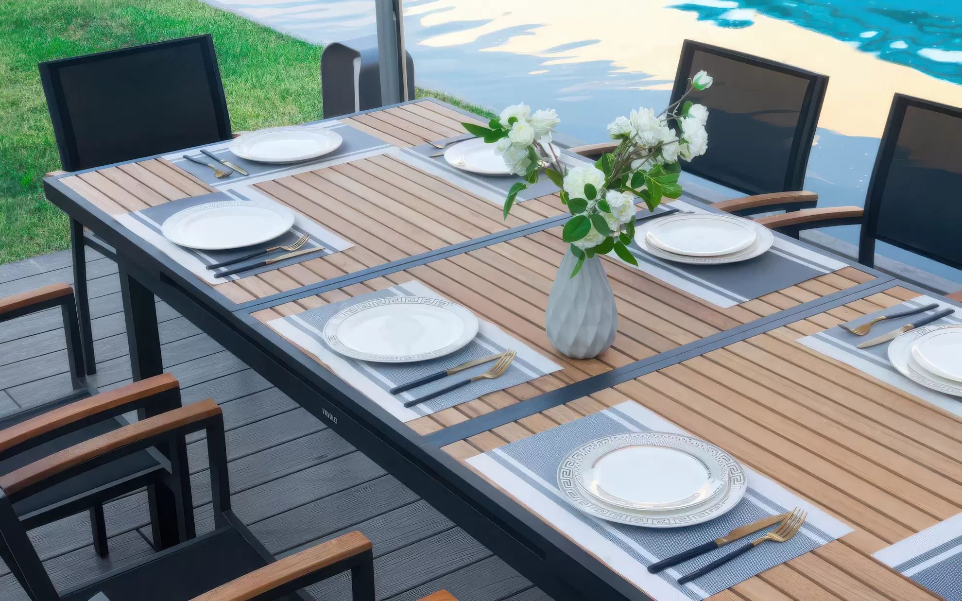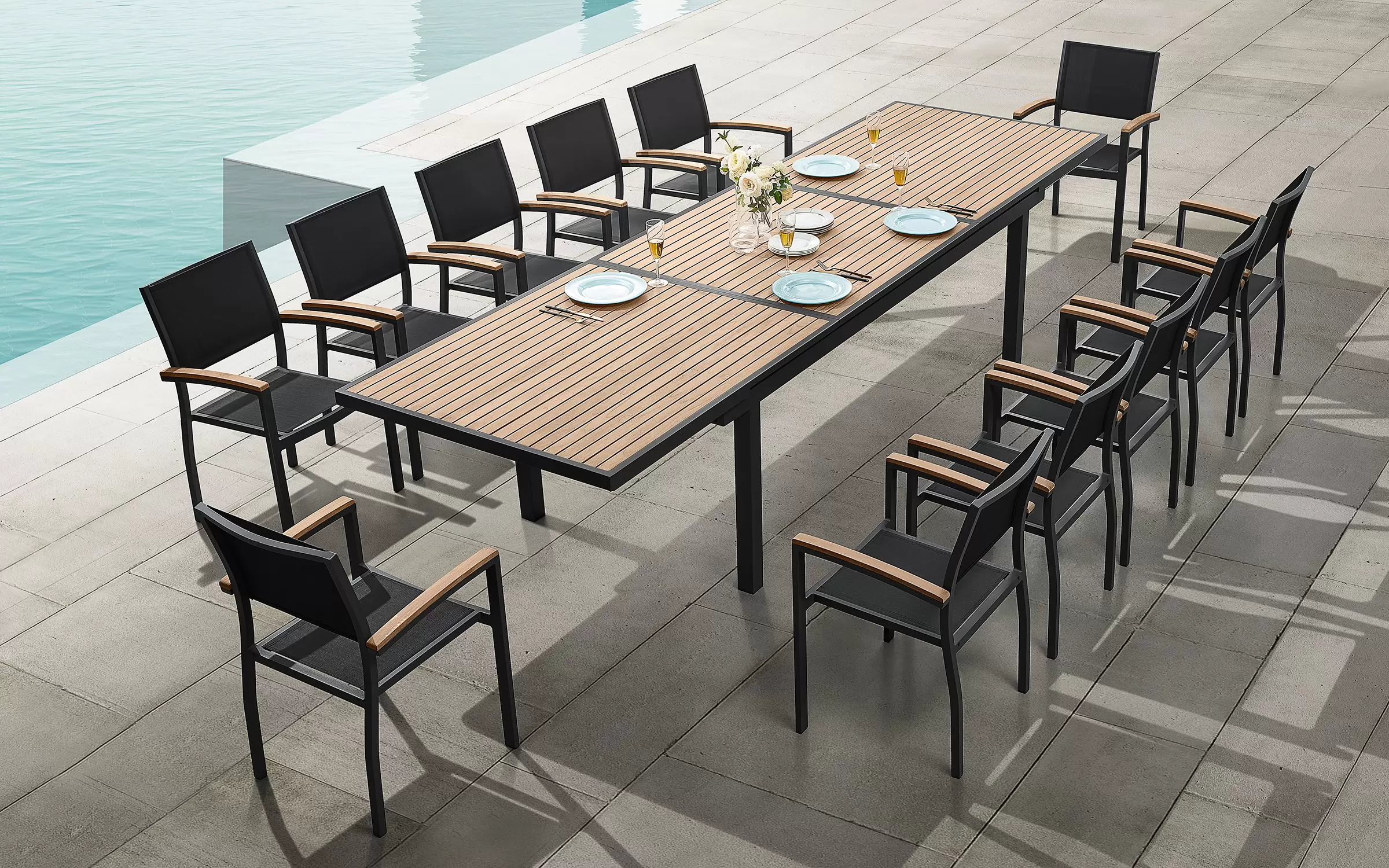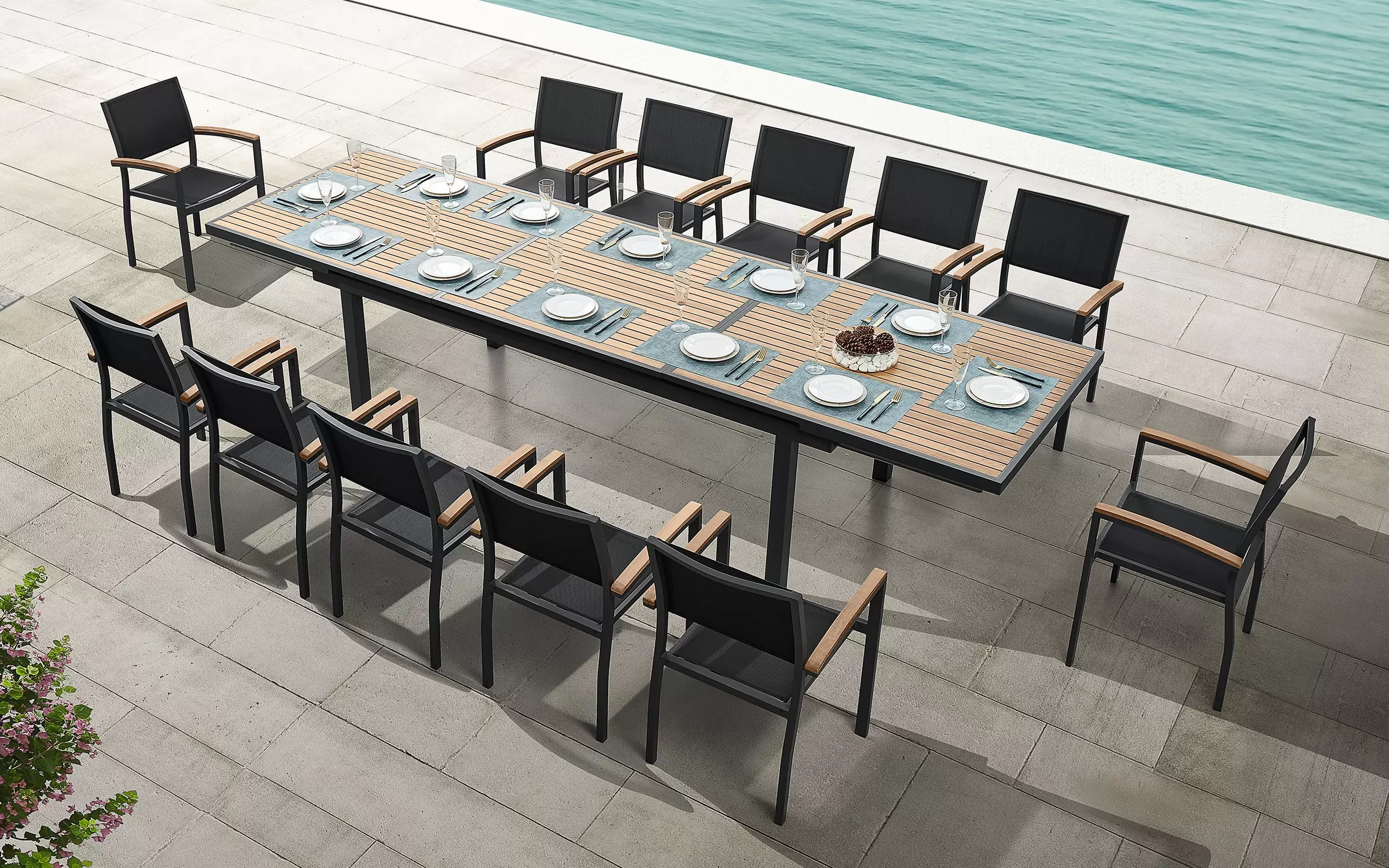 Siedziska i oparcia krzeseł wykonano z jednowarstwowej tekstyliny outdoorowej, odpornej na rozciąganie, promieniowanie UV i codzienne użytkowanie. Stół posiada funkcję rozkładania, dzięki czemu zestaw dostępny jest w dwóch wariantach: dla 8 lub 12 osób.