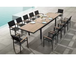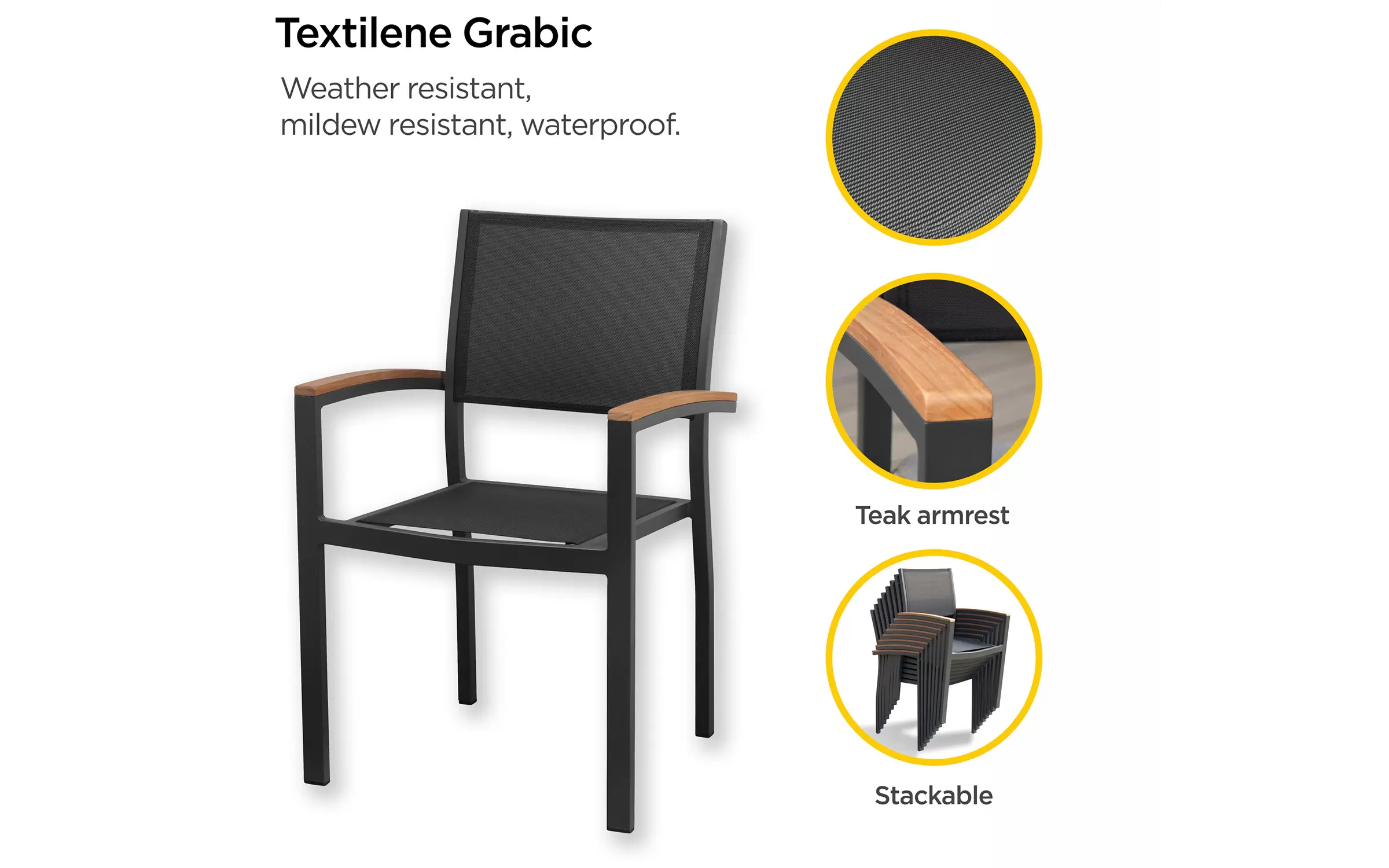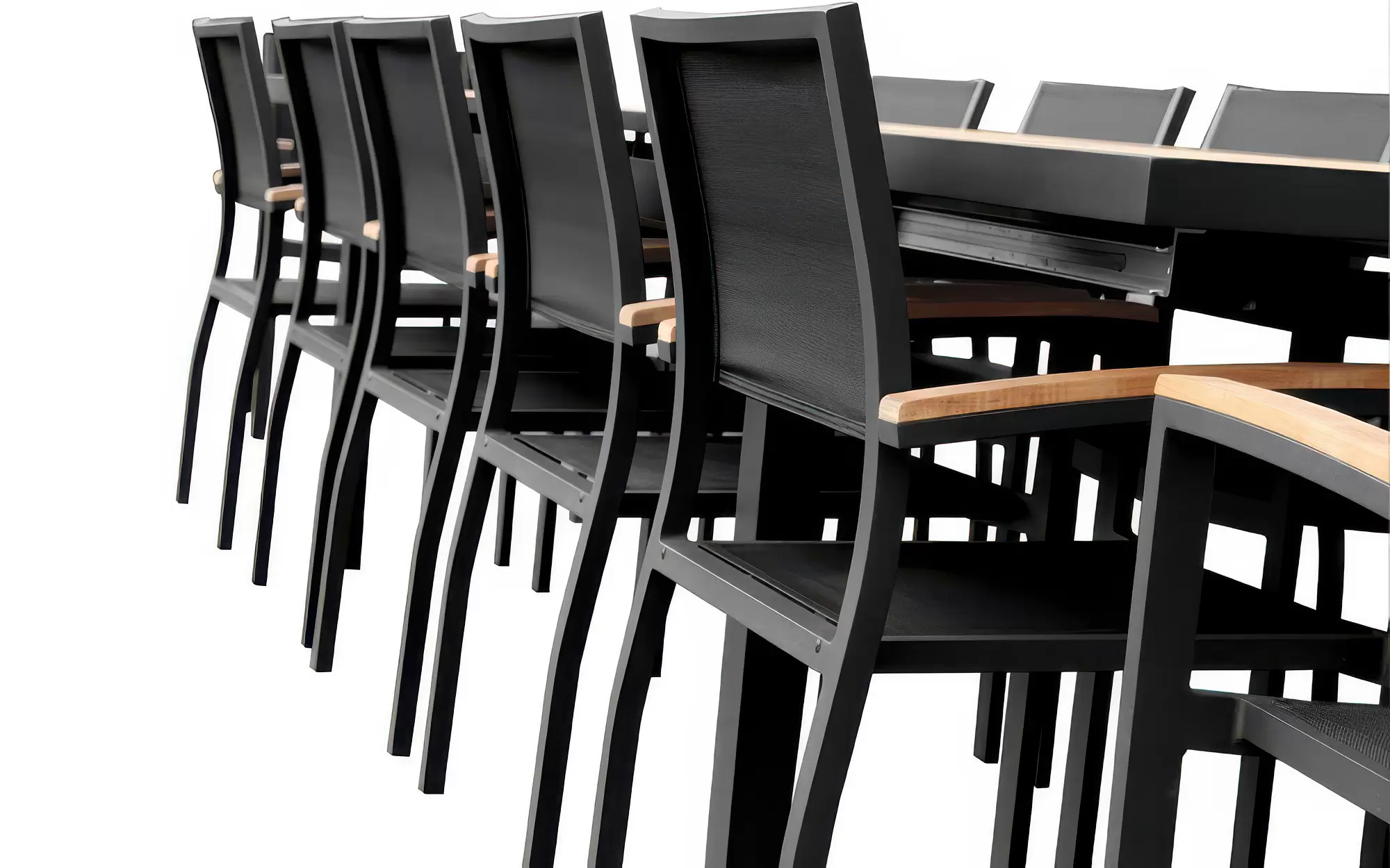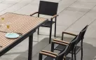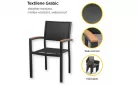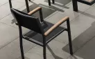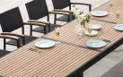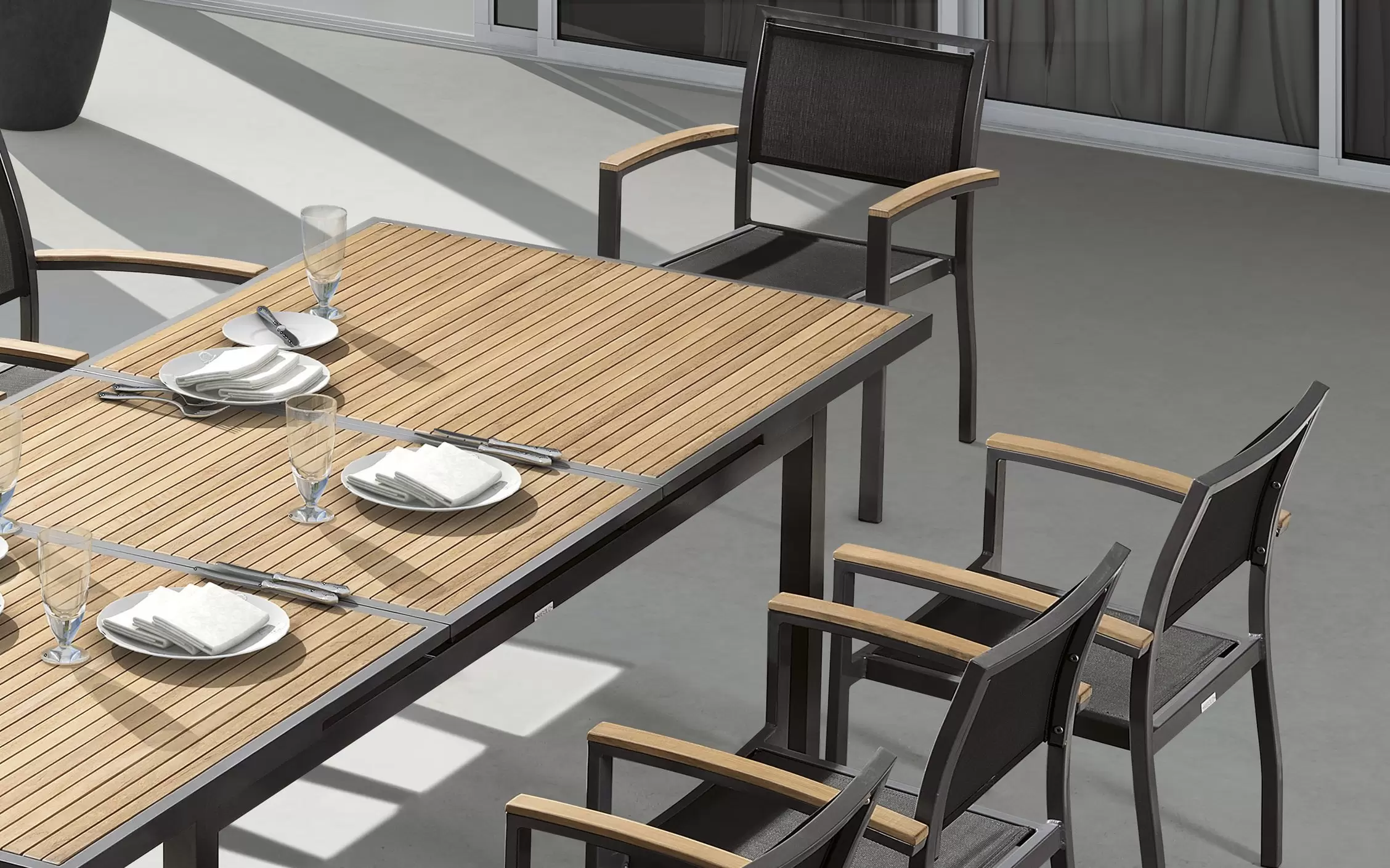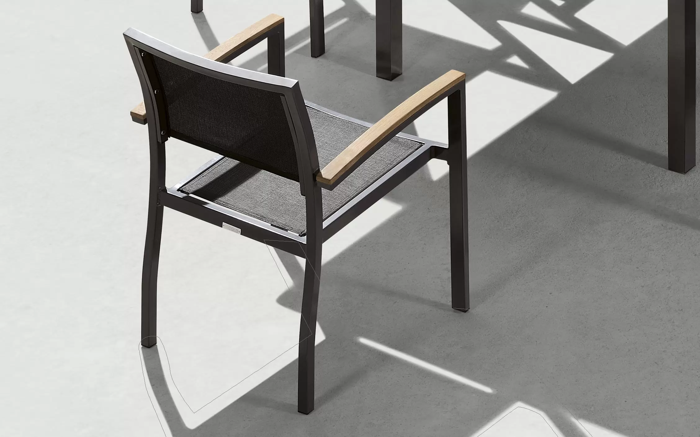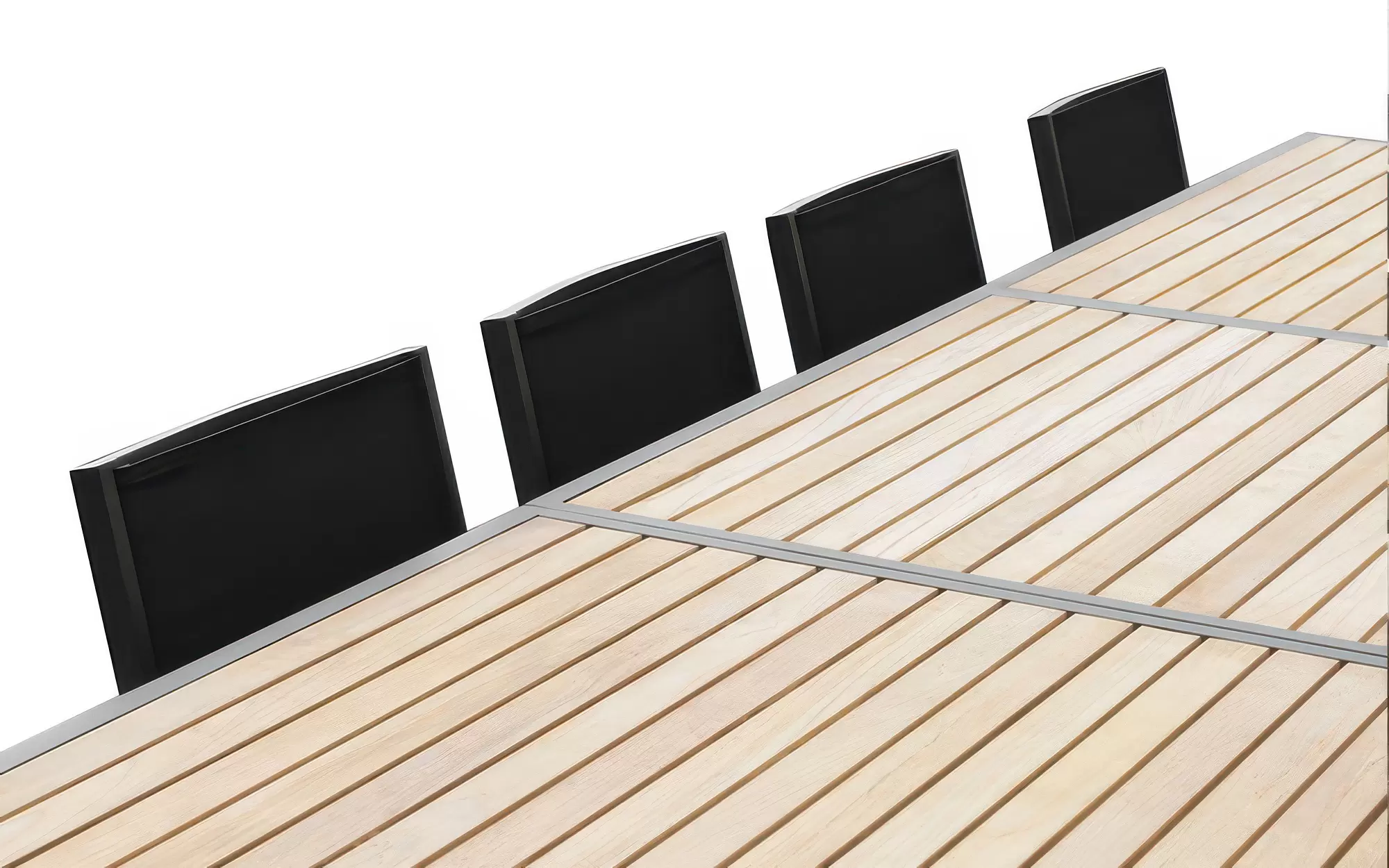 Blat stołu oraz podłokietniki krzeseł wykonano z naturalnego drewna teakowego FSC, cenionego za odporność na wilgoć, trwałość i przyjemną w dotyku powierzchnię. Teak stosowany jest również w branży jachtowej, co potwierdza jego wyjątkową jakość.