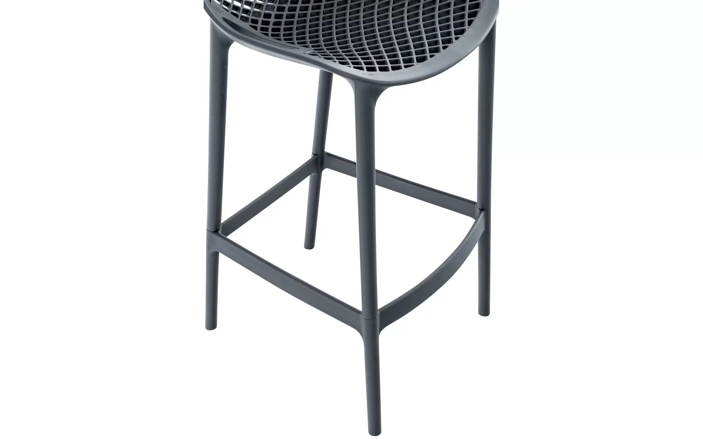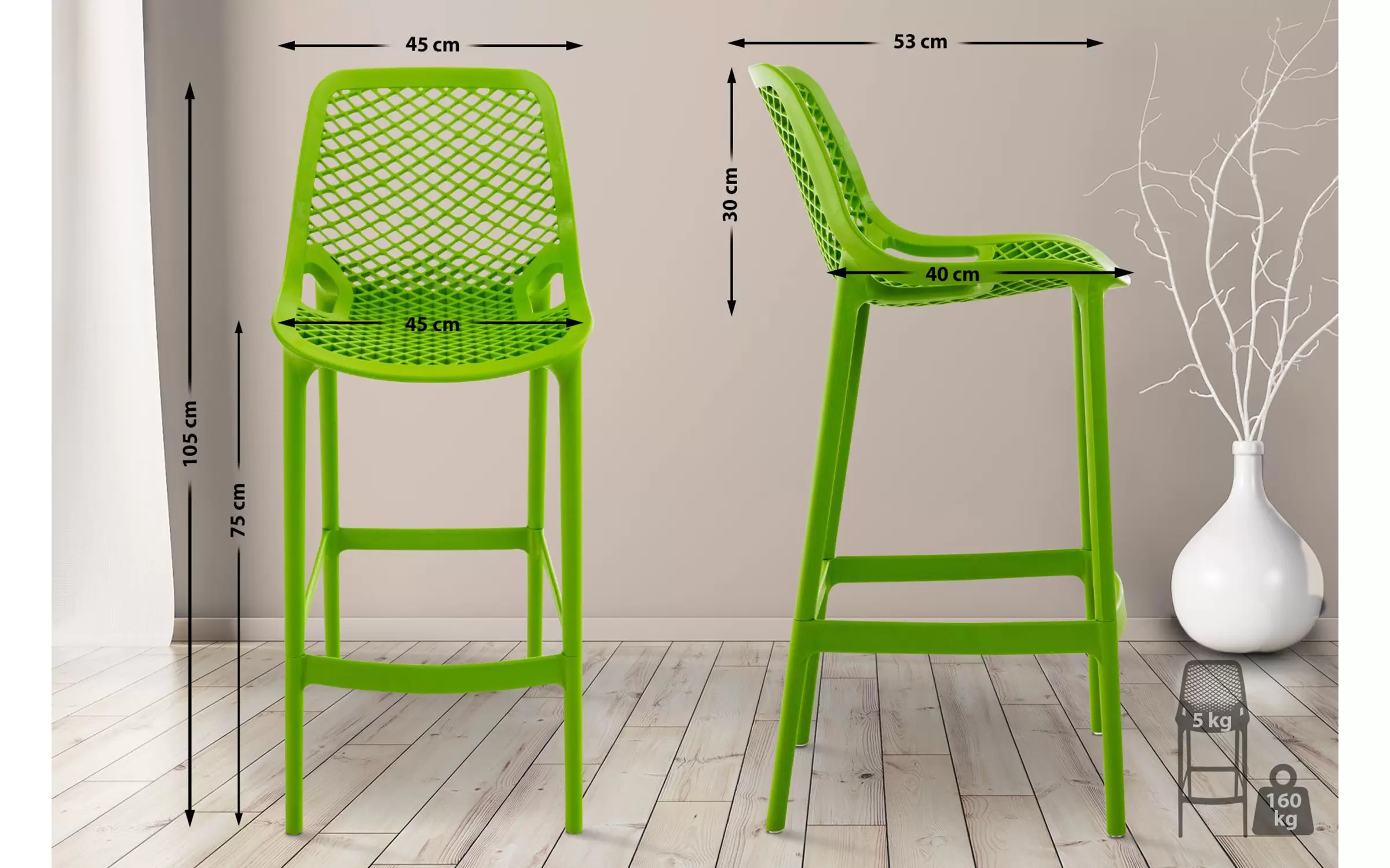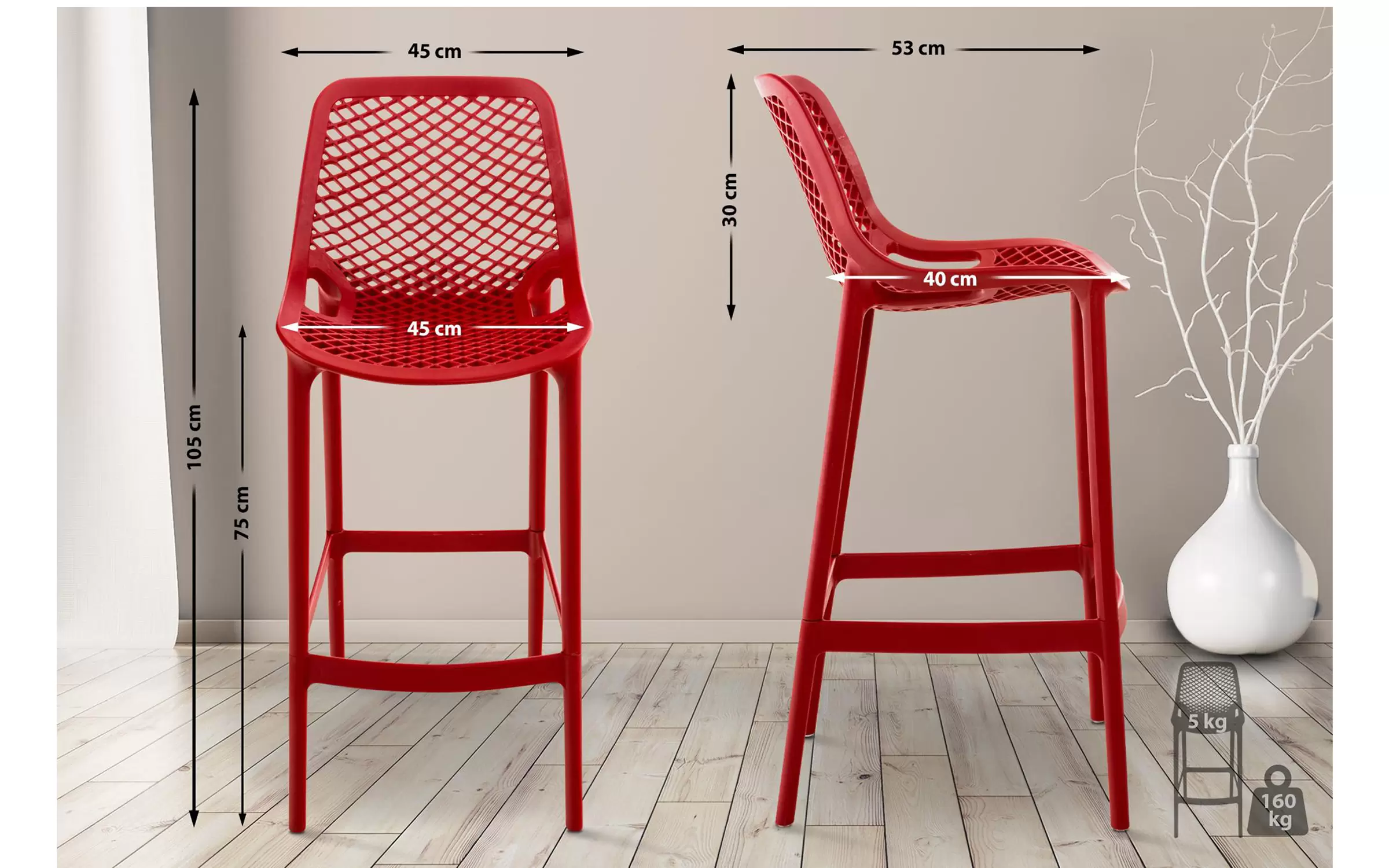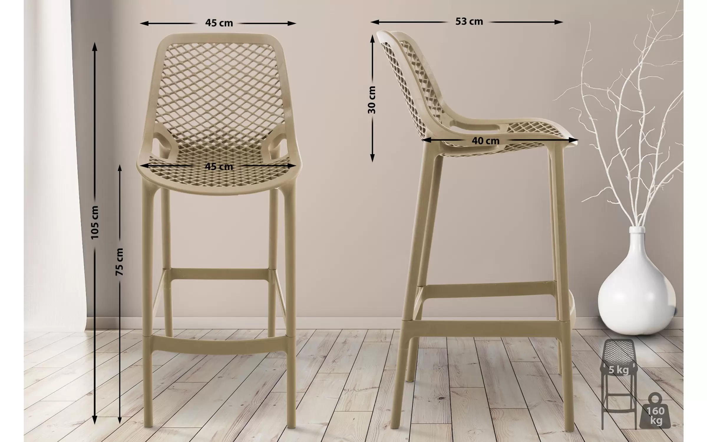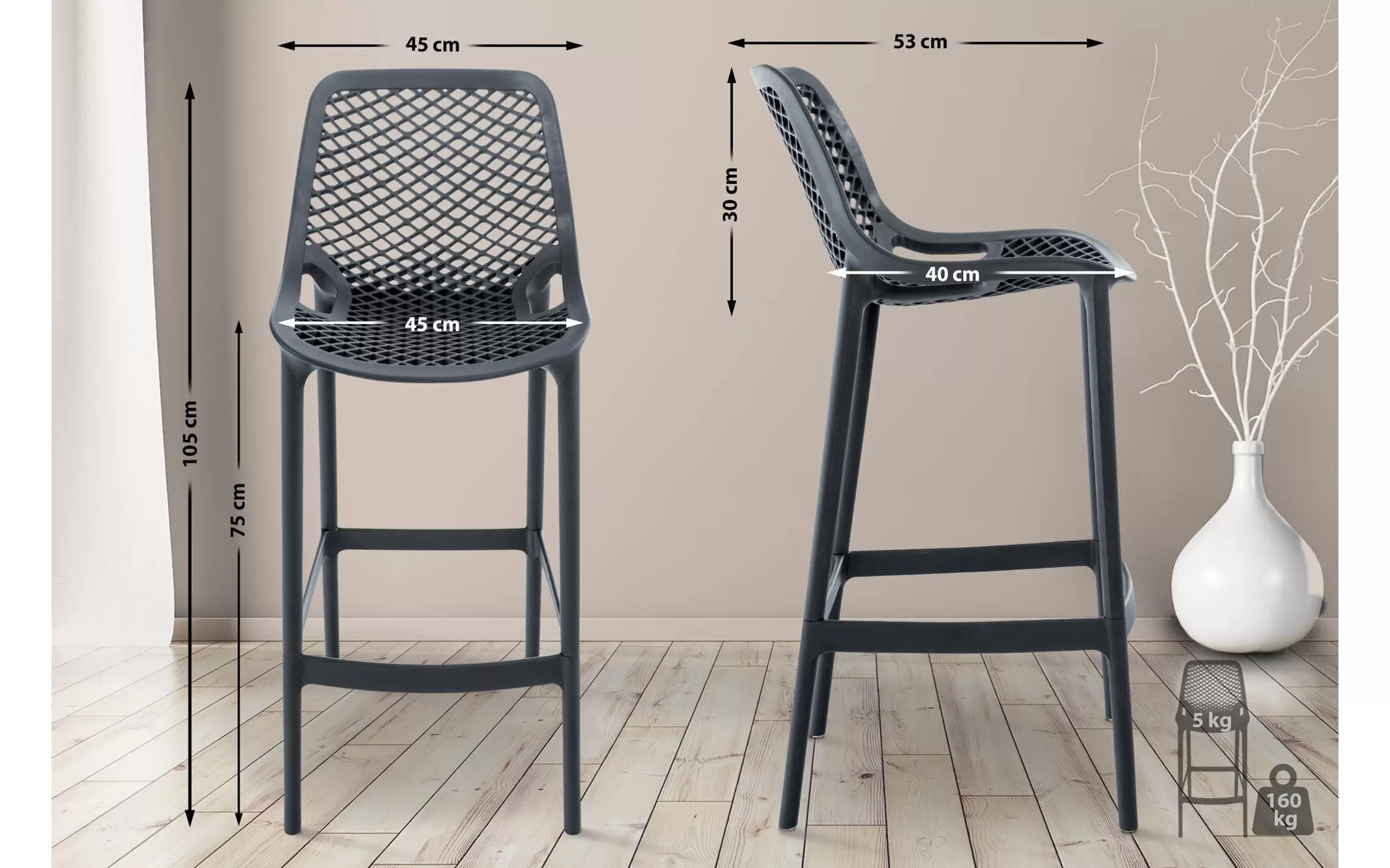 Hoker barowy Air zachwyca nowoczesnym designem i praktycznymi funkcjami. Dzięki minimalistycznemu wyglądowi pasuje do każdego pomieszczenia mieszkalnego i nadaje się zarówno do użytku wewnątrz, jak i na zewnątrz. Stołek wykonany jest z polipropylenu – wysokiej jakości tworzywa sztucznego, które jest wodoodporne i odporne na promieniowanie UV. Nawet częste i intensywne światło słoneczne nie powoduje żółknięcia i blaknięcia plastiku. Głębia koloru mebli zostaje zachowana na długo. Ergonomiczny kształt stołka barowego zapewnia wygodne siedzenie nawet przez kilka godzin. Wysokość siedziska wynosząca 75 cm jest idealna do stosowania na ladach lub ladach. Otaczający podstawę podnóżek zapewnia dodatkowy komfort.