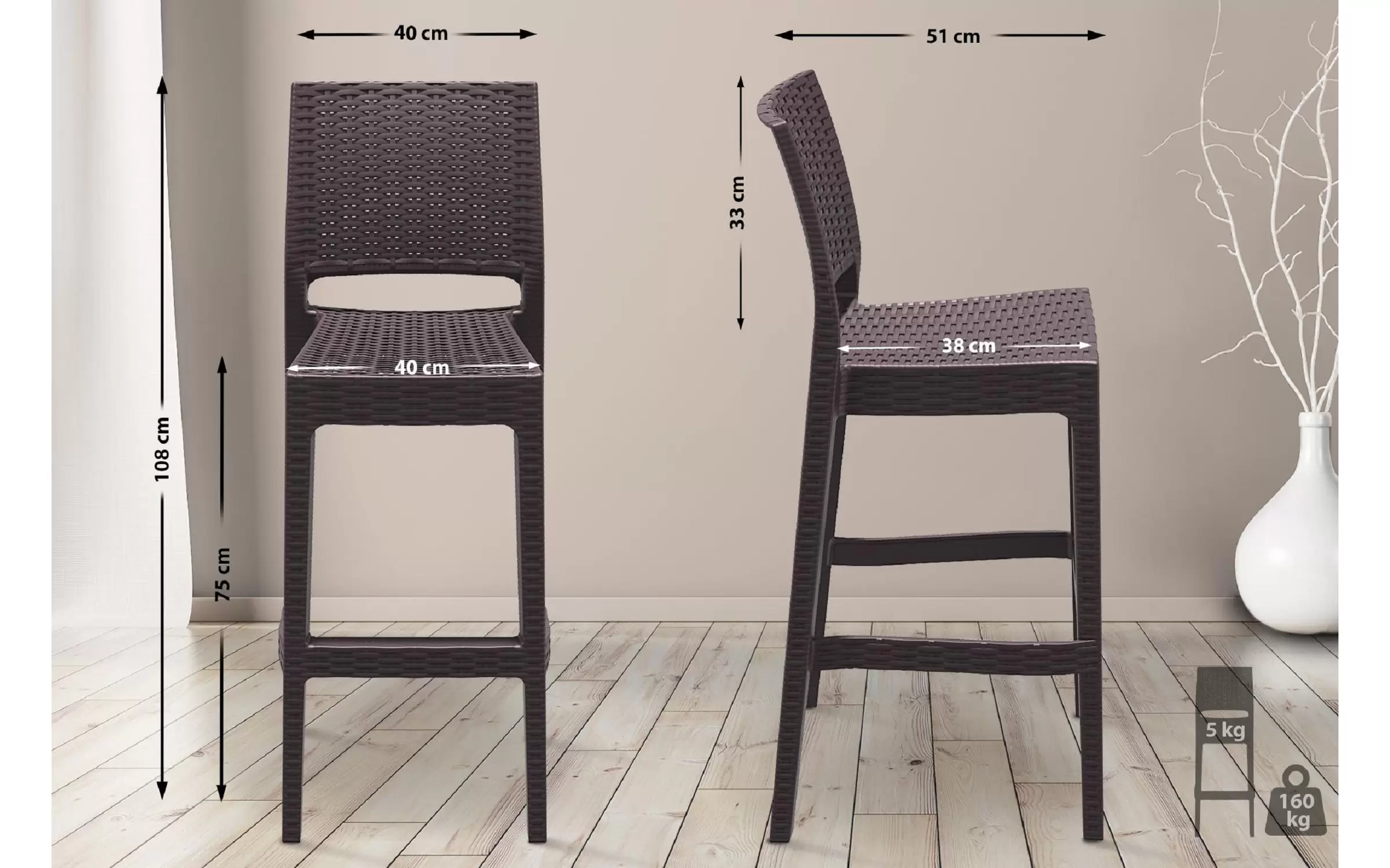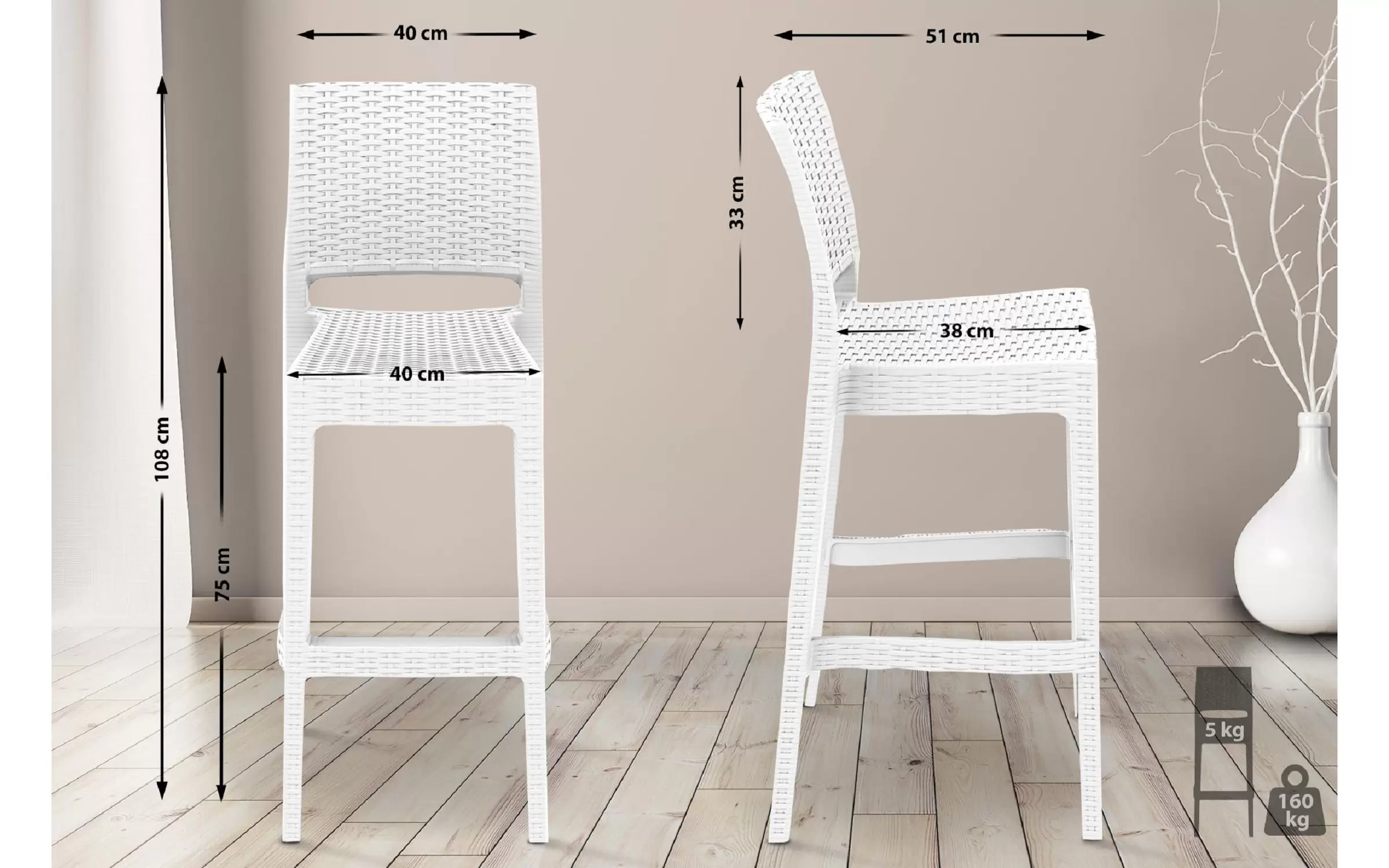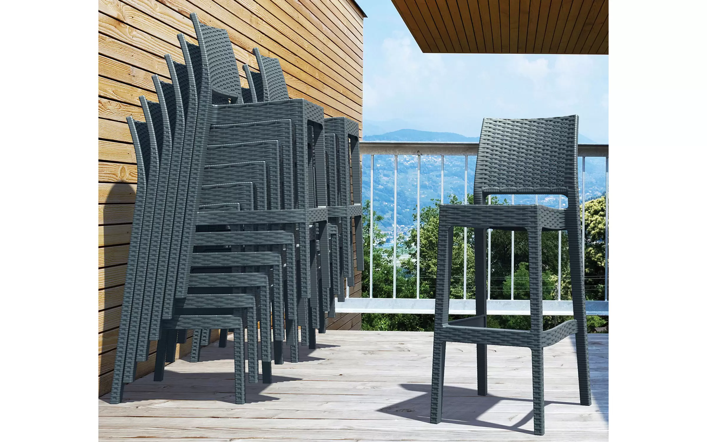 Stołki barowe wykonane są z wodoodpornego i odpornego na promieniowanie UV tworzywa sztucznego, dzięki czemu są całkowicie odporne na warunki atmosferyczne i plamy, brud i wilgoć. Nawet częste i intensywne światło słoneczne nie powoduje żółknięcia i blaknięcia plastiku. Głębia koloru stołków barowych zostaje zachowana na długo. Czteronożna rama posiada poprzeczki, które z jednej strony zapewniają stabilność, a z drugiej mogą pełnić funkcję podnóżka.