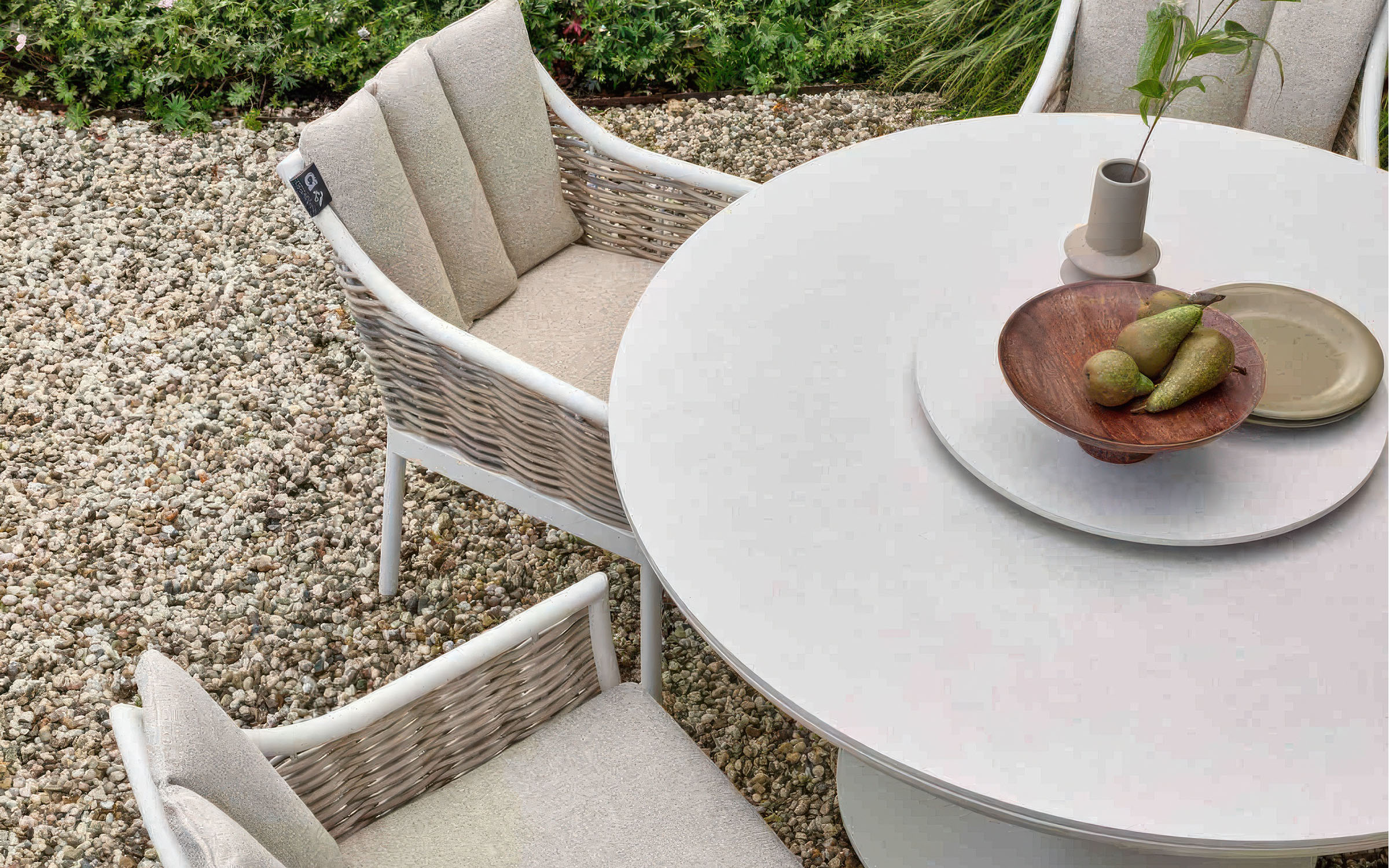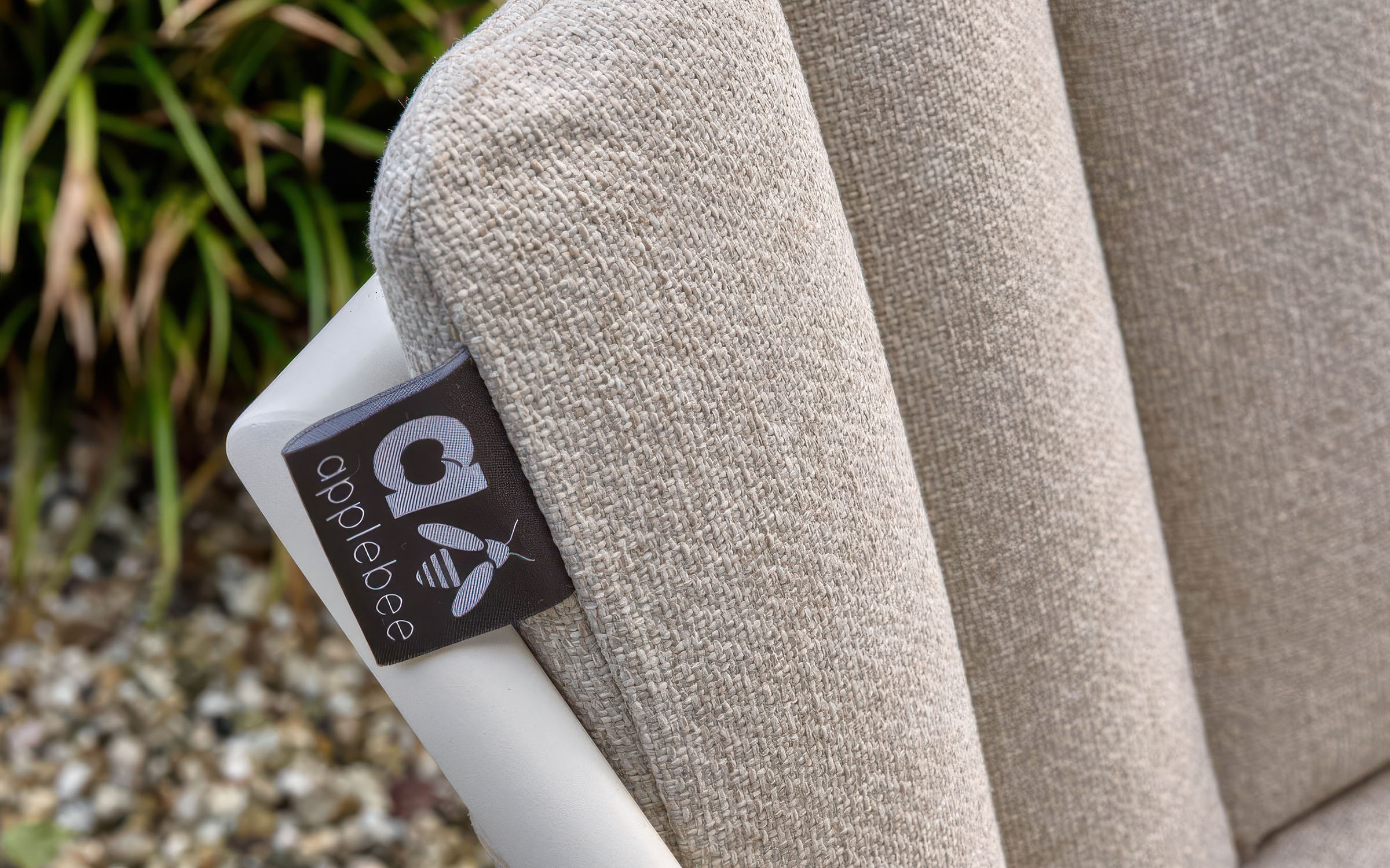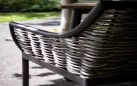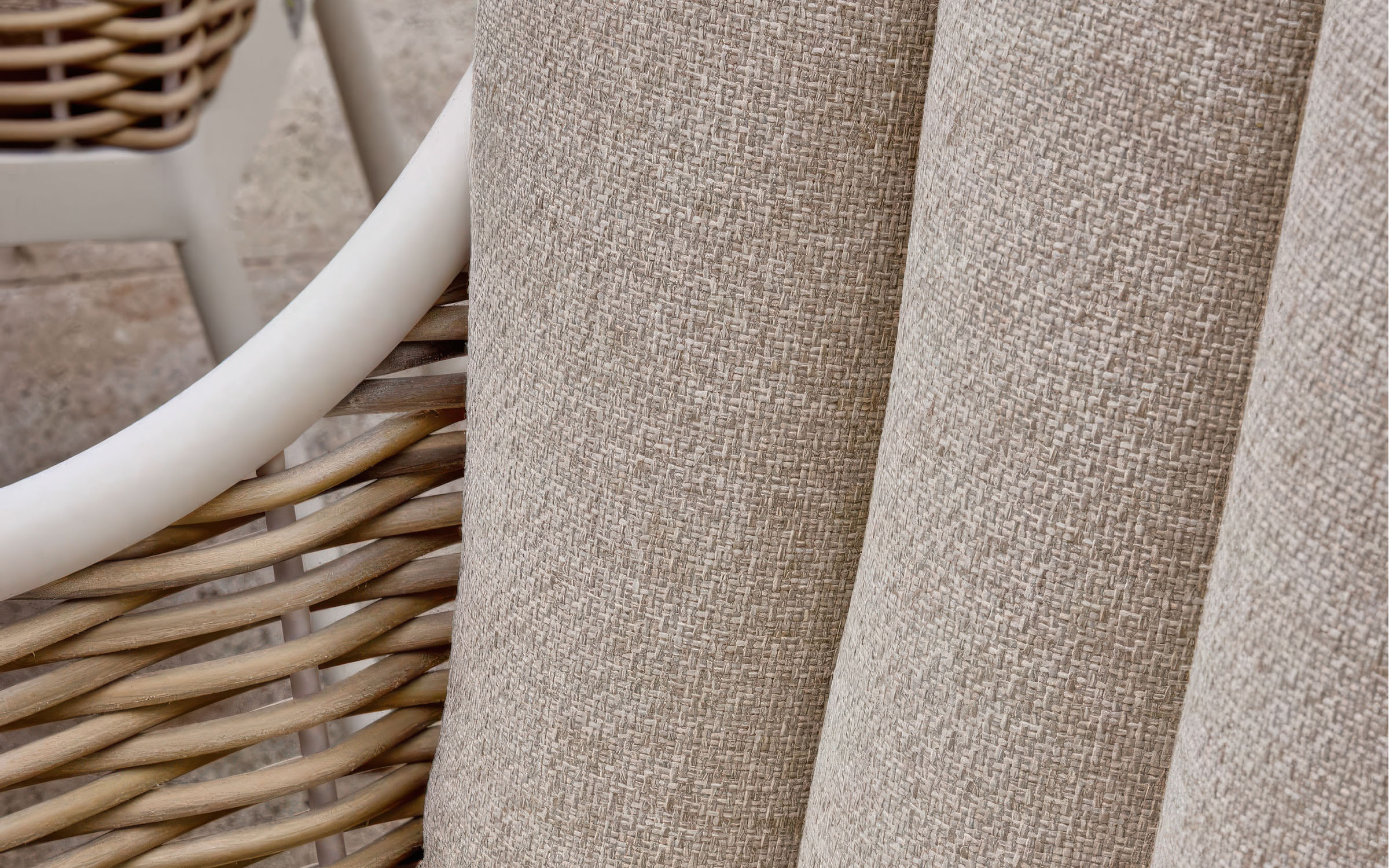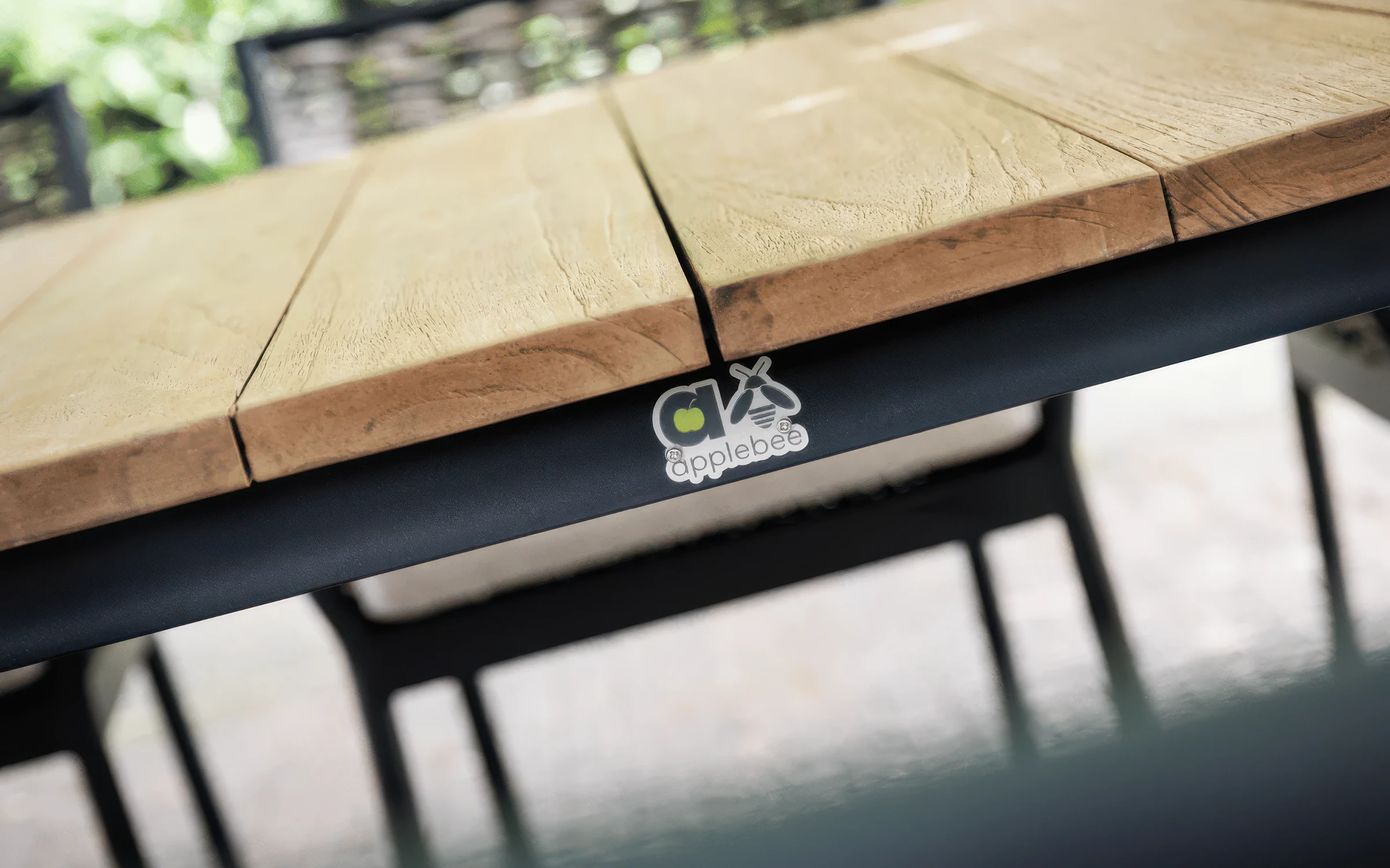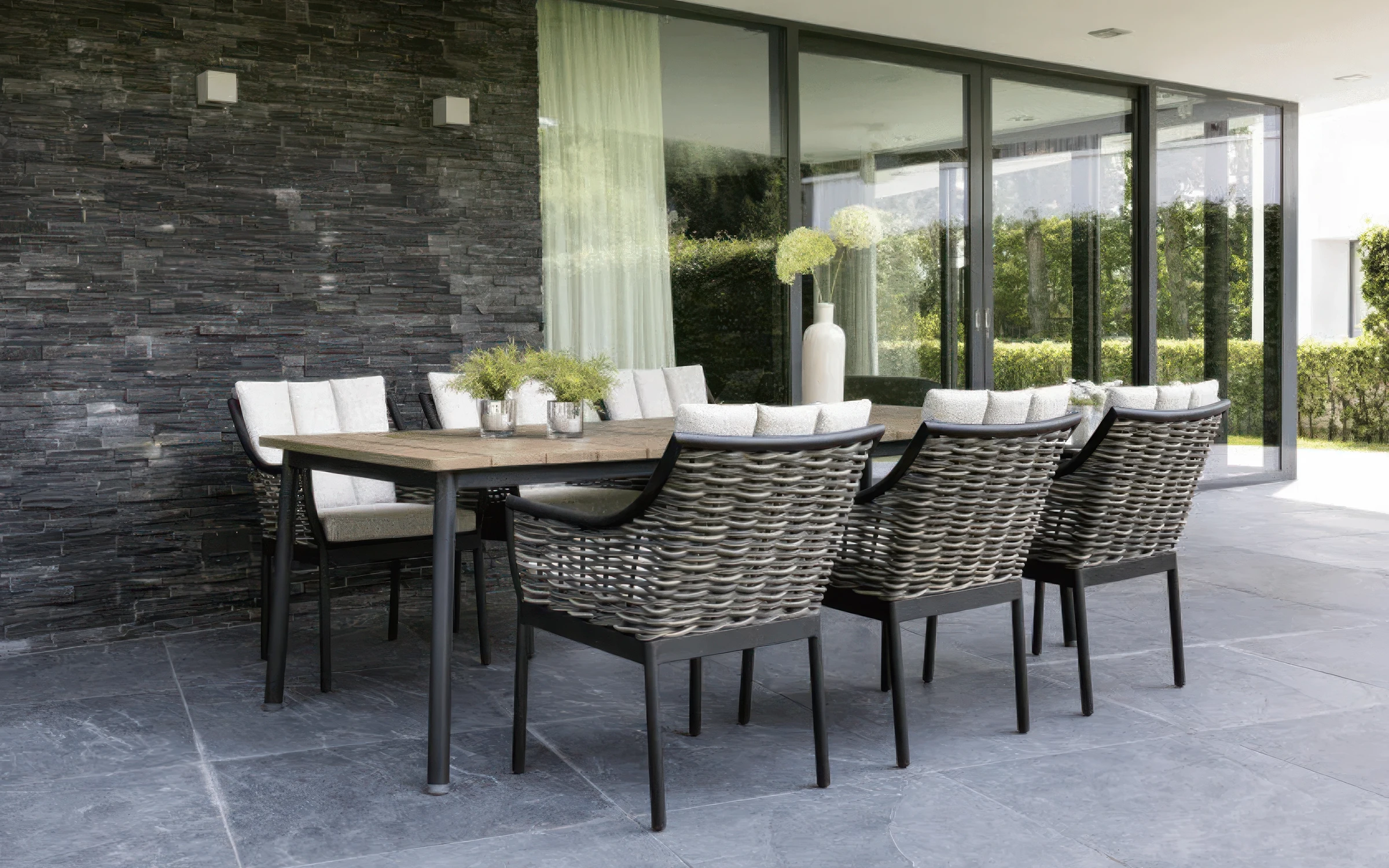 Konstrukcja z aluminium malowanego proszkowo – lekka, trwała i odporna na korozję. Oplot z technorattanu Willow Wave – syntetyczne włókno odporne na wilgoć, promieniowanie UV i zmienne warunki atmosferyczne. Blat z drewna teak – naturalny, odporny na warunki zewnętrzne, z czasem nabiera szlachetnej patyny. Poduszki z wypełnieniem Bee Wett – szybkoschnąca pianka o otwartej strukturze. Poszewki z tkaniny Olefin – odporne na zabrudzenia, pleśń i blaknięcie.