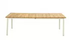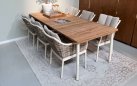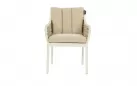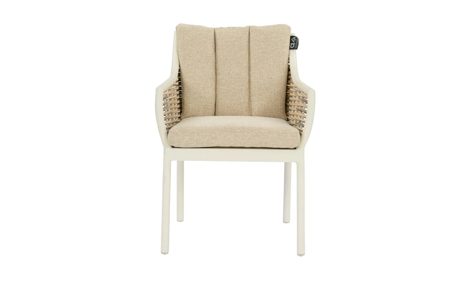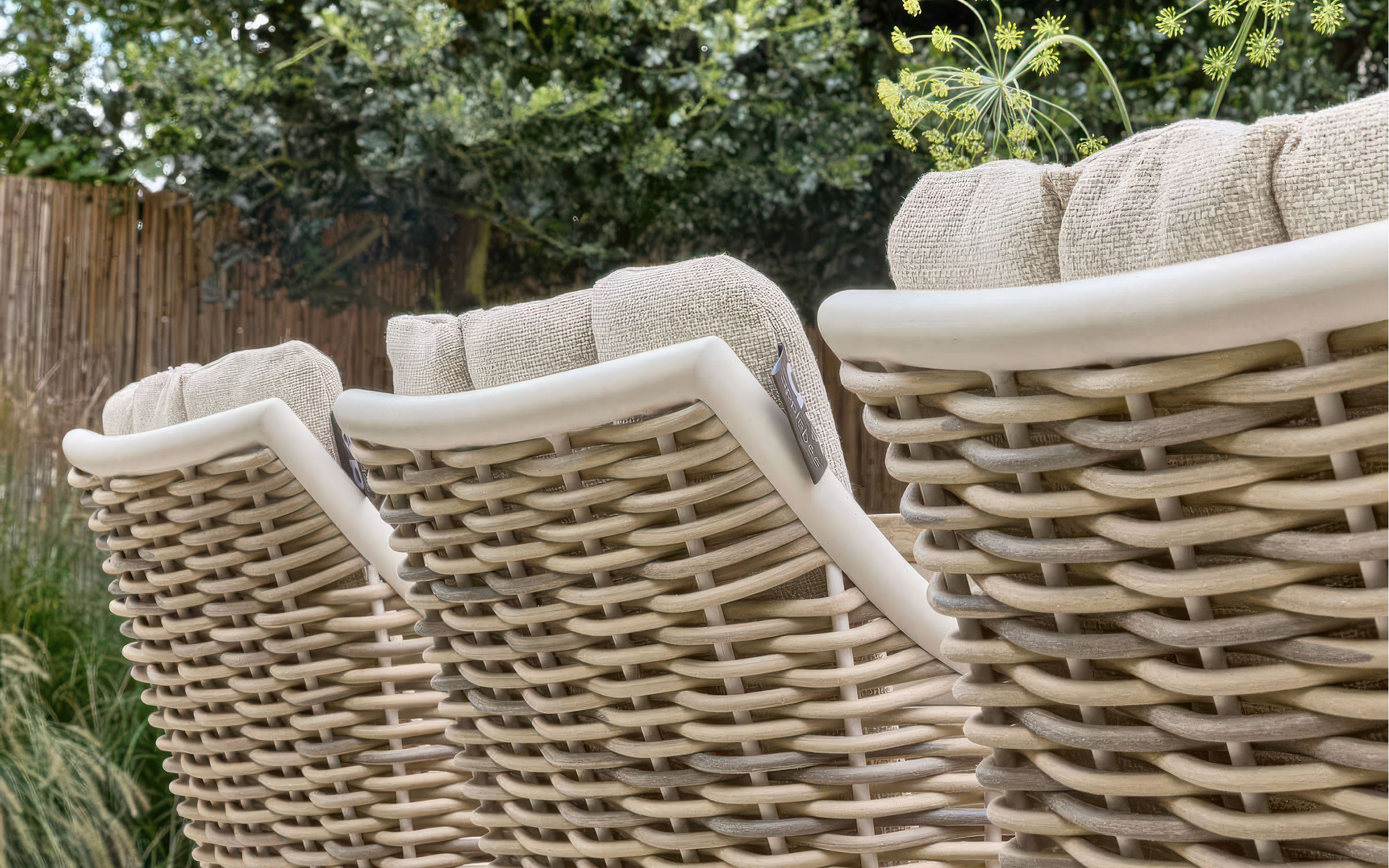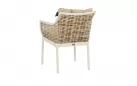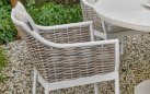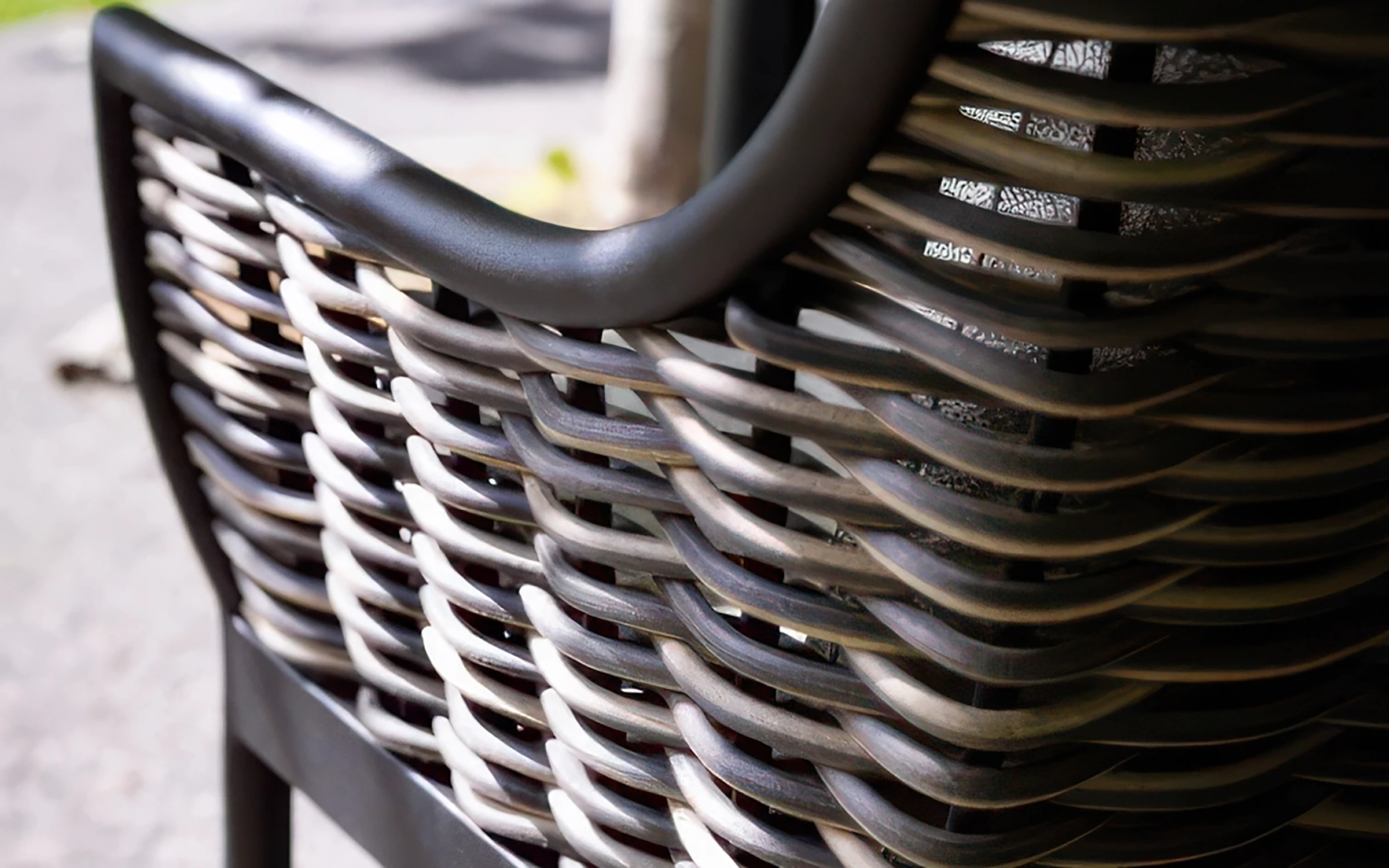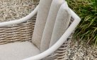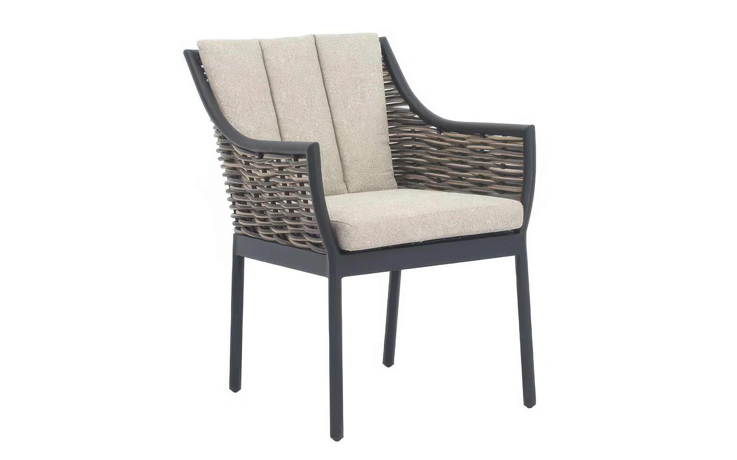 Konstrukcja z aluminium malowanego proszkowo – lekka, trwała i odporna na korozję. Oplot z technorattanu Willow Wave – syntetyczne włókno odporne na wilgoć, promieniowanie UV i zmienne warunki atmosferyczne. Blat z drewna teak – naturalny, odporny na warunki zewnętrzne, z czasem nabiera szlachetnej patyny. Poduszki z wypełnieniem Bee Wett – szybkoschnąca pianka o otwartej strukturze. Poszewki z tkaniny Olefin – odporne na zabrudzenia, pleśń i blaknięcie.