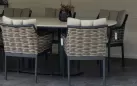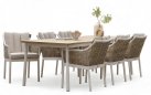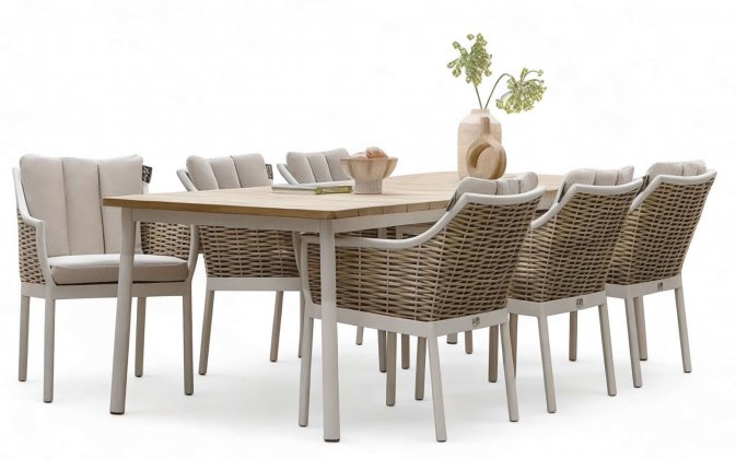 Zestaw ogrodowy MILOU to elegancki komplet jadalniany przeznaczony na taras lub do ogrodu. Składa się z sześciu krzeseł z technorattanu na aluminiowym stelażu oraz dużego stołu z blatem teakowym o długości 240 cm. Konstrukcja aluminiowa malowana proszkowo zapewnia trwałość i odporność na warunki atmosferyczne. Poduszki All Weather Bee Wett w kolorze piaskowym gwarantują komfort i szybkie schnięcie.