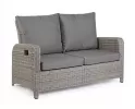 Sofa ogrodowa 2-osobowa na taras z pochylanymi oparciami. Kanapa wykonana z technorattanu szarego. Poduszki wodoodporne ze zdejmowanymi poszewkami z materiału Olefin.
