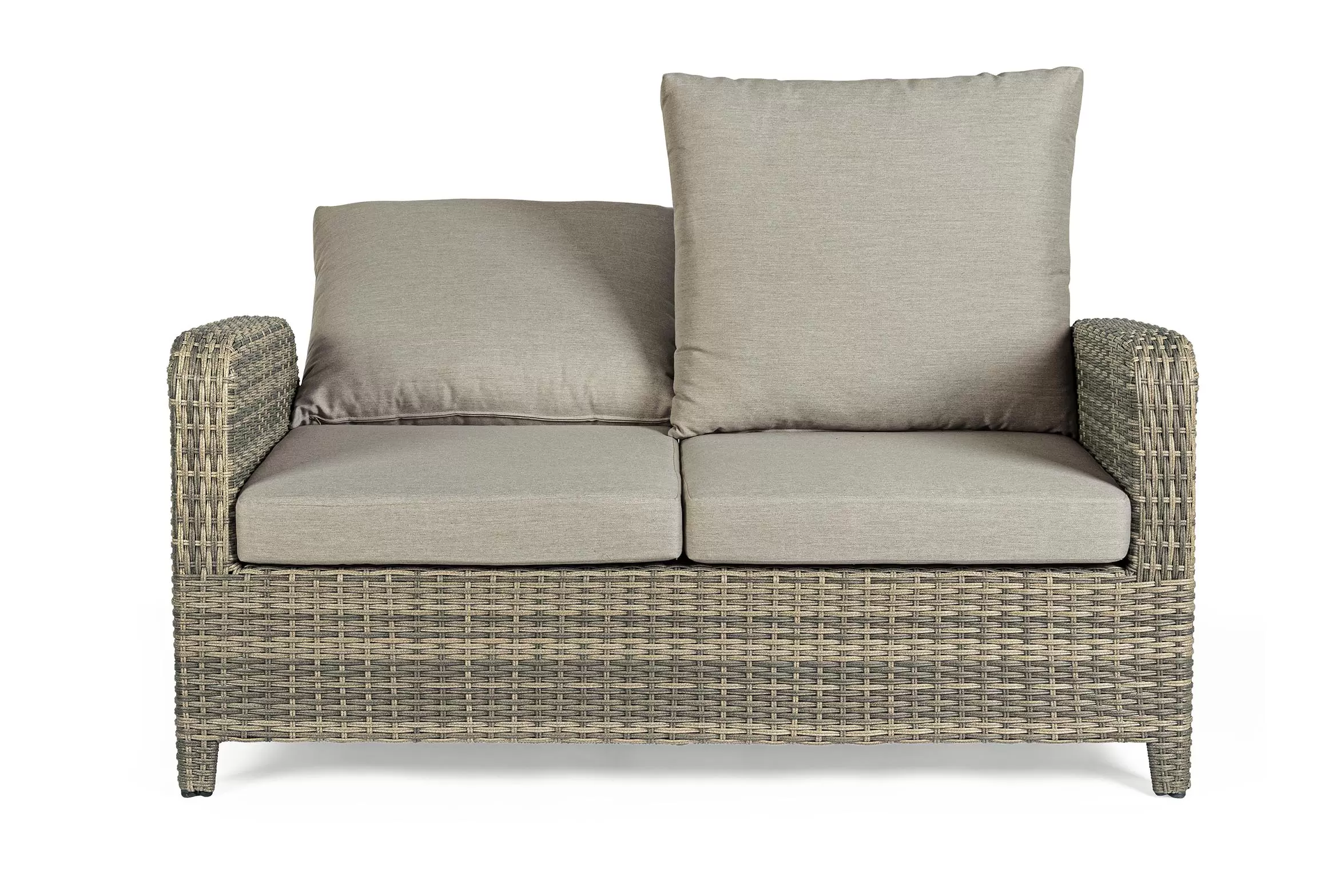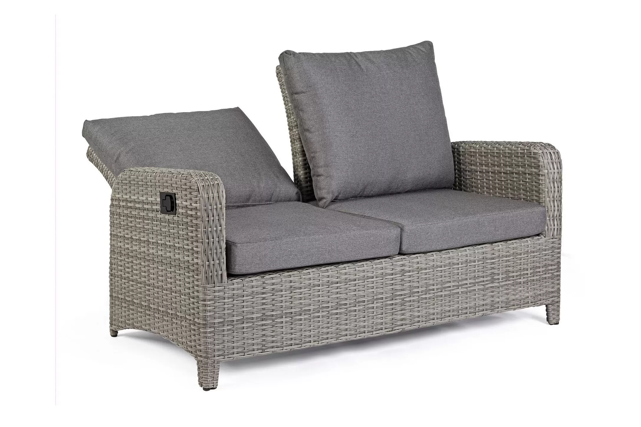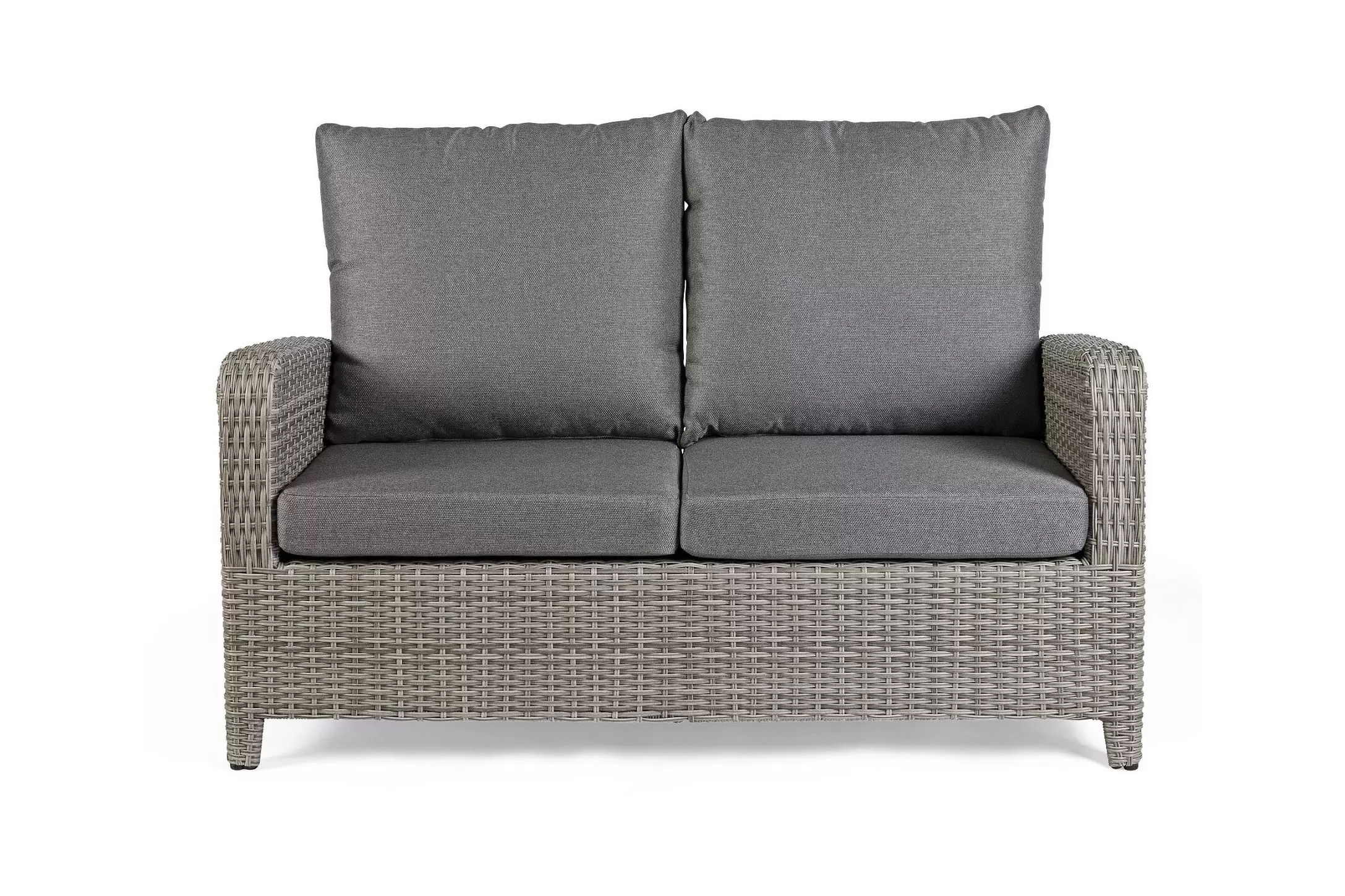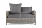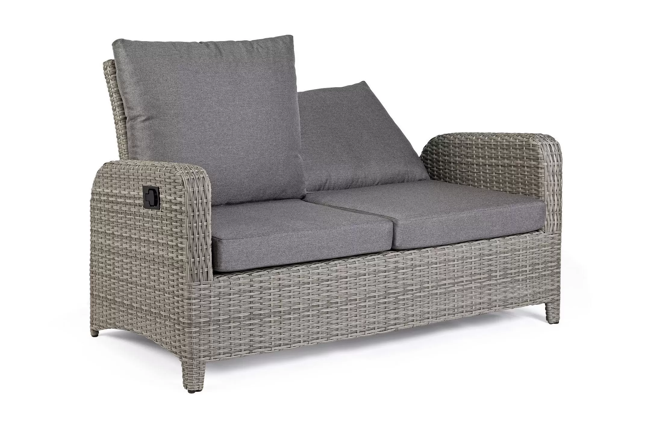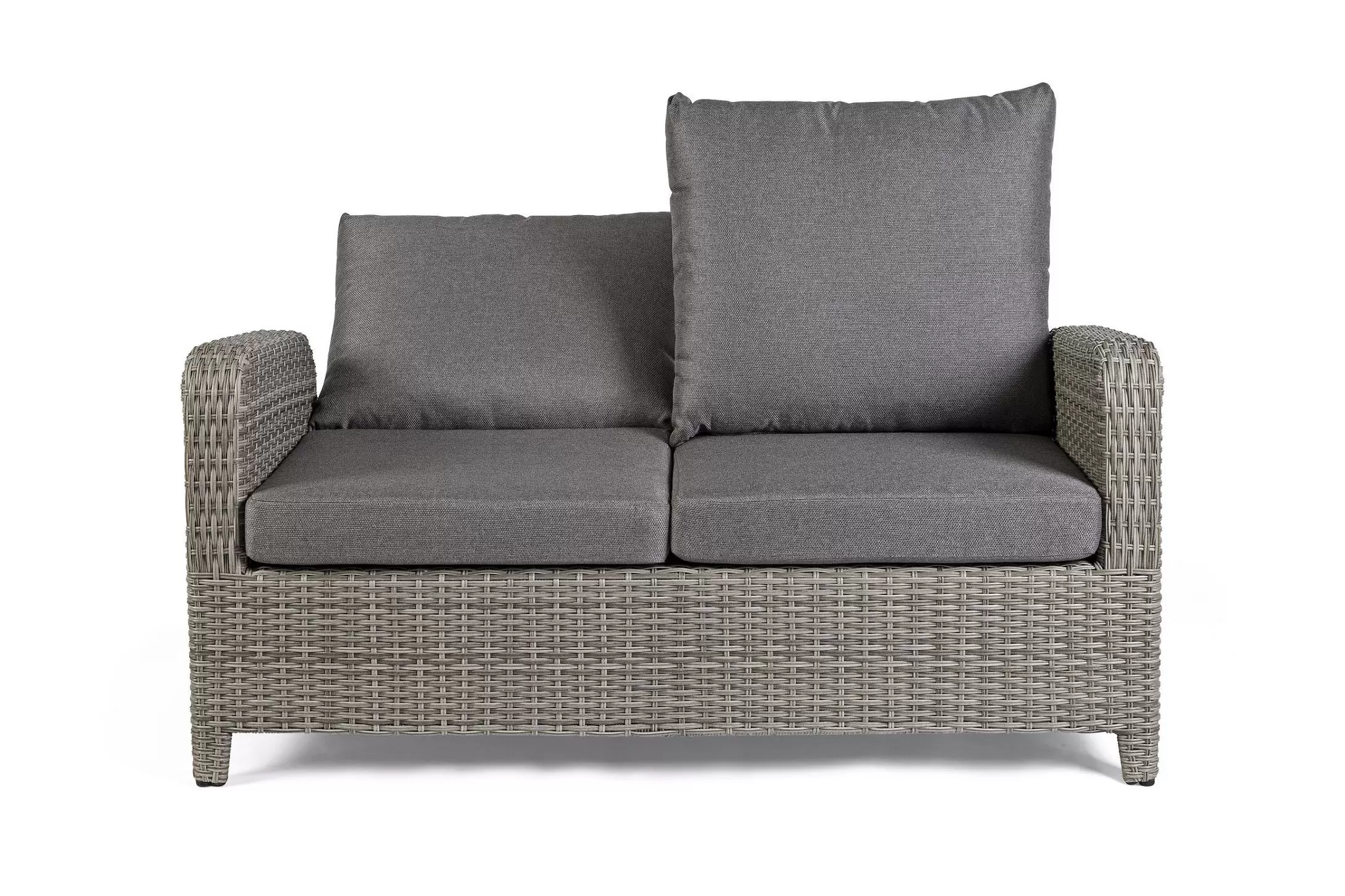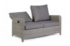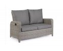 Sofa ogrodowa 2-osobowa na taras z pochylanymi oparciami. Kanapa wykonana z technorattanu szarego. Poduszki wodoodporne ze zdejmowanymi poszewkami z materiału Olefin.