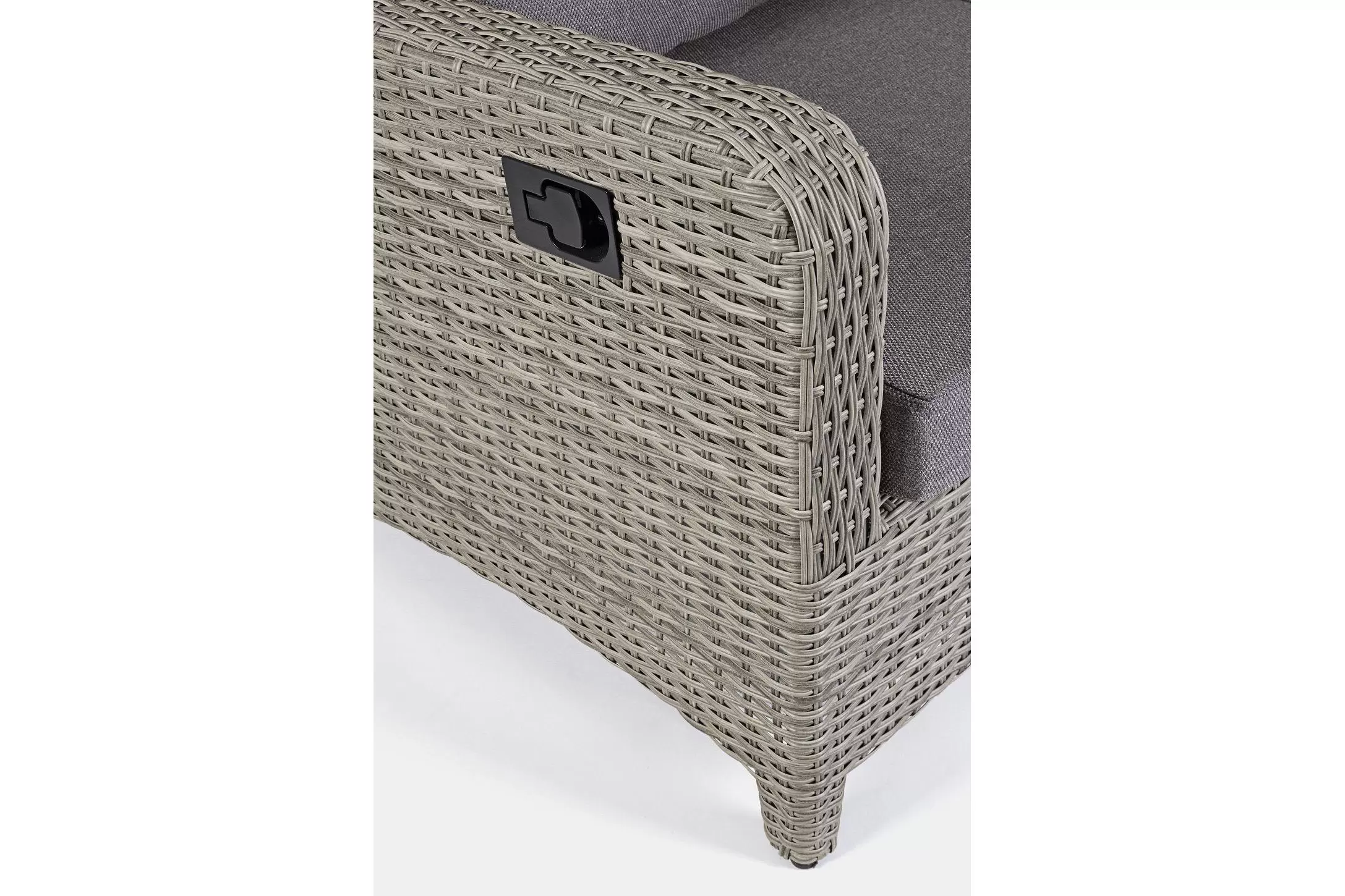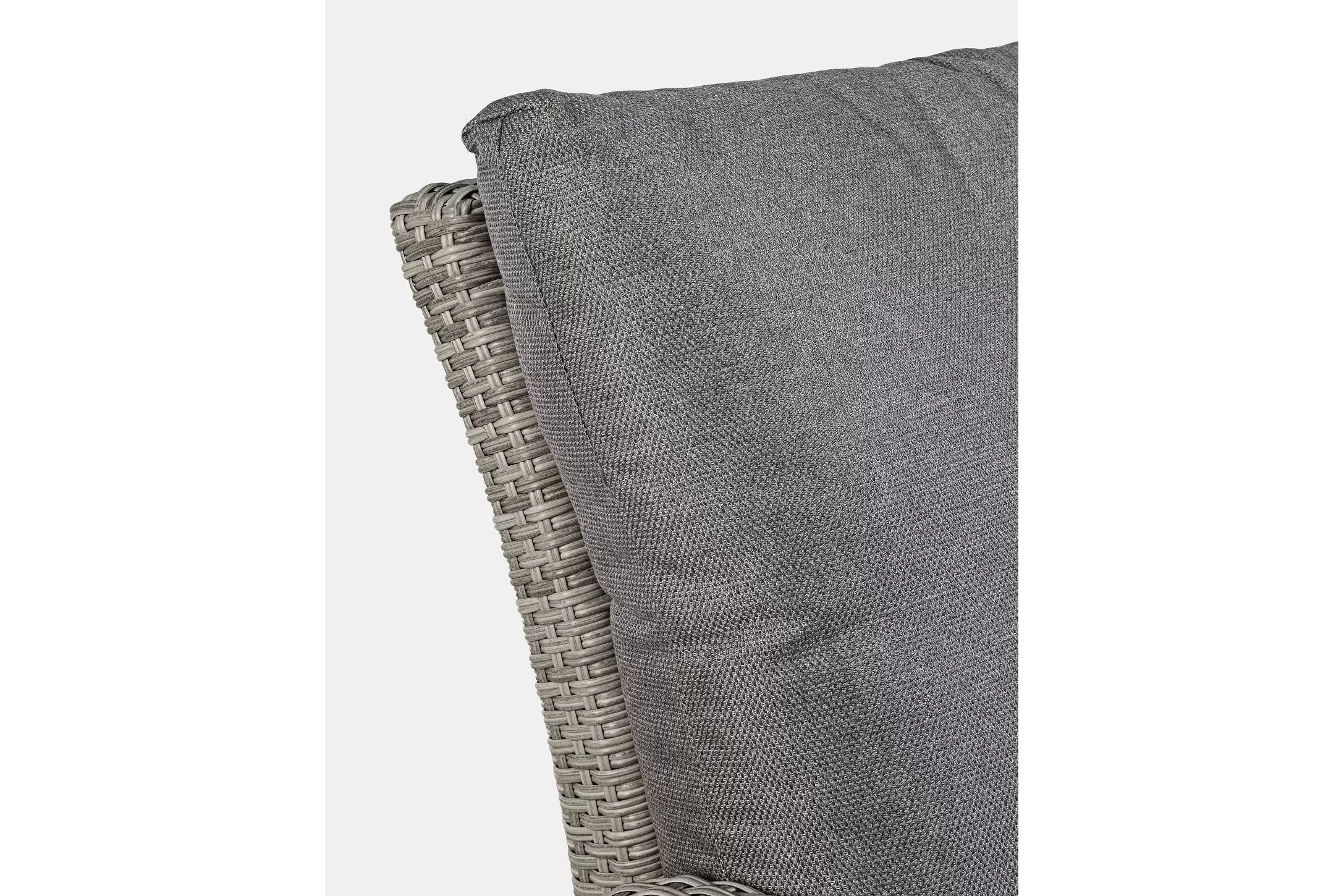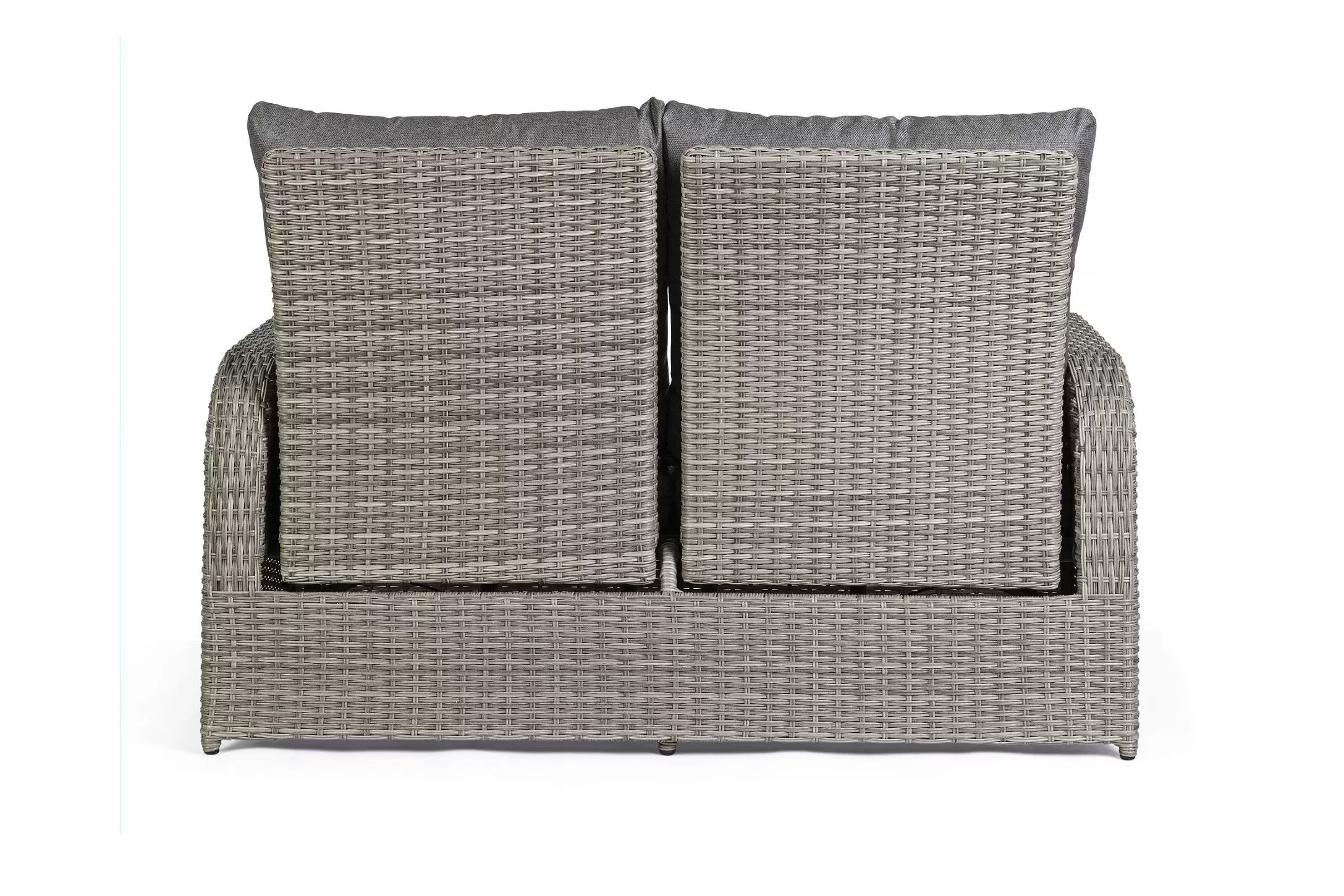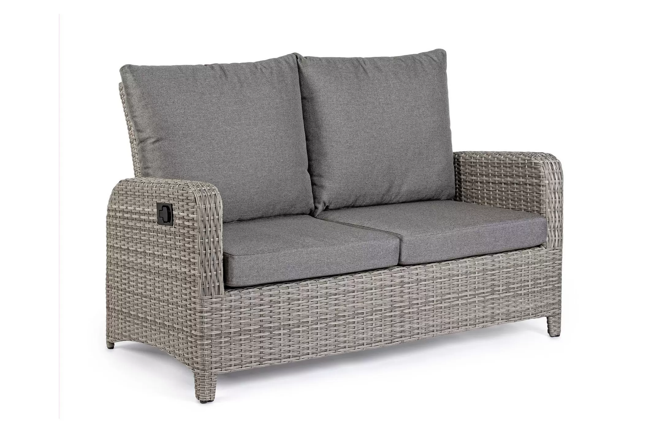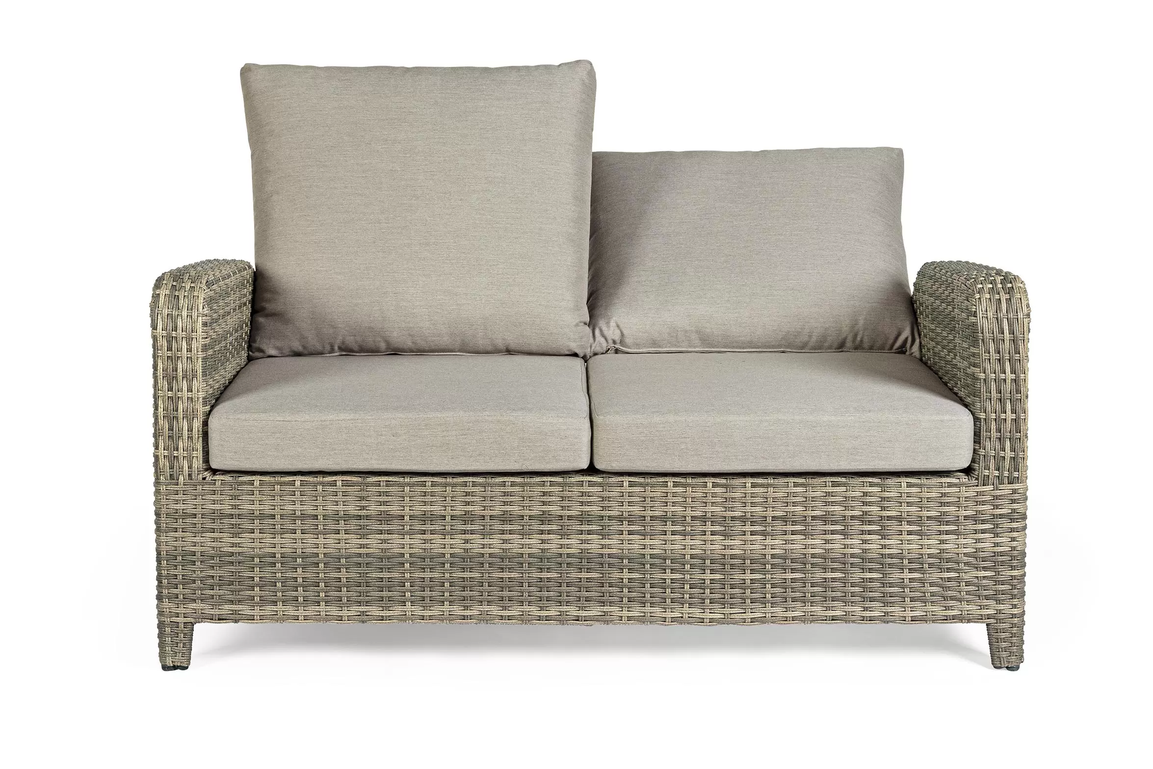 Sofa ogrodowa 2-osobowa na taras z pochylanymi oparciami. Kanapa wykonana z technorattanu szarego. Poduszki wodoodporne ze zdejmowanymi poszewkami z materiału Olefin.