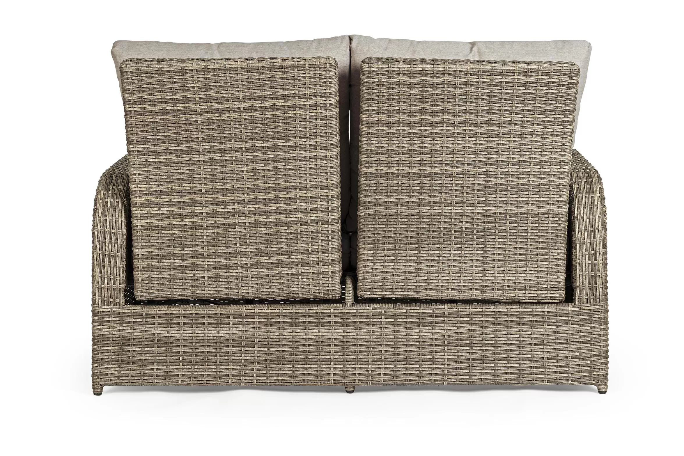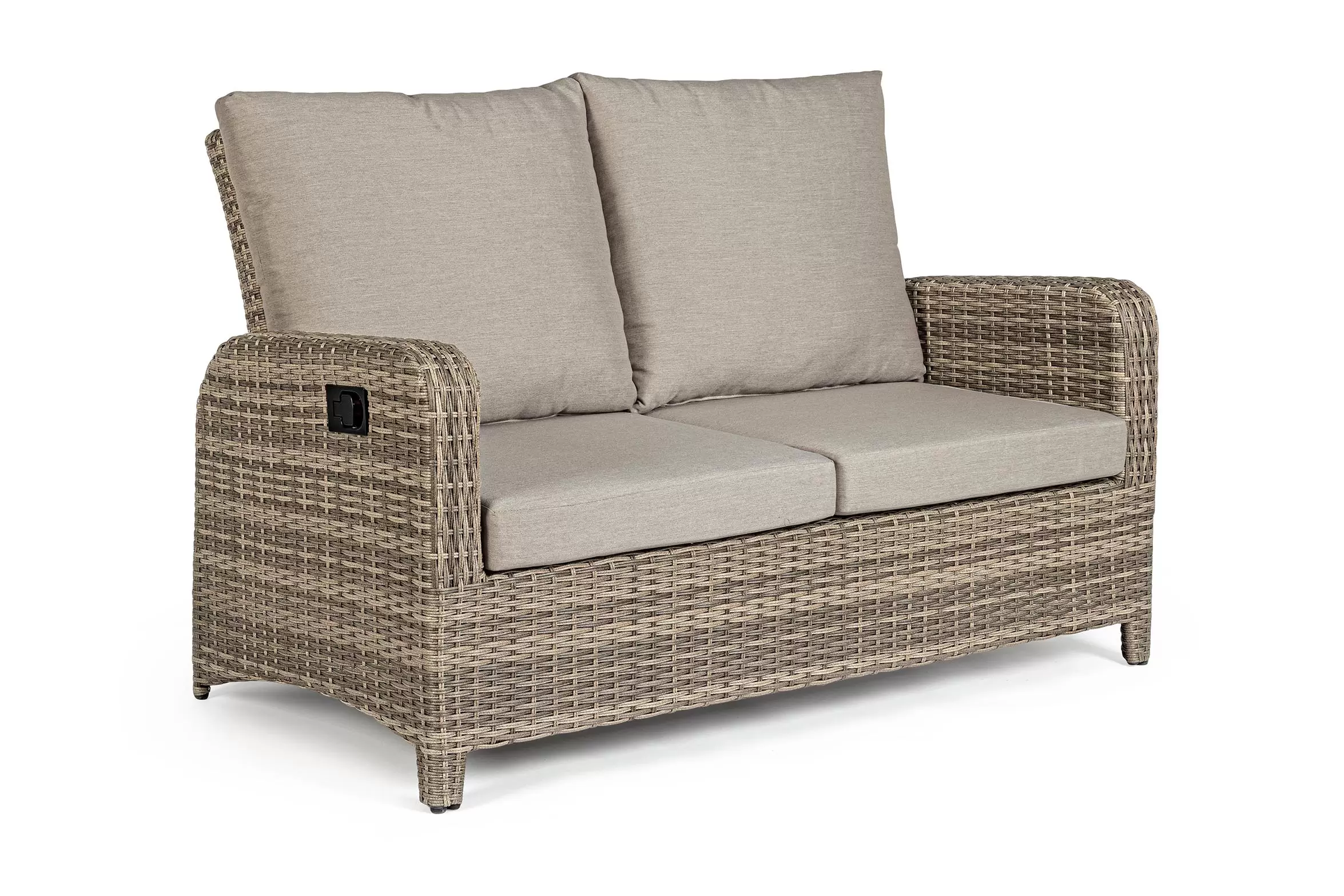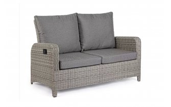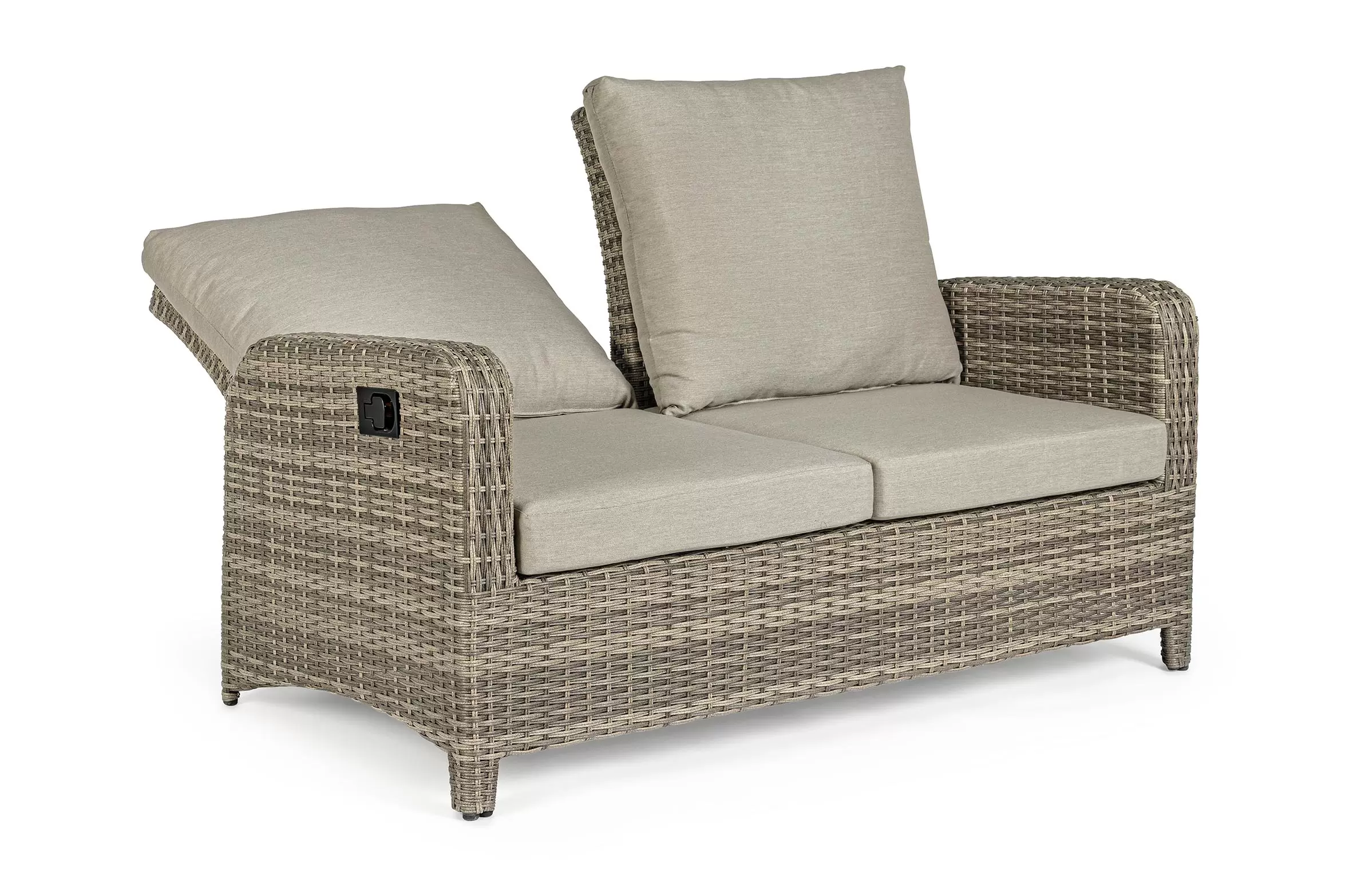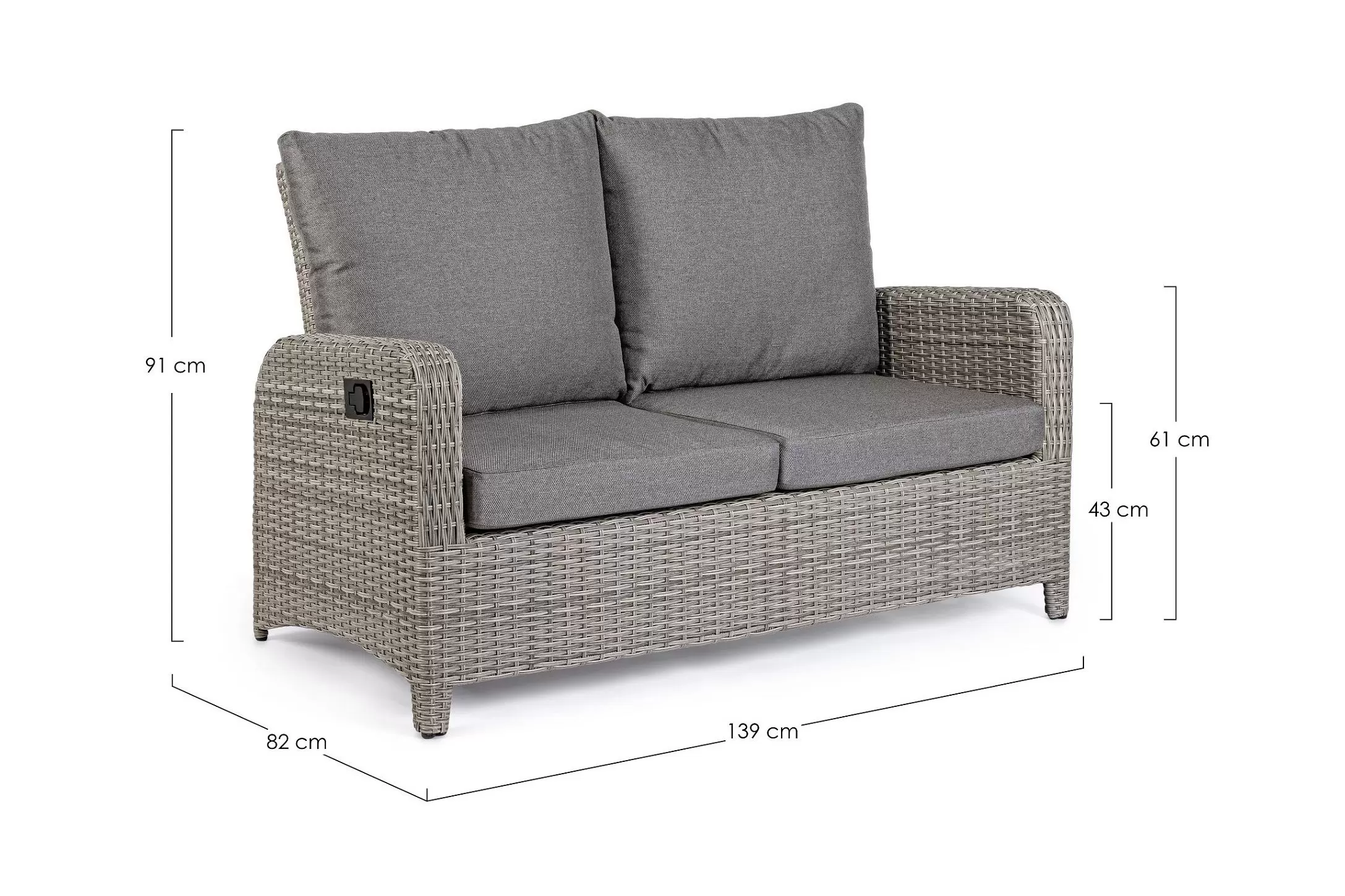 Sofa ogrodowa 2-osobowa na taras z pochylanymi oparciami. Kanapa wykonana z technorattanu szarego. Poduszki wodoodporne ze zdejmowanymi poszewkami z materiału Olefin.