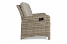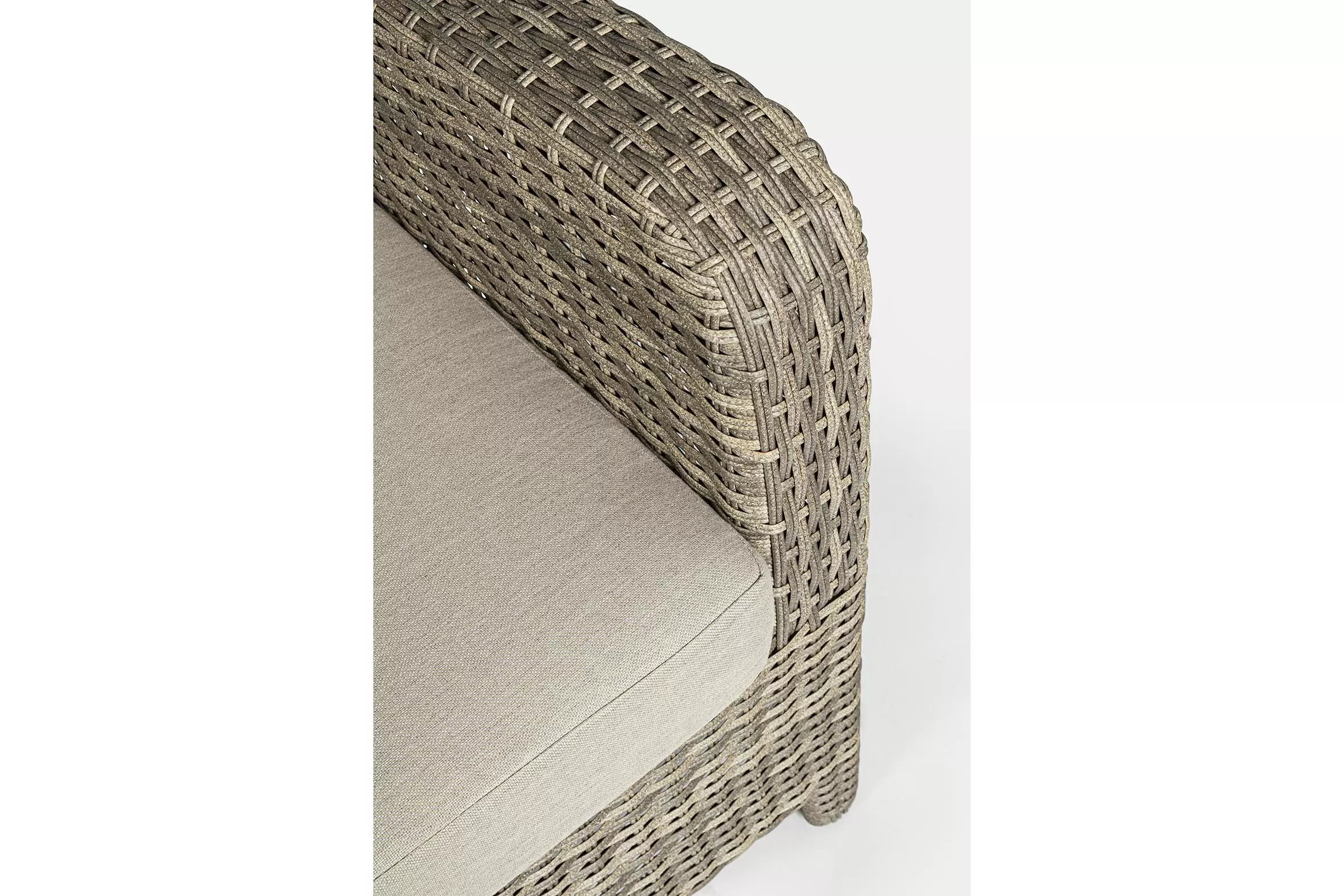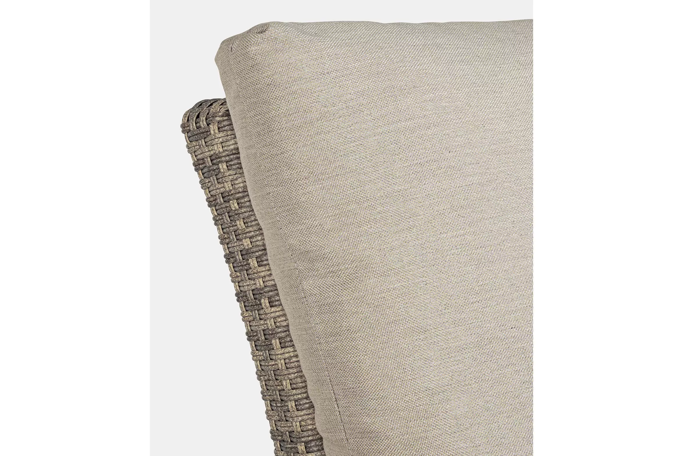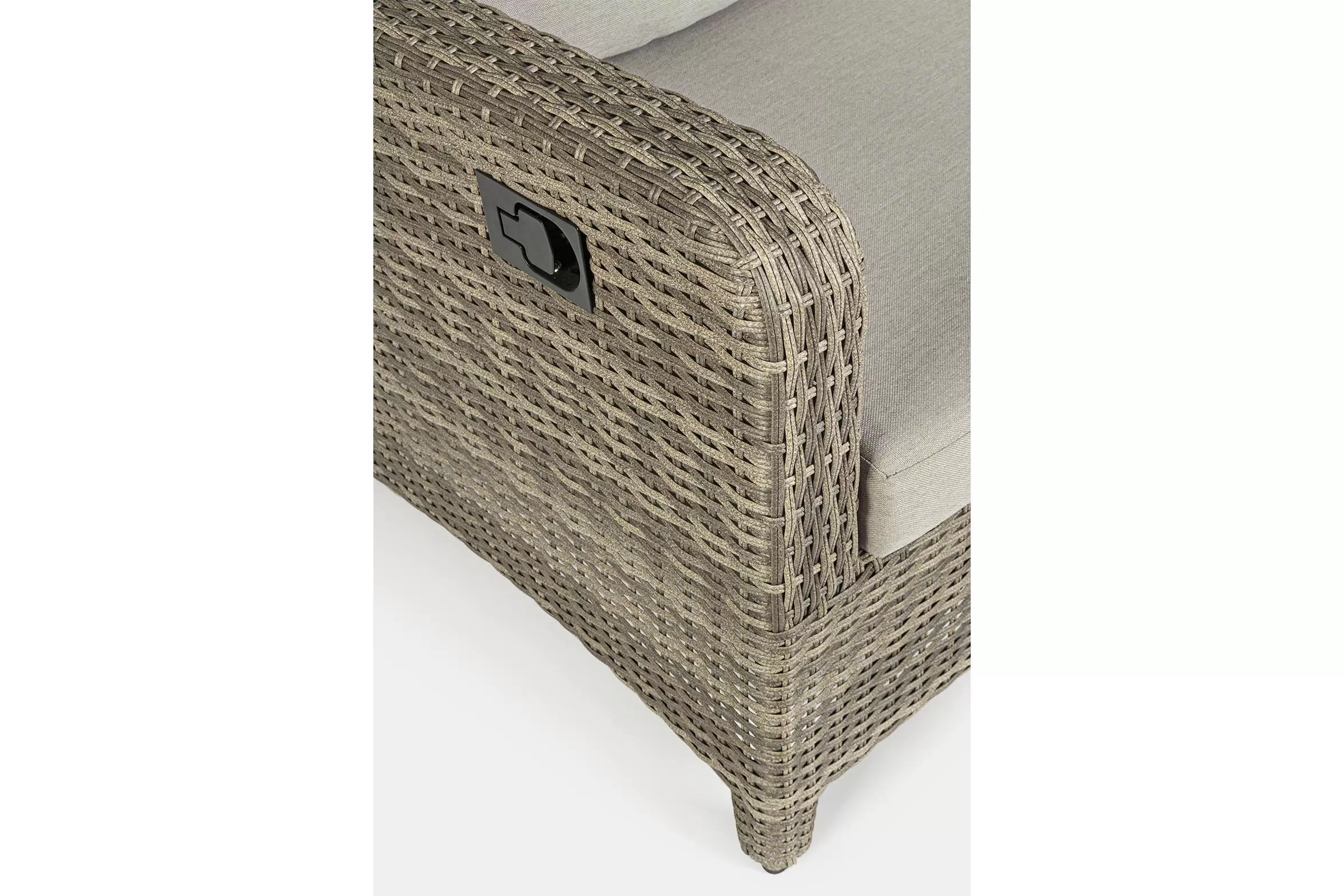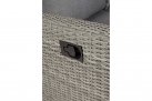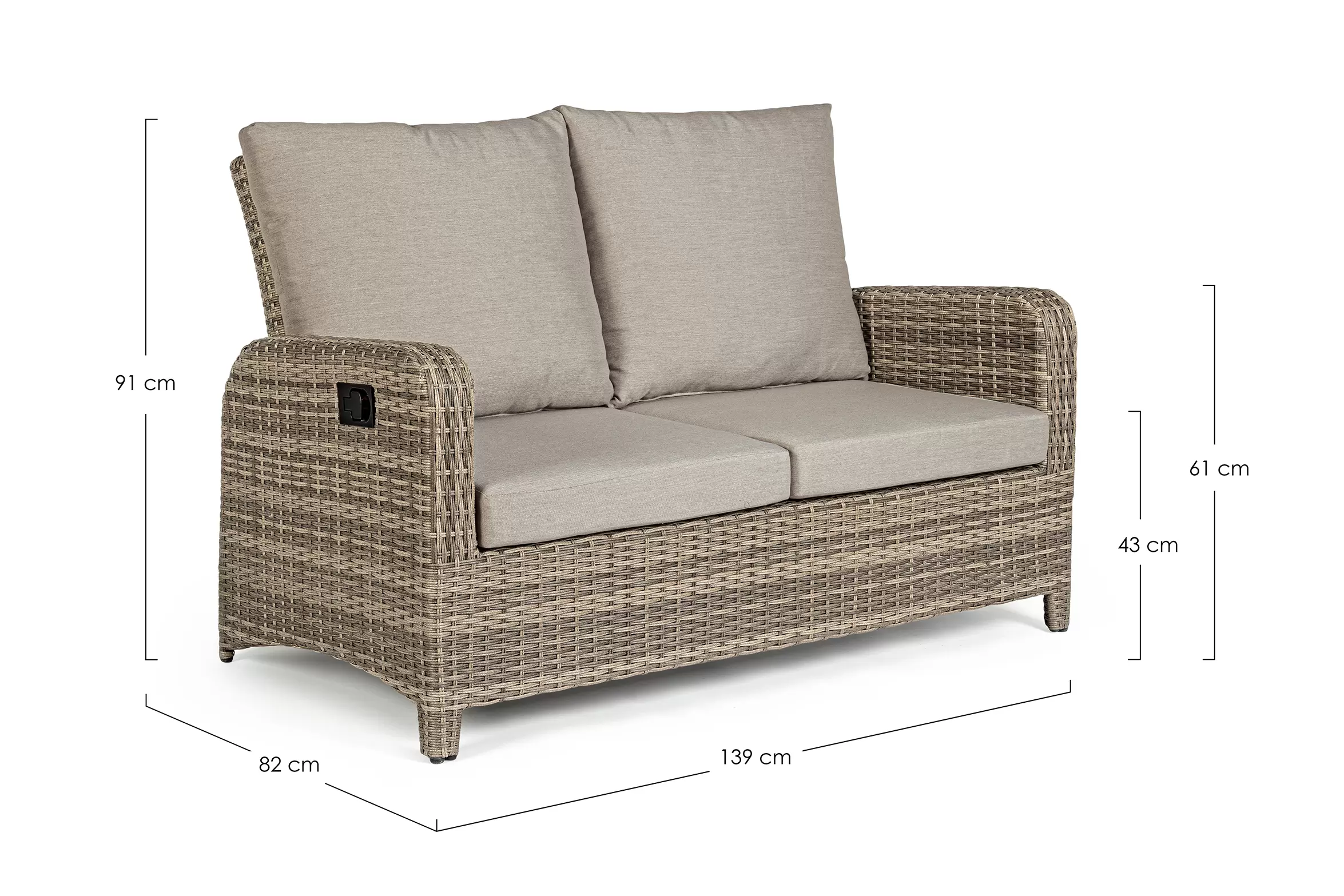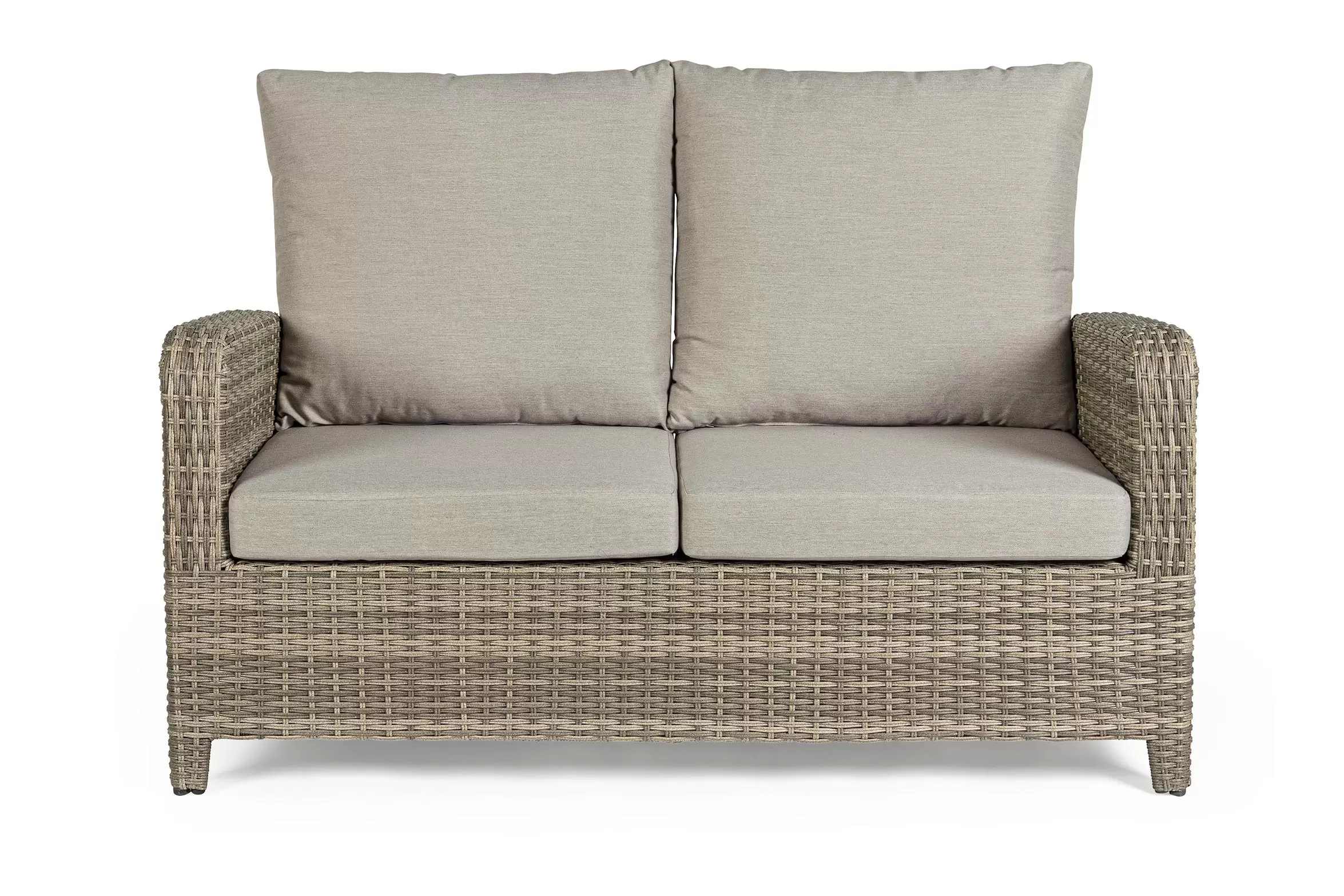 Sofa ogrodowa 2-osobowa na taras z pochylanymi oparciami. Kanapa wykonana z technorattanu szarego. Poduszki wodoodporne ze zdejmowanymi poszewkami z materiału Olefin.