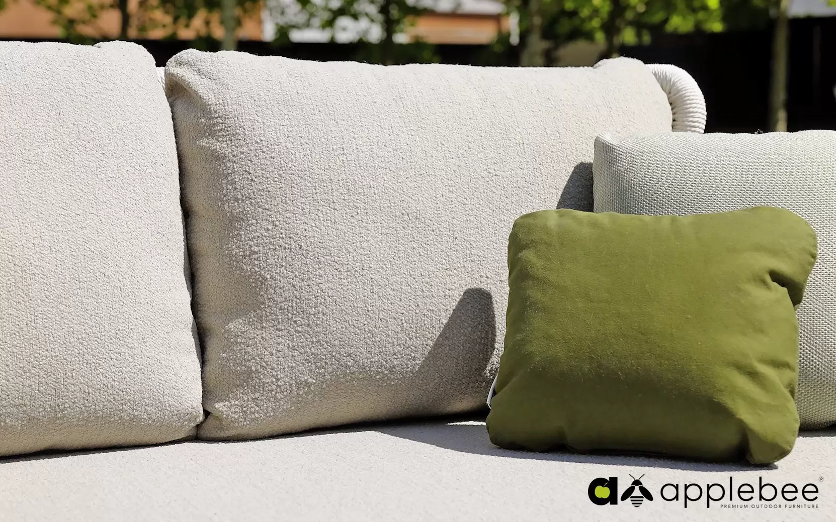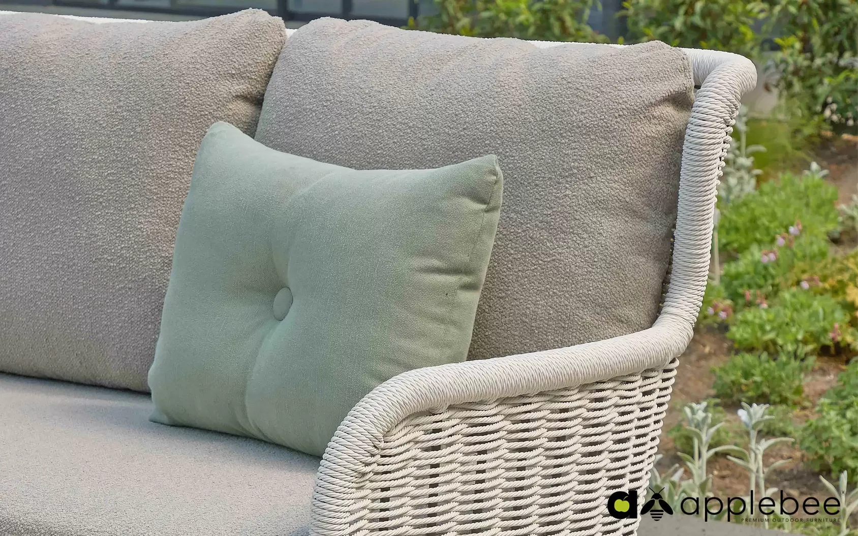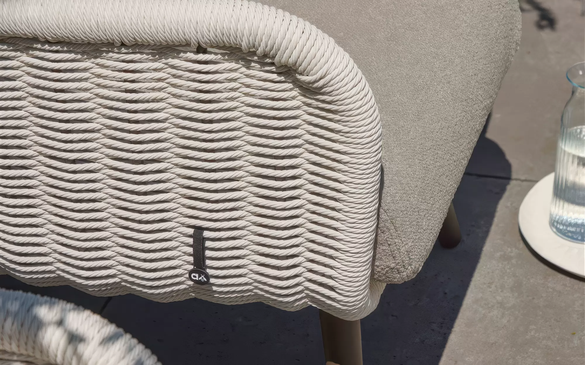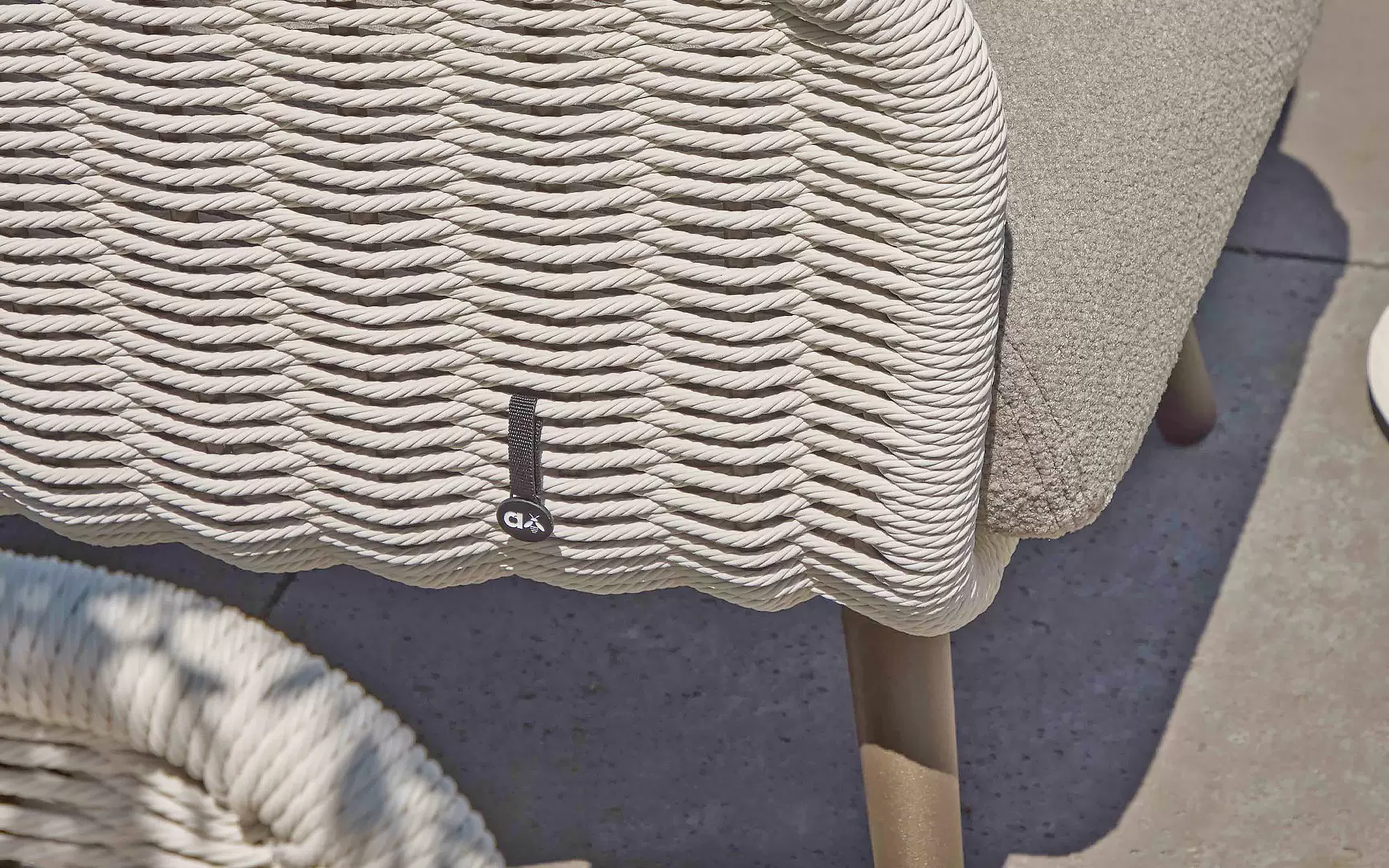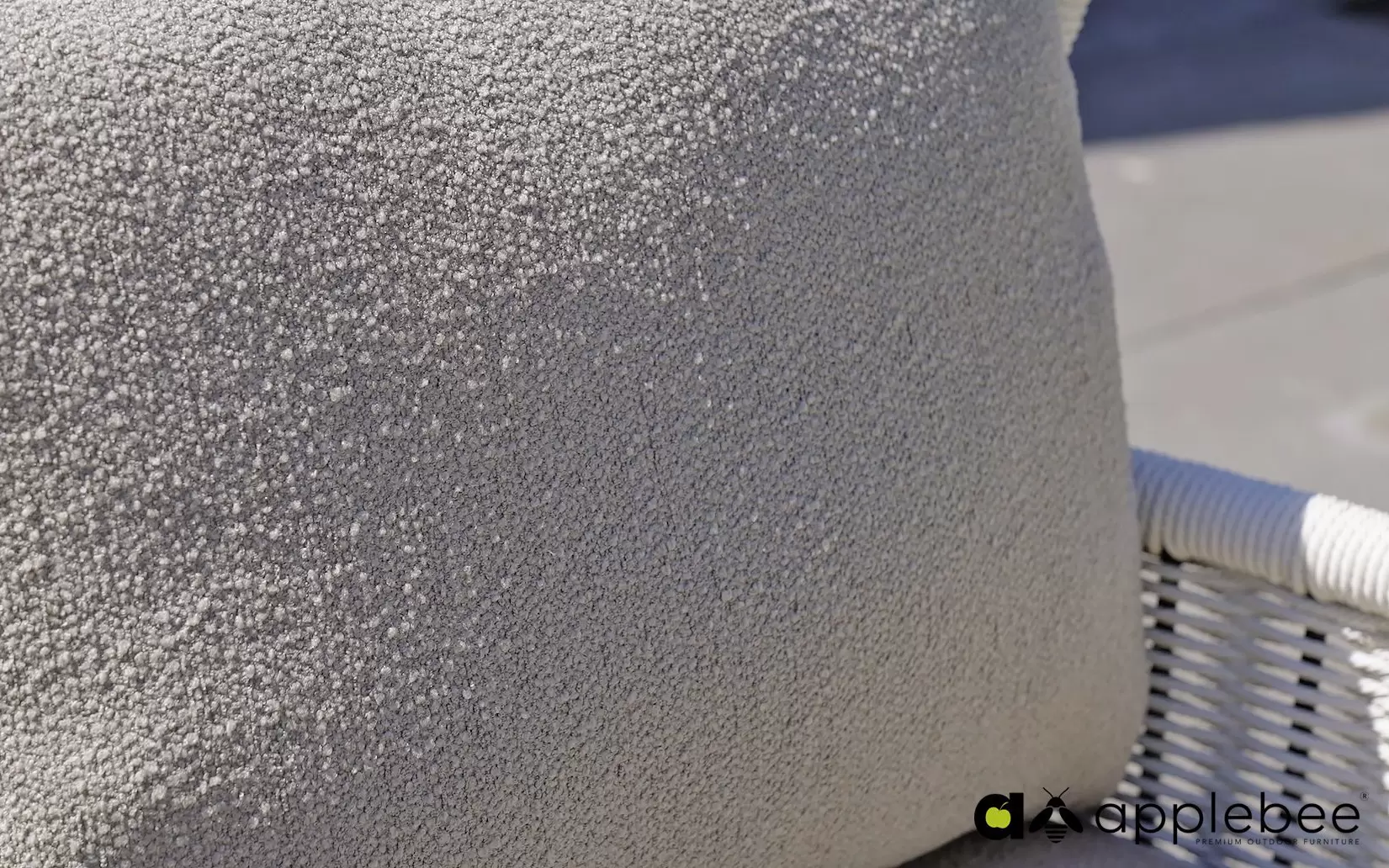 Dla maksymalnego komfortu zastosowano grube poduszki w ciepłym odcieniu taupe, wykonane z miękkiej w dotyku tkaniny bouclé. Dzięki innowacyjnej technologii Bee Wett®, poduszki są całkowicie odporne na warunki atmosferyczne, doskonale odprowadzają wodę i schną w mgnieniu oka, nie tracąc przy tym na wygodzie.