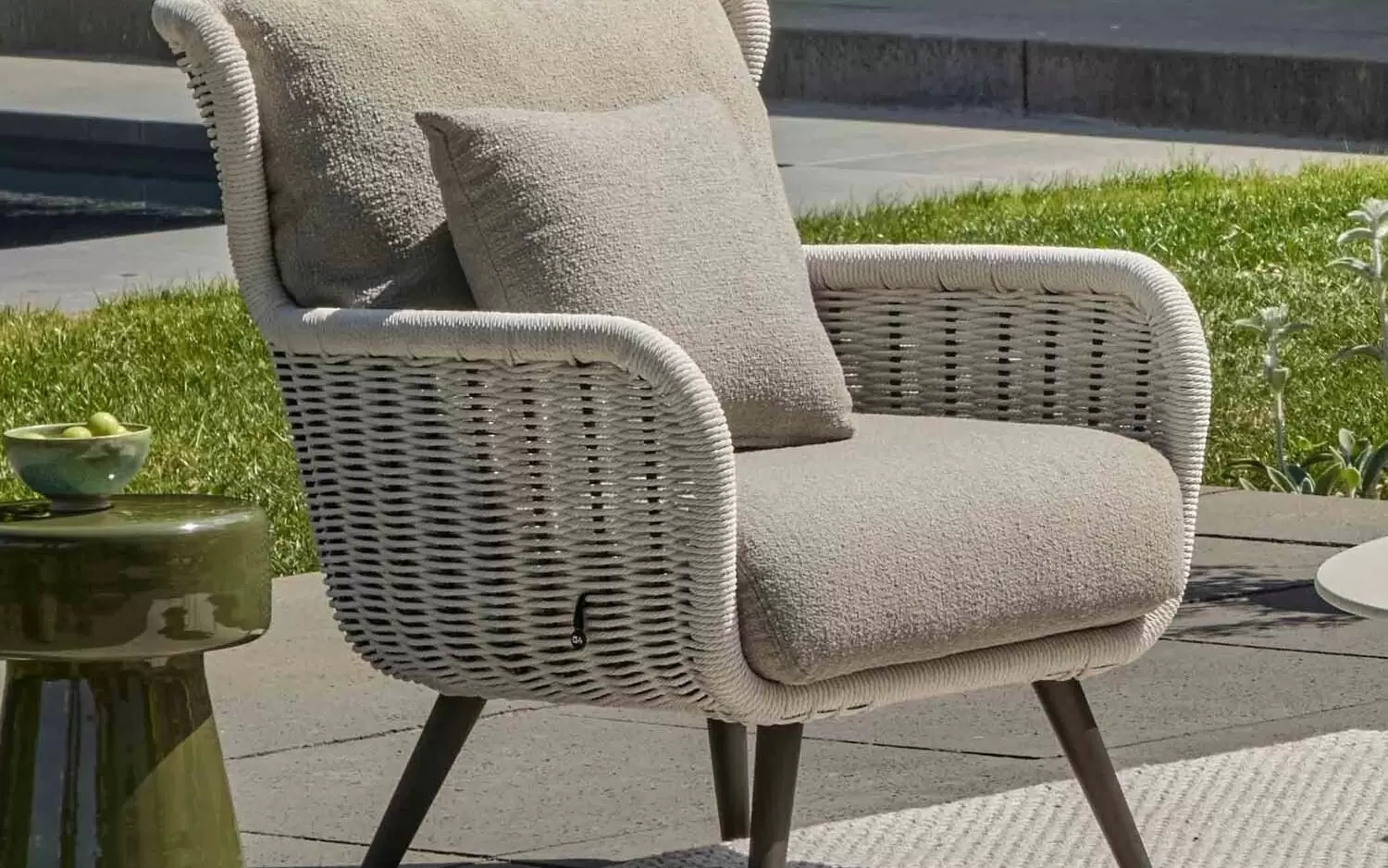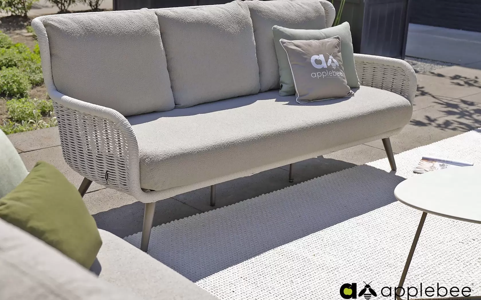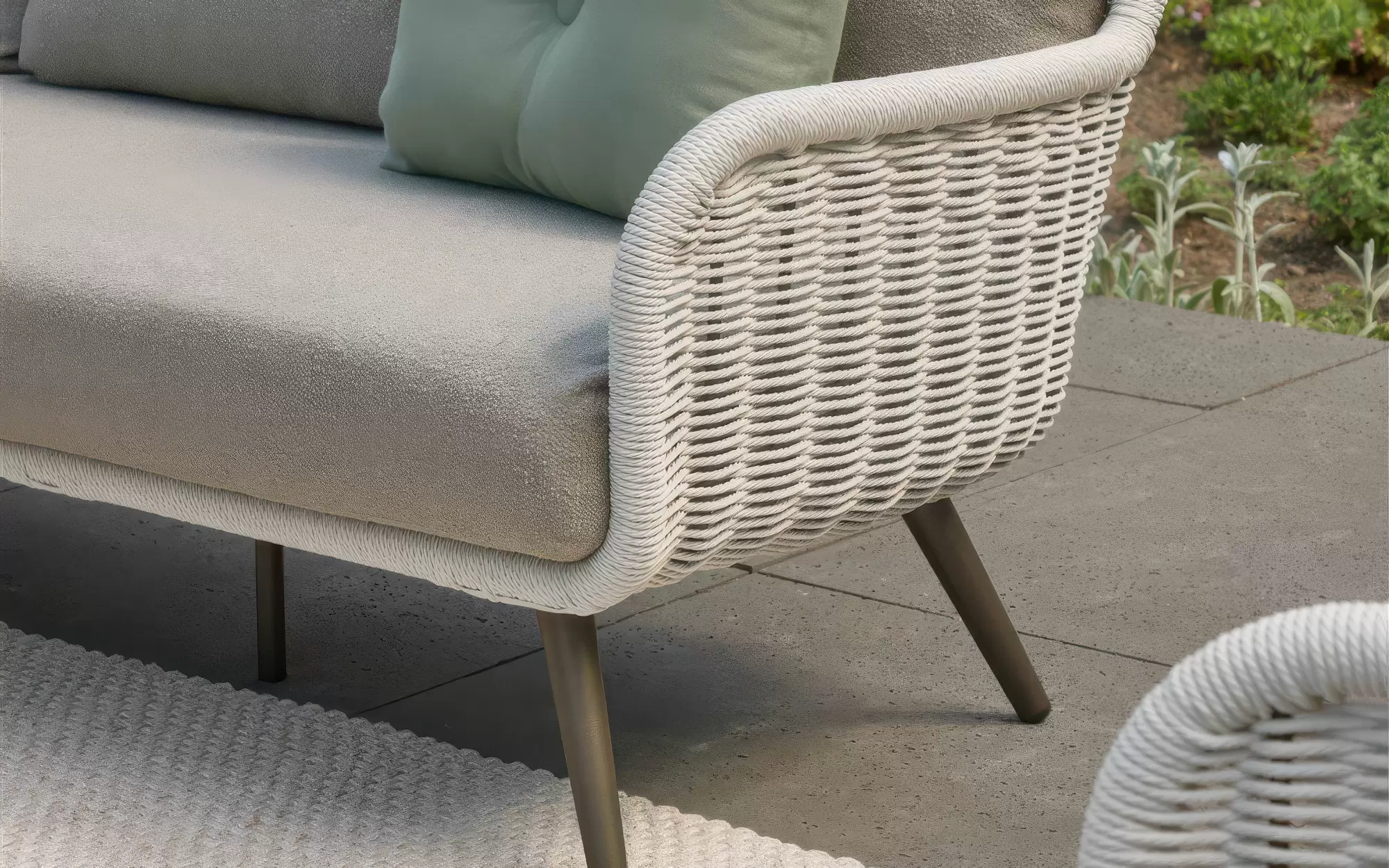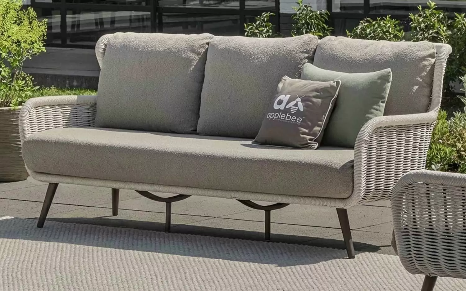 Dla maksymalnego komfortu zastosowano grube poduszki w ciepłym odcieniu taupe, wykonane z miękkiej w dotyku tkaniny bouclé. Dzięki innowacyjnej technologii Bee Wett®, poduszki są całkowicie odporne na warunki atmosferyczne, doskonale odprowadzają wodę i schną w mgnieniu oka, nie tracąc przy tym na wygodzie.