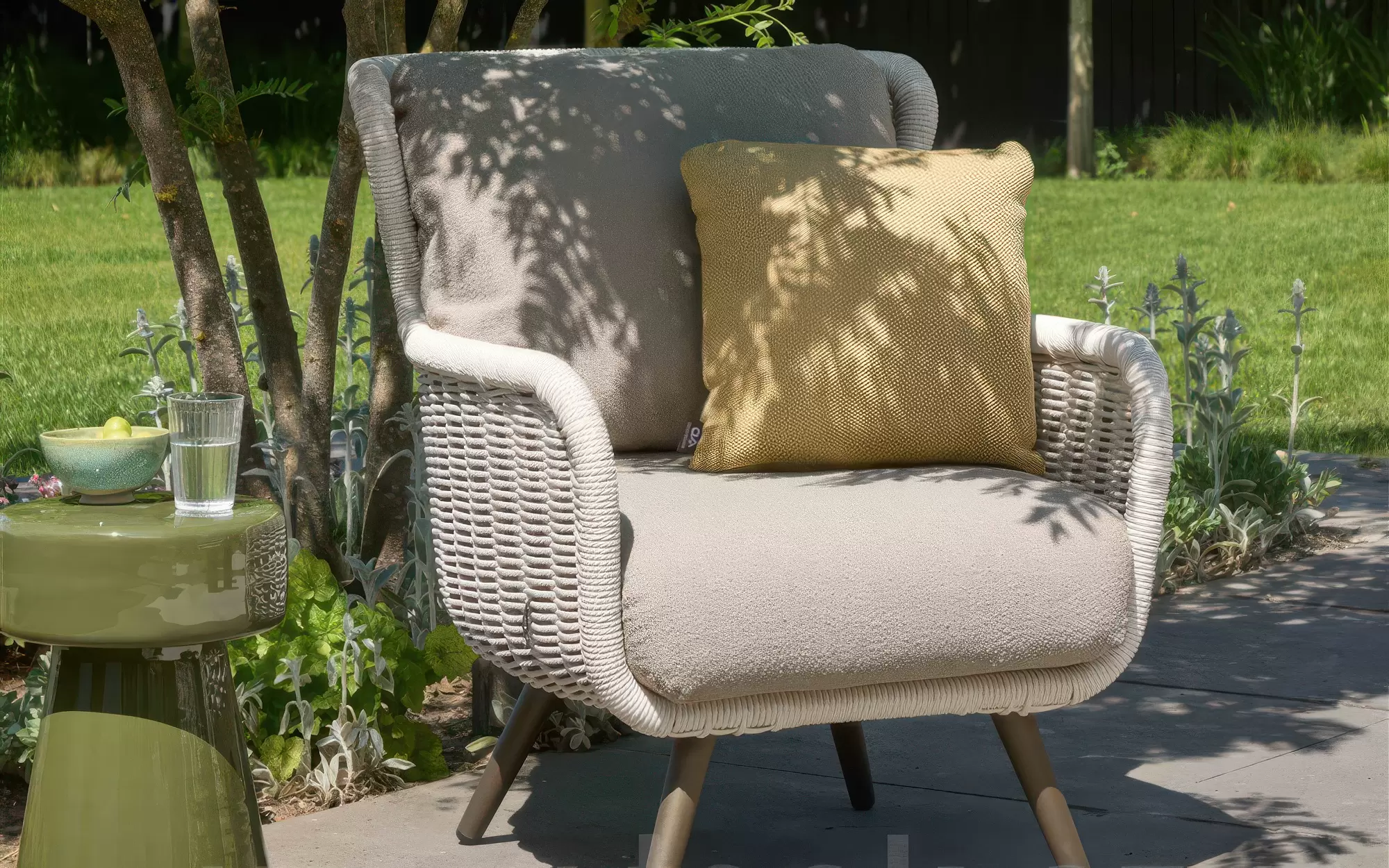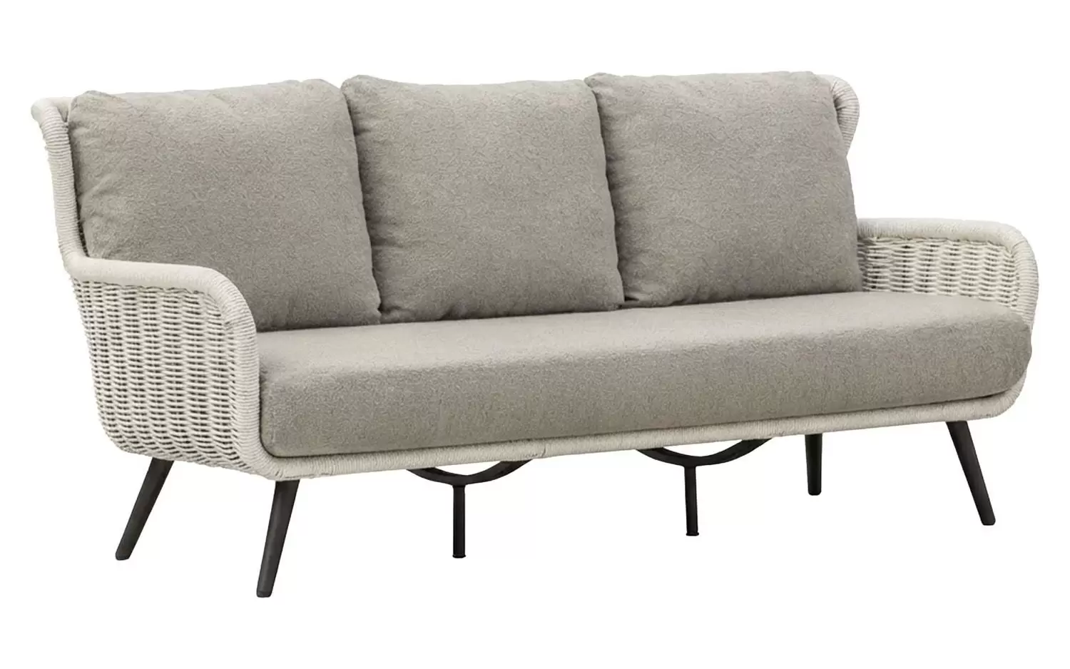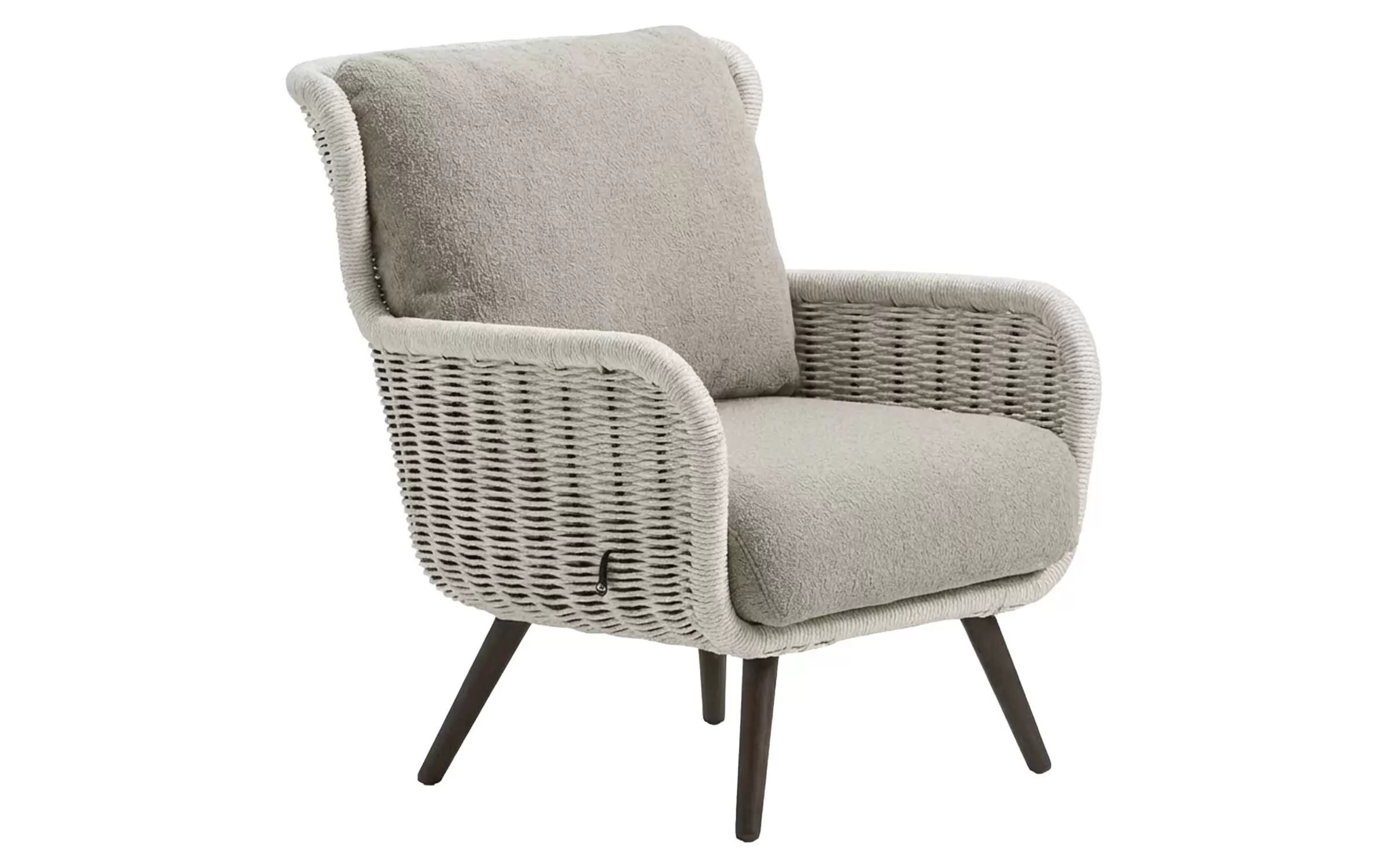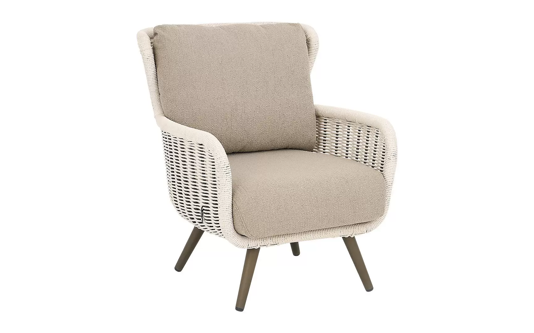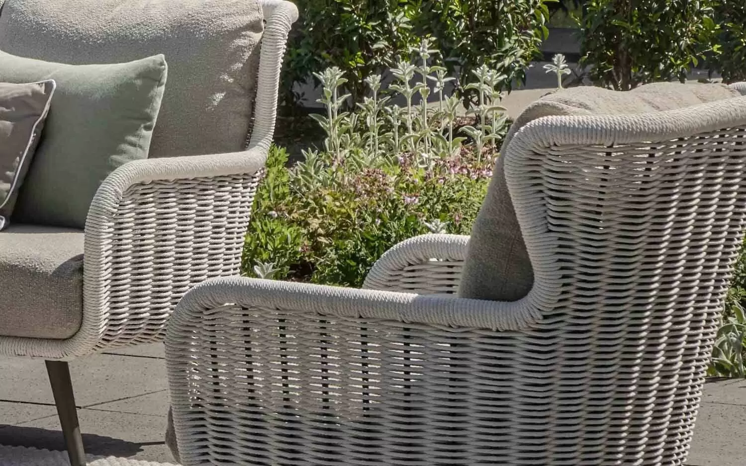 Dla maksymalnego komfortu zastosowano grube poduszki w ciepłym odcieniu taupe, wykonane z miękkiej w dotyku tkaniny bouclé. Dzięki innowacyjnej technologii Bee Wett®, poduszki są całkowicie odporne na warunki atmosferyczne, doskonale odprowadzają wodę i schną w mgnieniu oka, nie tracąc przy tym na wygodzie.