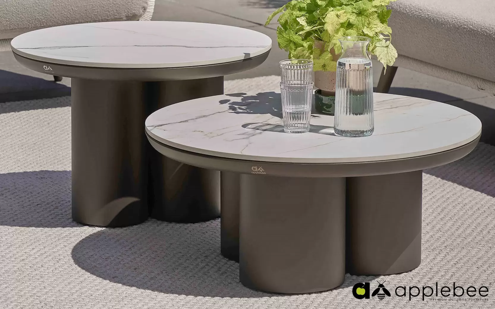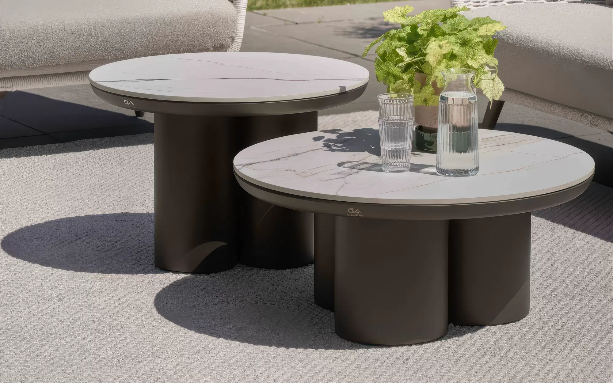 Całość dopełniają dwa stoliki kawowe Tonga o zróżnicowanych wymiarach. Ich blaty z innowacyjnego spieku kwarcowego (Sintered Stone) są nie tylko niezwykle eleganckie, ale również wysoce odporne na zarysowania, plamy i trudne warunki zewnętrzne.