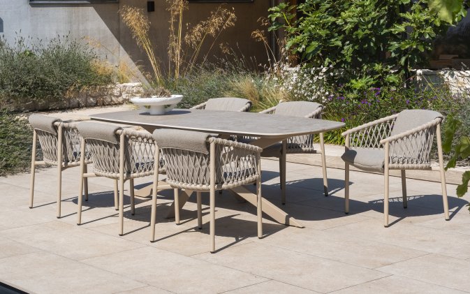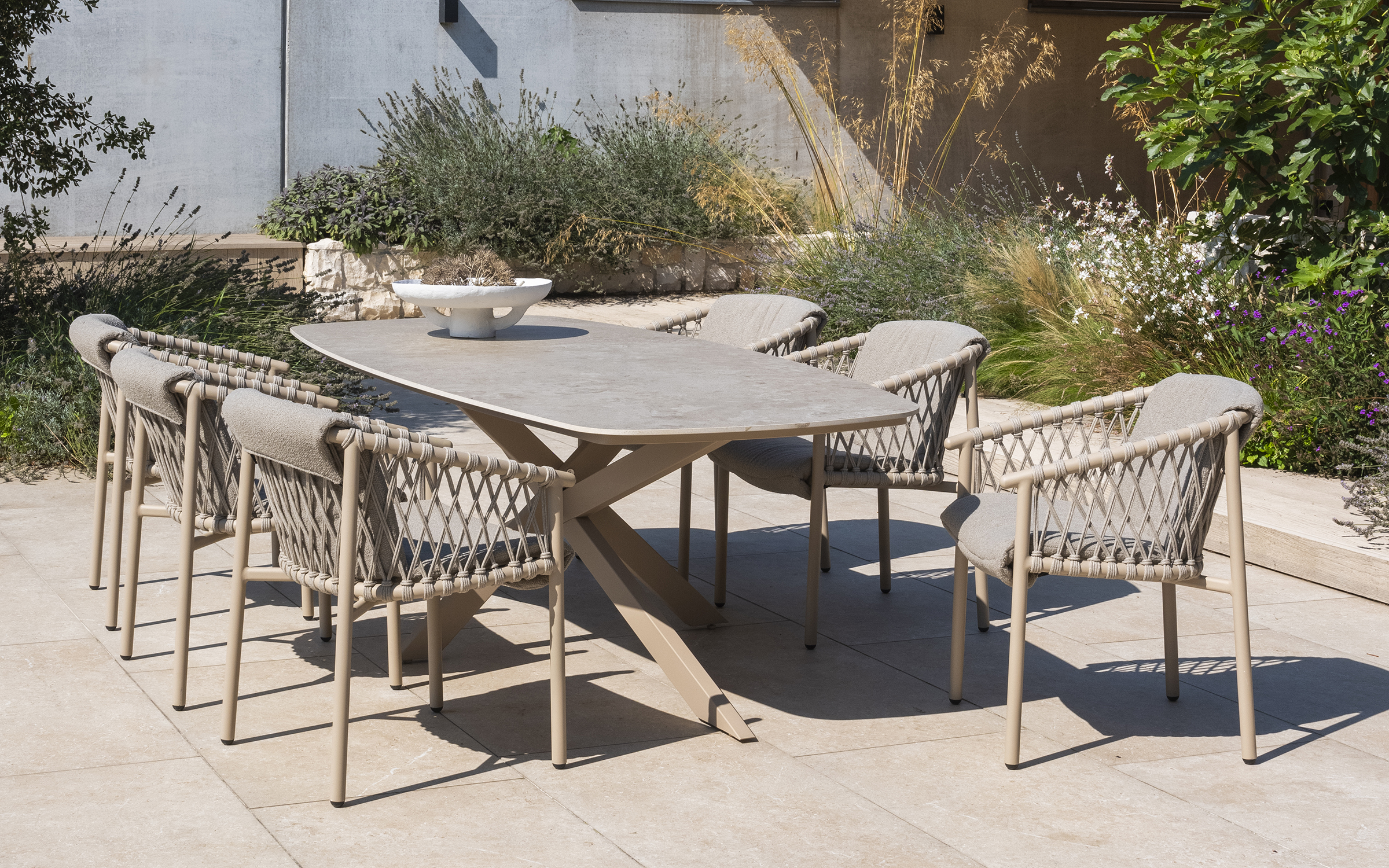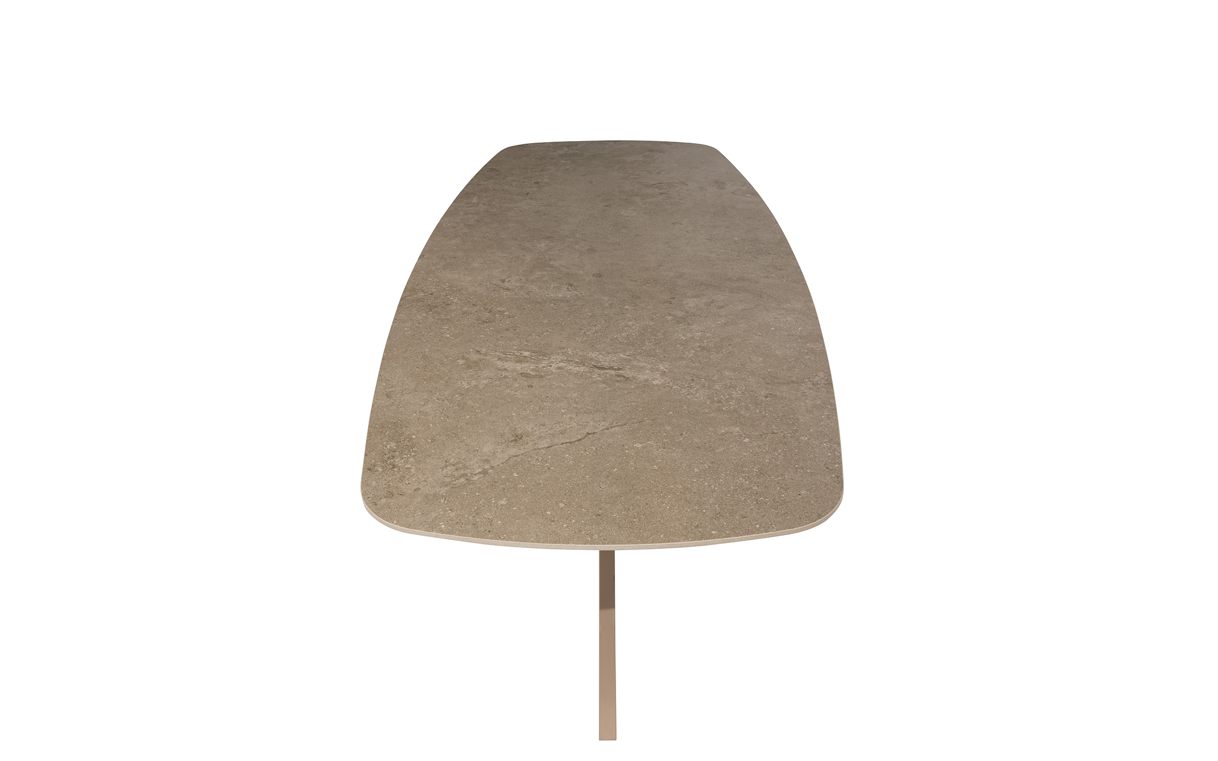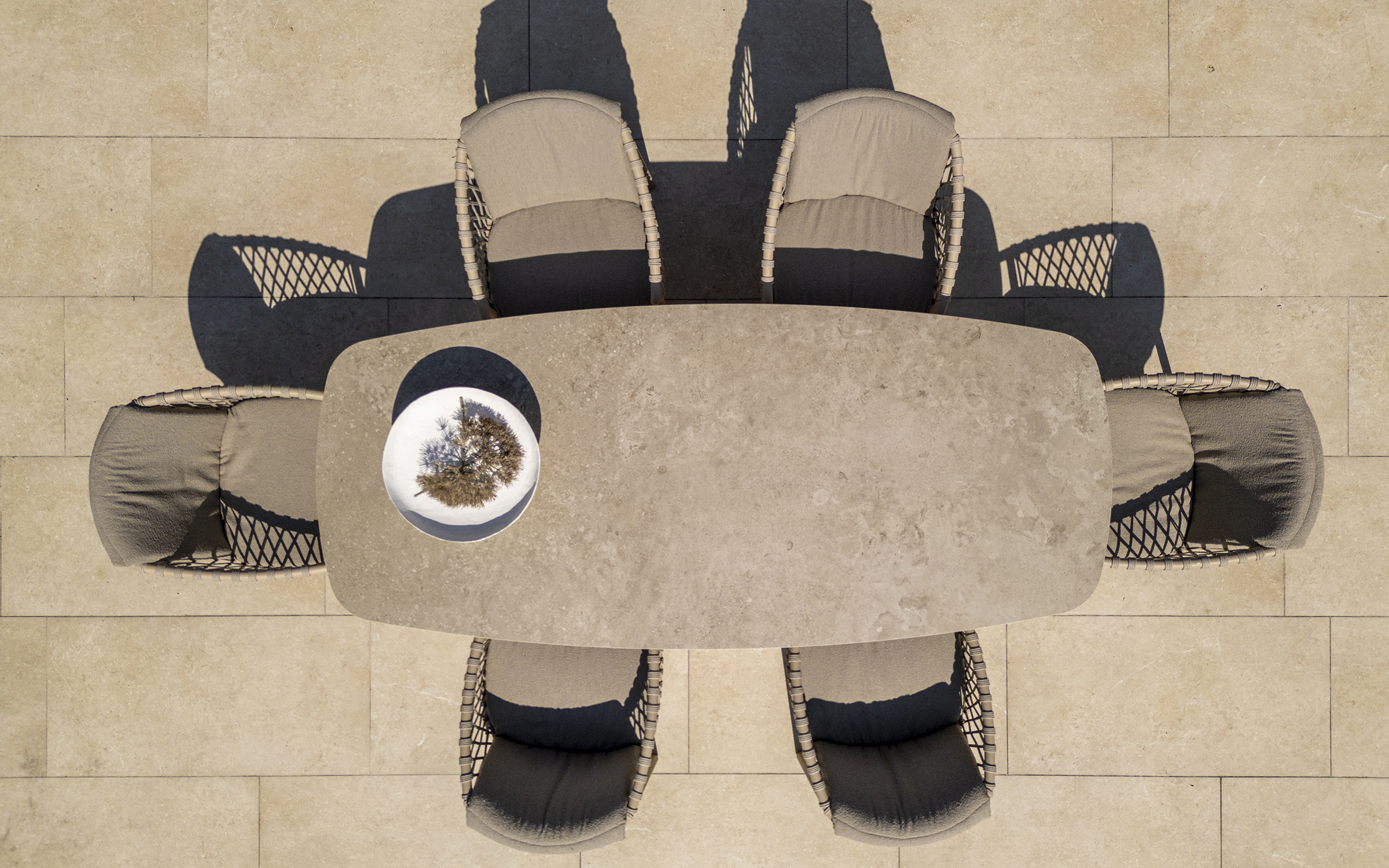 Stół Prado od 4 Seasons outdoor nie tylko wygląda nowocześnie, ale jest również niezwykle oryginalny ze względu na beczkowaty kształt blatu.