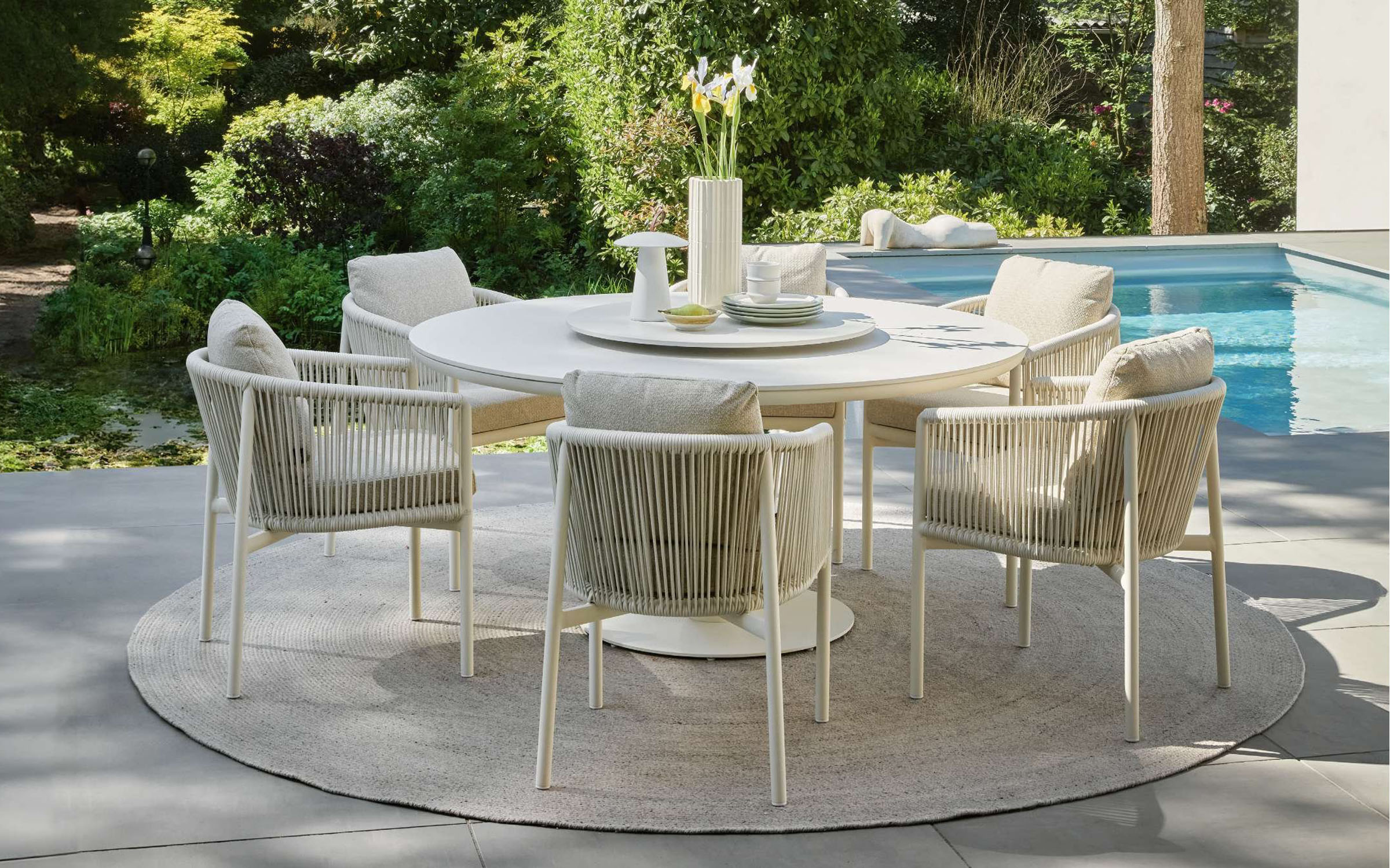 Zestaw stołowy Melville to elegancka propozycja marki AppleBee do ogrodu, na taras lub patio. Składa się z okrągłego stołu o średnicy 140 cm oraz wygodnych krzeseł z aluminiową konstrukcją i poduszkami All Weather Bee Wett. Dostępny w dwóch wersjach kolorystycznych: jasny beż oraz taupe. Blat stołu wykonany z kamienia spiekanego, odporny na warunki atmosferyczne i łatwy w pielęgnacji.